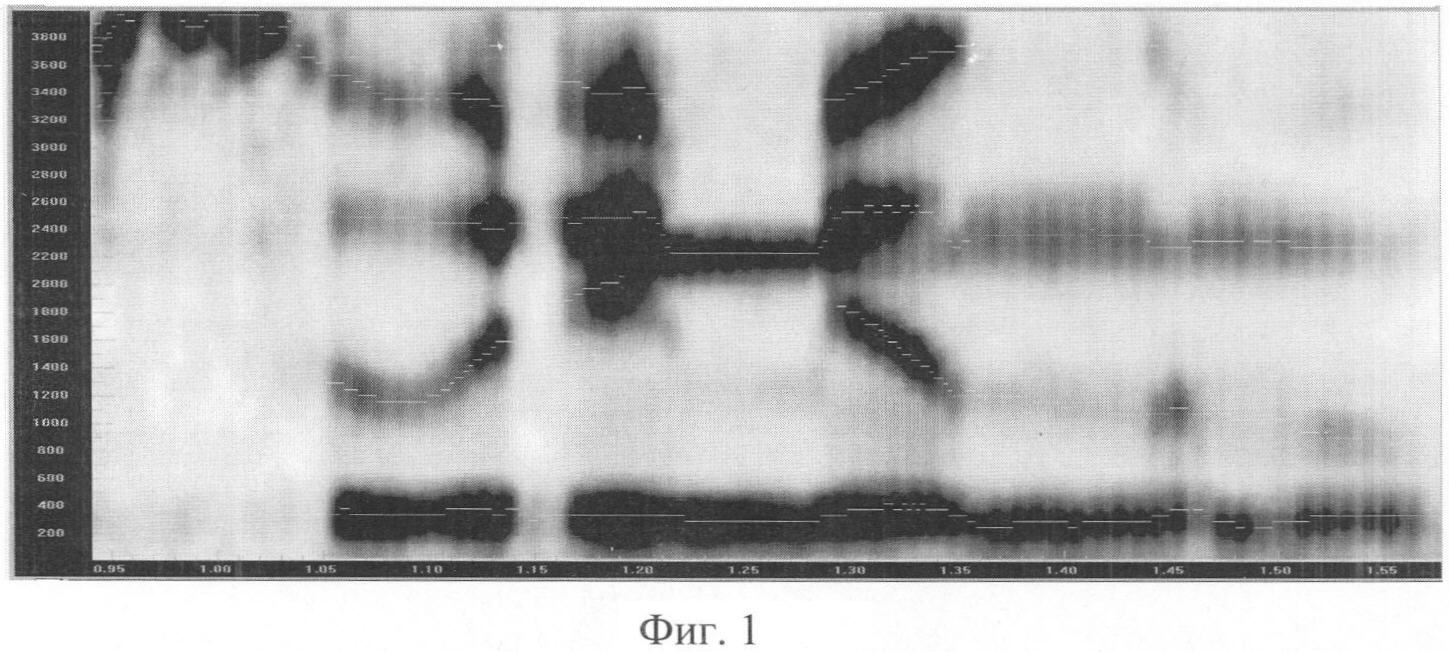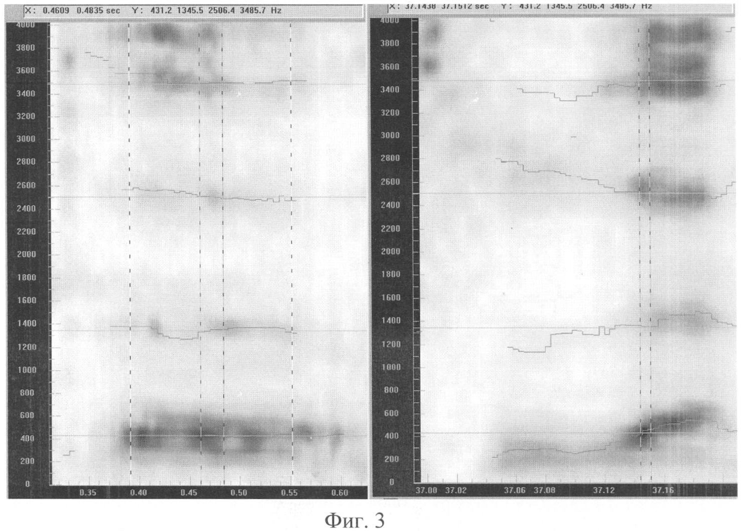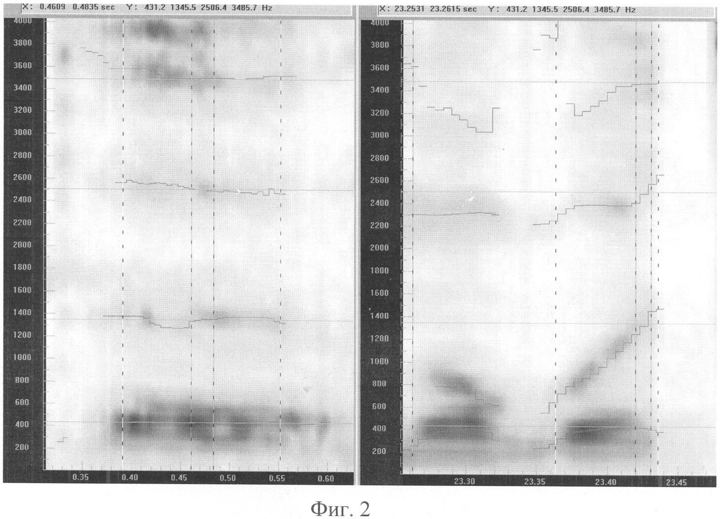 1. Способ идентификации говорящего по фонограммам устной речи, включающий оценку сходства между первой фонограммой говорящего и второй, эталонной фонограммой по совпадению значений формантных частот на выбранных для сравнения опорных фрагментах речевого сигнала на первой и второй фонограммах, отличающийся тем, что на первой и второй фонограммах выбирают опорные фрагменты речевых сигналов, на которых присутствуют формантные траектории, по крайней мере, трех формантных частот, из выбранных опорных фрагментов сравнивают между собой опорные фрагменты, в которых совпадают значения, по крайней мере, двух формантных частот, оценивают сходство сравниваемых опорных фрагментов по совпадению значений остальных формантных частот, а сходство фонограмм в целом определяют по суммарной оценке сходства всех сравниваемых опорных фрагментов. 2. Способ по п.1, отличающийся тем, что значения формантных частот на каждом выбранном опорном фрагменте вычисляют как средние значения на интервалах времени фиксированной длины, на которых значения частот формант относительно постоянны. 3. Способ по п.1, отличающий тем, что выбирают и сравнивают опорные фрагменты, в которых совпадают значения частот первых двух формант, которые находятся в заданных границах типичной вариативности значений формантных частот для соответствующего типа гласной фонемы для данного языка. 4. Способ по п.1, отличающийся тем, что для сравнения на фонограммах выбирают, по крайней мере, два опорных фрагмента речевого сигнала, относящихся к произнесению максимально артикуляторно различных звуков с максимальными и минимальными для данной фонограммы значениями частот первой и второй формант. 5. Способ по пп.1-4, отличающийся тем, что перед вычислением значений формантных частот спектр мощности речевого сигнала каждой фонограммы подвергают инверсной фильтрации, при которой для каждой частотной компоненты спектра мощности вычисляют ее среднее по времени значение, по крайней мере, для отдельных фрагментов фонограммы и затем исходное значение спектра мощности сигнала фонограммы для каждой частотной компоненты спектра делят на ее инверсное среднее значение. 6. Способ по пп.1-4, отличающийся тем, что перед вычислением значений формантных частот спектр мощности речевого сигнала каждой фонограммы подвергают инверсной фильтрации, при которой для каждой частотной компоненты спектра мощности вычисляют ее среднее по времени значение, по крайней мере, для отдельных фрагментов фонограммы и затем проводят операцию логарифмирования спектров и из логарифма исходного значения каждой частотной компоненты спектра мощности сигнала фонограммы вычитают логарифм ее среднего значения.
