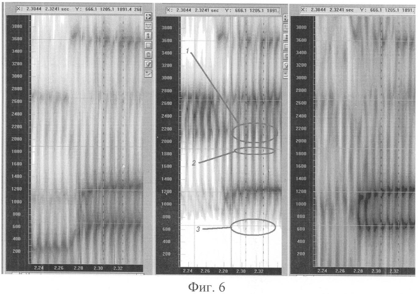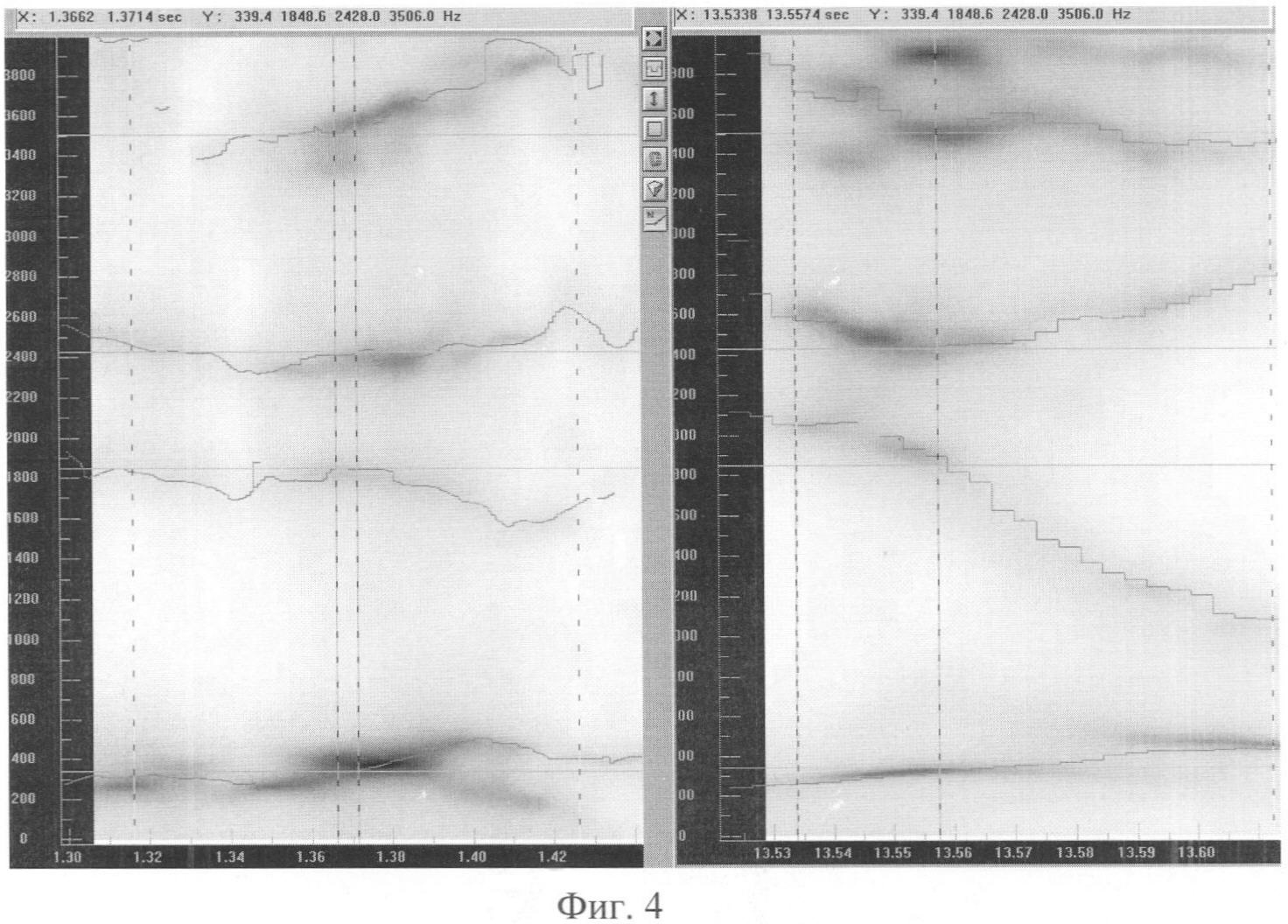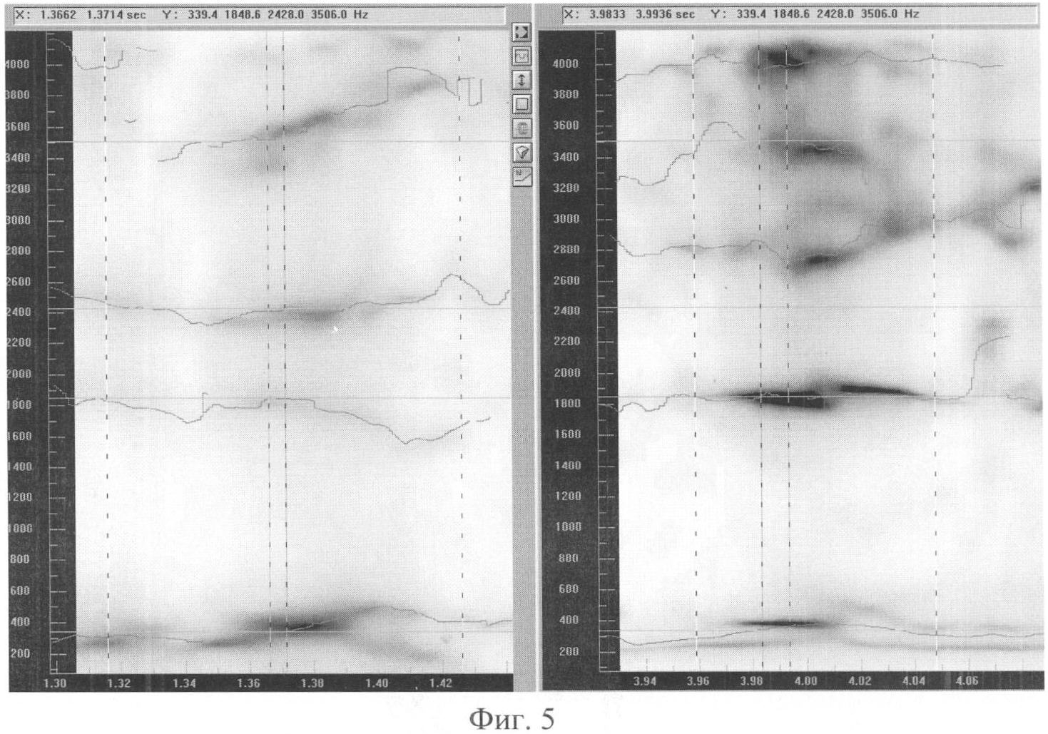 1. Способ идентификации говорящего по фонограммам устной речи, включающий оценку сходства между первой фонограммой говорящего и второй, эталонной фонограммой по совпадению значений формантных частот на выбранных для сравнения опорных фрагментах речевого сигнала на первой и второй фонограммах, отличающийся тем, что на первой и второй фонограммах выбирают опорные фрагменты речевых сигналов, на которых присутствуют формантные траектории, по крайней мере, трех формантных частот, из выбранных опорных фрагментов сравнивают между собой опорные фрагменты, в которых совпадают значения, по крайней мере, двух формантных частот, оценивают сходство сравниваемых опорных фрагментов по совпадению значений остальных формантных частот, а сходство фонограмм в целом определяют по суммарной оценке сходства всех сравниваемых опорных фрагментов. 2. Способ по п.1, отличающийся тем, что значения формантных частот на каждом выбранном опорном фрагменте вычисляют как средние значения на интервалах времени фиксированной длины, на которых значения частот формант относительно постоянны. 3. Способ по п.1, отличающий тем, что выбирают и сравнивают опорные фрагменты, в которых совпадают значения частот первых двух формант, которые находятся в заданных границах типичной вариативности значений формантных частот для соответствующего типа гласной фонемы для данного языка. 4. Способ по п.1, отличающийся тем, что для сравнения на фонограммах выбирают, по крайней мере, два опорных фрагмента речевого сигнала, относящихся к произнесению максимально артикуляторно различных звуков с максимальными и минимальными для данной фонограммы значениями частот первой и второй формант. 5. Способ по пп.1-4, отличающийся тем, что перед вычислением значений формантных частот спектр мощности речевого сигнала каждой фонограммы подвергают инверсной фильтрации, при которой для каждой частотной компоненты спектра мощности вычисляют ее среднее по времени значение, по крайней мере, для отдельных фрагментов фонограммы и затем исходное значение спектра мощности сигнала фонограммы для каждой частотной компоненты спектра делят на ее инверсное среднее значение. 6. Способ по пп.1-4, отличающийся тем, что перед вычислением значений формантных частот спектр мощности речевого сигнала каждой фонограммы подвергают инверсной фильтрации, при которой для каждой частотной компоненты спектра мощности вычисляют ее среднее по времени значение, по крайней мере, для отдельных фрагментов фонограммы и затем проводят операцию логарифмирования спектров и из логарифма исходного значения каждой частотной компоненты спектра мощности сигнала фонограммы вычитают логарифм ее среднего значения.
