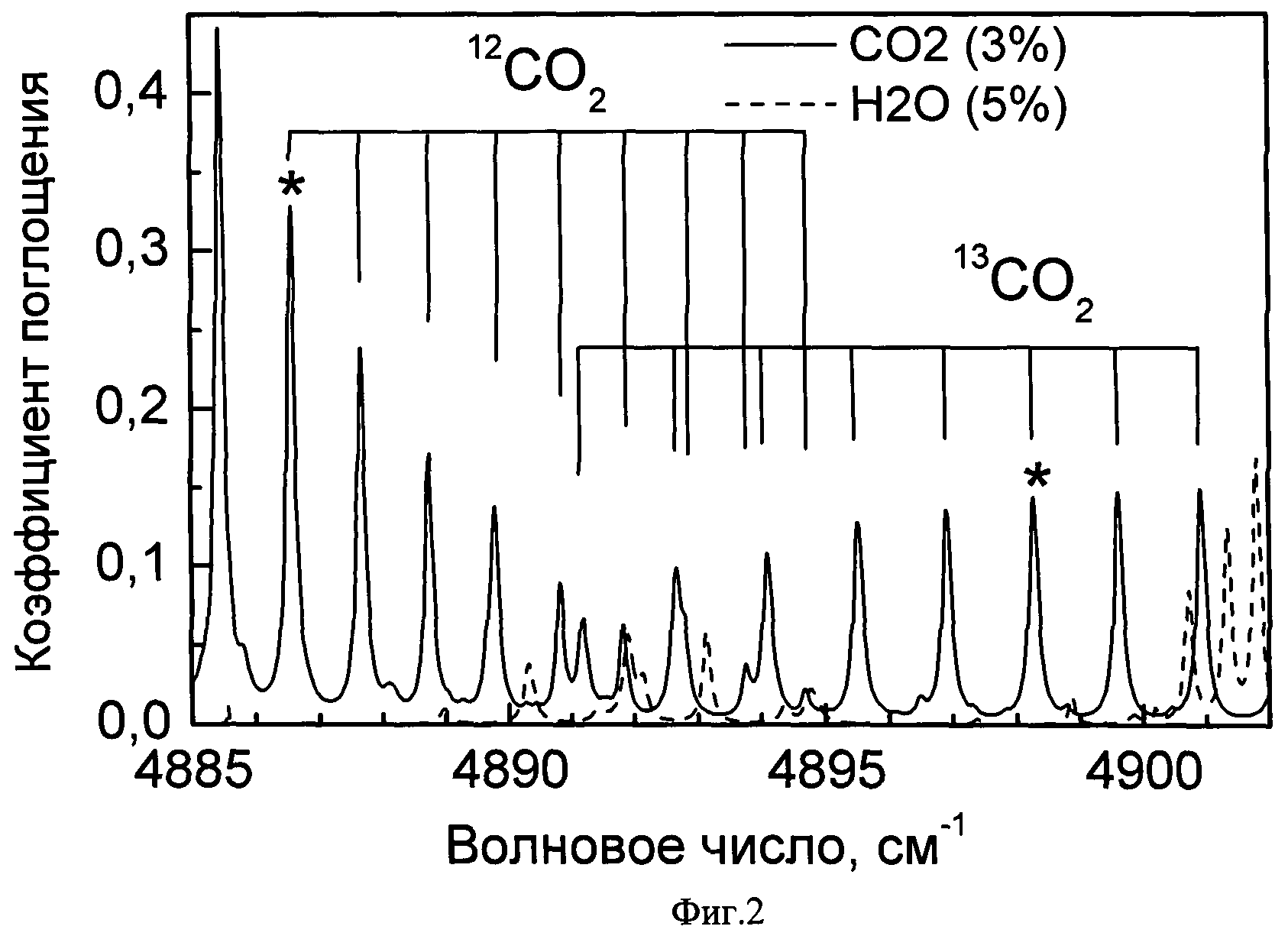ОБЛАСТЬ ПРИМЕНЕНИЯ Изобретения относятся к области лазерной спектроскопии и анализа, а именно к области применения полупроводниковых лазеров, и могут быть использованы для сравнения изотопного состава CO2 в образцах газовых смесей, в том числе для определения изменений относительной концентрации изотопомеров12СО2 и13СО2 в выдыхаемом воздухе с целью биомедицинской диагностики. ПРЕДШЕСТВУЮЩИЙ УРОВЕНЬ ТЕХНИКИ Известны способы определения относительного содержания изотопомеров двуокиси углерода12CO2 и13CO2, основанные на масс-спектрометрическом анализе, недисперсионном спектральном анализе [1] и лазерном спектральном анализе [2]. Лазерный спектральный анализ относительного содержания12СО2 и13СО2основан, как известно, на эффекте изменения констант колебательного и вращательного движения молекул CO2 при замене в этих молекулах одного стабильного изотопа углерода,12С, на другой,13С. За счет этого происходят сдвиг полос колебательно-вращательного поглощения13CO2 относительно полос12CO2 и изменение расстояния между отдельными линиями поглощения в таких полосах. Это позволяет, используя методы спектрального анализа высокого спектрального разрешения, различить и точно измерить резонансное поглощение, обусловленное линиями каждого из изотопомеров двуокиси углерода, и с достаточной точностью определить их относительное содержание. Распространенность изотопов углерода12С и13С в природе составляет около 99.86% и 1.13%, соответственно. Для диагностических целей производят сравнение относительного содержания изотопов углерода в исследуемом и референсном образцах газовой смеси на уровне сотых долей процента и на практике для целей медицинской диагностики используют относительную величину: где Ra - изотопическое отношение углерода исследуемого образца, a Rr - изотопическое отношение углерода референсного образца. δ13С измеряется в единицах промилле (‰), 1‰=0.1%. Высокие точность и чувствительность изотопического анализа обычно достигаются за счет применения сложных и достаточно дорогих масс-спектрометрических аналитических комплексов, что делает актуальным разработку более простых, но в тоже время достаточно точных, чувствительных и селективных альтернативных способов анализа относительного содержания12СО2 и13CO2, а также разработки устройств, позволяющих осуществить предлагаемый способ. Известно изобретение «СПОСОБ ОПРЕДЕЛЕНИЯ ОТНОСИТЕЛЬНОЙ КОНЦЕНТРАЦИИ ИЗОТОПОМЕРОВ ДВУОКИСИ УГЛЕРОДА12CO2 И13CO2 И УСТРОЙСТВО ДЛЯ ЕГО ОСУЩЕСТВЛЕНИЯ» [3], которое относится к области лазерной спектроскопии. В способе оптическую частоту лазера периодически сканируют в аналитическом спектральном диапазоне посредством модуляции величины тока накачки, регистрируют лазерный спектр пропускания среды, содержащий линии поглощения молекул12СО2 и13CO2, рассчитывают спектр коэффициента поглощения в линиях, при этом учитывают интенсивность лазерного излучения вне аналитических линий поглощения. Устройство включает перестраиваемый полупроводниковый лазер, блок накачки и управления спектральными и мощностными параметрами излучения перестраиваемого полупроводникового лазера, блок детектирования лазерного излучения, блок предварительного усиления регистрируемого радиочастотного сигнала и блок обработки лазерных спектров пропускания. Техническим результ