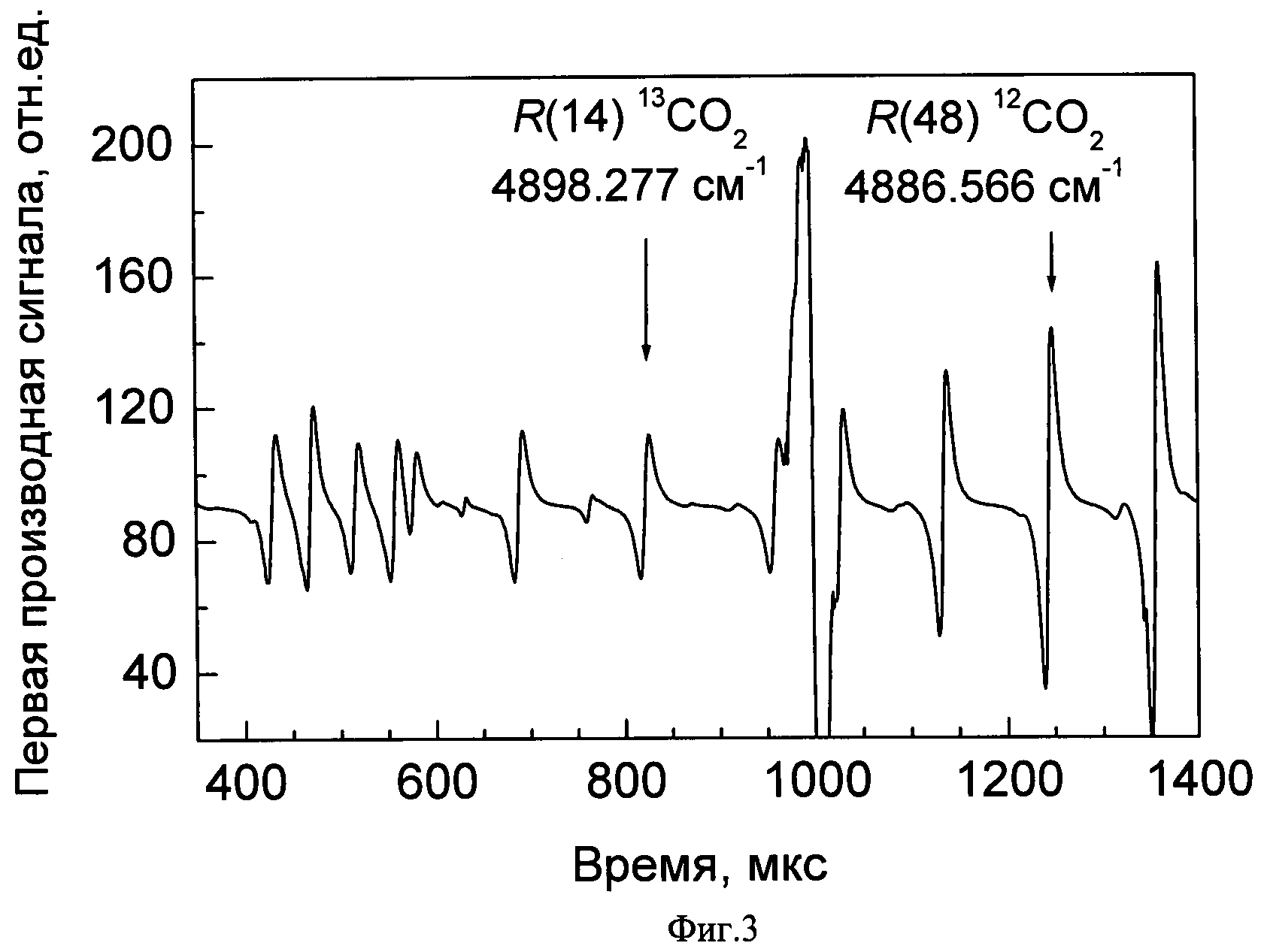 Изобретение относится к области лазерной спектроскопии и анализа и может быть использовано для сравнения изотопного состава СО2 в образцах газовых смесей, в том числе для определения изменений относительной концентрации изотопомеров 12СО2 и 13СО2 в выдыхаемом воздухе с целью биомедицинской диагностики. Способ включает измерения резонансного поглощения молекул 12СО2 и 13СО2 с использованием перестраиваемого полупроводникового лазера, оптическую частоту которого периодически сканируют в аналитическом спектральном диапазоне. Прошедшее через кюветы с исследуемой и референсной смесями излучение детектируют с помощью фотоприемников, регистрируя первую и/или вторую производные спектров пропускания. Изобретение позволяет осуществить анализ сравниваемых образцов газовых смесей одновременно и синхронно, с достаточной чувствительностью, а также точностью, селективностью, скоростью и информативностью измерений. 2 н.п. ф-лы, 3 ил.