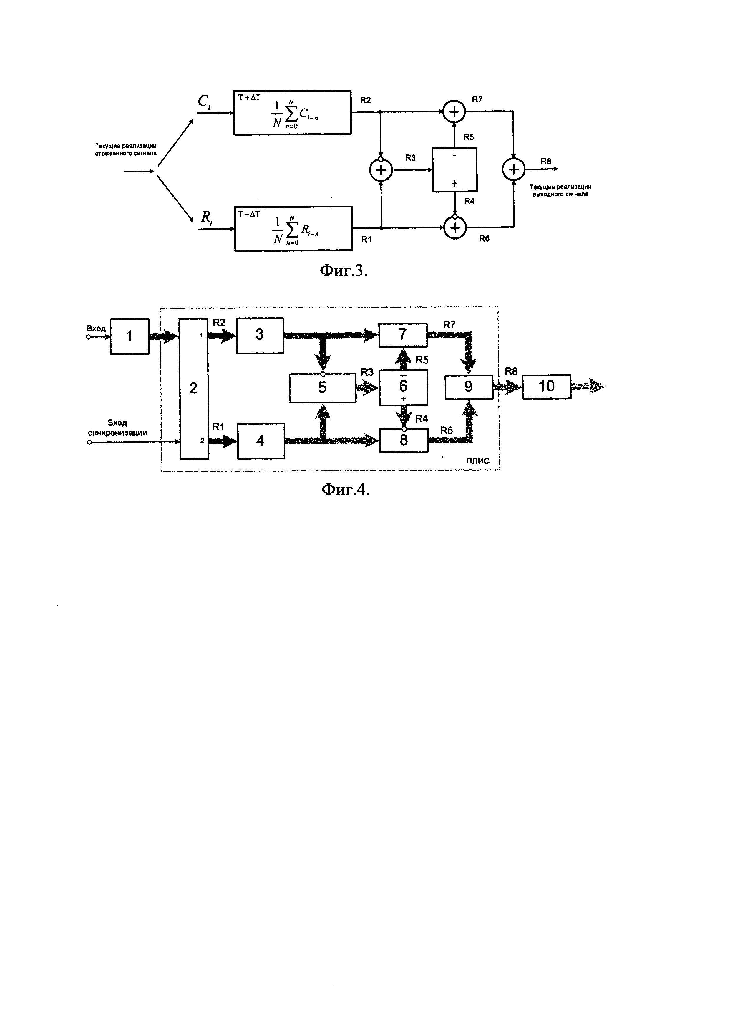 1. Способ подавления отметок от целей, расположенных за пределами зоны однозначной оценки дальности в обзорной РЛС, а также отметок, обусловленных несинхронной импульсной помехой, включающий импульсное радиолокационное зондирование окружающего пространства с изменяемым периодом T повторения импульсов, формирование реализации отраженного сигнала в координатах «амплитуда-задержка относительно сигнала излучения» для каждого зондирующего импульса, вычисление минимума по ансамблю из двух реализаций отраженного сигнала, отличающийся тем, что период повторения зондирующих импульсов изменяется на величину ±ΔT, при этом знак ΔT изменяется от импульса к импульсу, формируются реализации R1 как результат скользящего усреднения по ансамблю из N реализаций отраженного сигнала, длительность которых равна T-ΔT, формируются реализации R2 как результат скользящего усреднения по ансамблю из N реализаций отраженного сигнала, длительность которых равна T+ΔT, формируются реализации R3=R1-R2, формируются реализации R4, как реализации R3, в которых отрицательные значения приравнены к нулю, формируются реализации R5, как реализации R3, в которых положительные значения приравнены к нулю, формируются реализации R6=R1-R4, формируются реализации R7=R2+R5, формируется выходной сигнал РЛС, как реализации R8=R6+R7, при этом разность (сумма) двух реализаций A и B определяется как реализация, длительность которой равна длительности более короткой из реализаций A и B, а ее текущие значения определены как разность (сумма) значений реализаций A и B, соответствующих одинаковым задержкам. 2. Устройство подавления отметок от целей, расположенных за пределами зоны однозначной оценки дальности в обзорной РЛС, а также отметок, обусловленных несинхронной импульсной помехой, включающее в себя: АЦП 1, демультиплексор 2, отличающееся тем, что введены два усредняющих буфера 3, 4, сумматор 5, селектор сигнала по полярности 6, сумматоры 7, 8, 9, выходной интерфейс 10, причем аналоговый вход АЦП 1 является входом устройства, выходная шина АЦП 1 соединяется со входной шиной демультиплексора 2, на синхронизирующий вход демультиплексора 2 поступают тактовые импульсы, выход 1 демультиплексора 2 соединяется со входом усредняющего буфера 3, выход 2 демультиплексора 2 соединяется со входом усредняющего буфера 4, выход усредняющего буфера 3 соединяется с инвертирующим входом сумматора 5 и первым входом сумматора 7, выход усредняющего буфера 4 соединяется с неинвертирующим входом сумматора 5 и неинвертирующим входом сумматора 8, выход сумматора 5 соединяется со входом селектора сигнала по полярности 6, отрицательный выход которого соединяется со вторым входом сумматора 7, а положительный выход которого соединяется с инвертирующим входом сумматора 8, выход сумматора 7 соединяется с первым входом сумматора 9, выход сумматора 8 соединяется со вторым входом сумматора 9, выход сумматора 9 соединяется со входом интерфейса 10, а выход интерфейса 10 является выходом устройства.