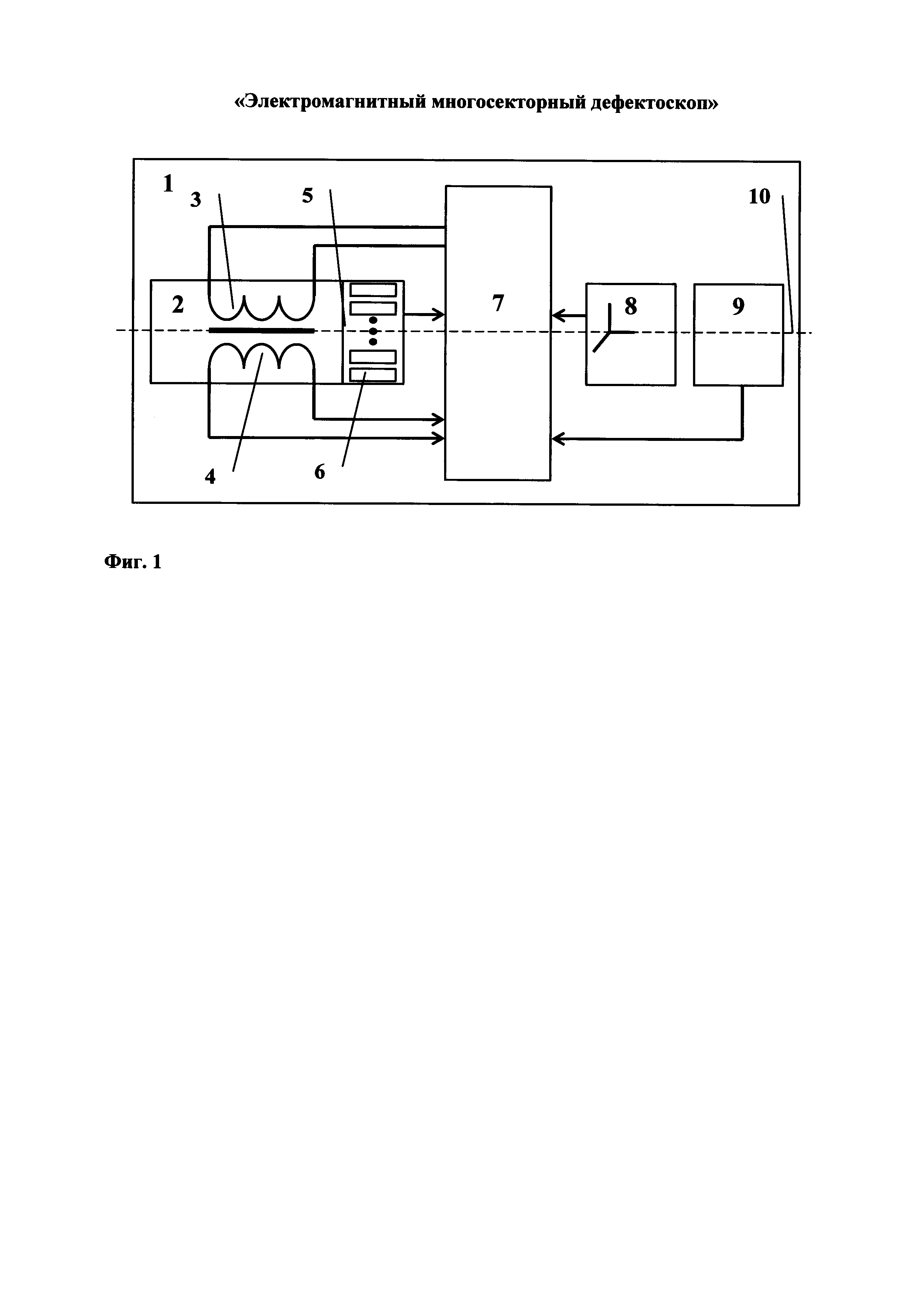 Изобретение относится к геофизическим исследованиям в скважинах и может быть использовано при техническом диагностировании насосно-компрессорных труб (НКТ) и обсадных колонн. Электромагнитный многосекторный дефектоскоп содержит цилиндрический немагнитный корпус, блок электроники с возможностью оцифровки и регистрации аналоговых сигналов, измерительный зонд, состоящий из генераторной, возбуждаемой подачей периодических импульсов напряжения с заданной длительностью, и приемной катушек с единым сердечником, при этом ось измерительного зонда совпадает с осью корпуса, содержит магнитный измерительный блок, имеющий не менее двенадцати датчиков, чувствительных только к изменению направления магнитного поля и равномерно расположенных по периметру круга, лежащего в плоскости, перпендикулярной оси измерительного зонда и прилегающей к его торцу, при этом центр круга совпадает с осью измерительного зонда. Технический результат – повышение точности измерения толщин обсадных колонн и НКТ, а также увеличение достоверности выявления дефектов в них. 2 з.п. ф-лы, 1 ил.