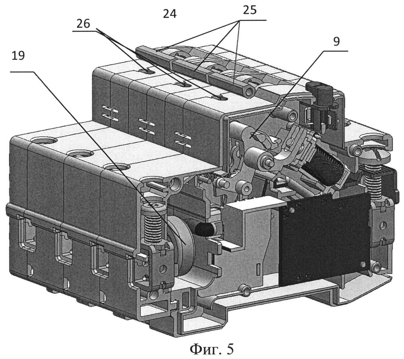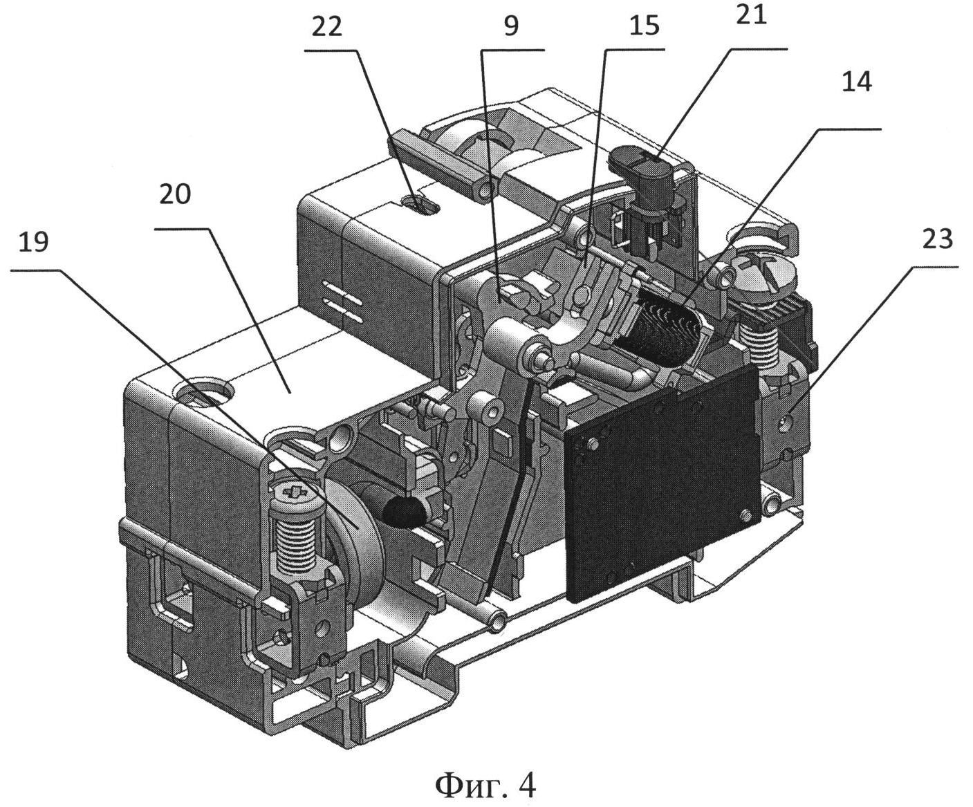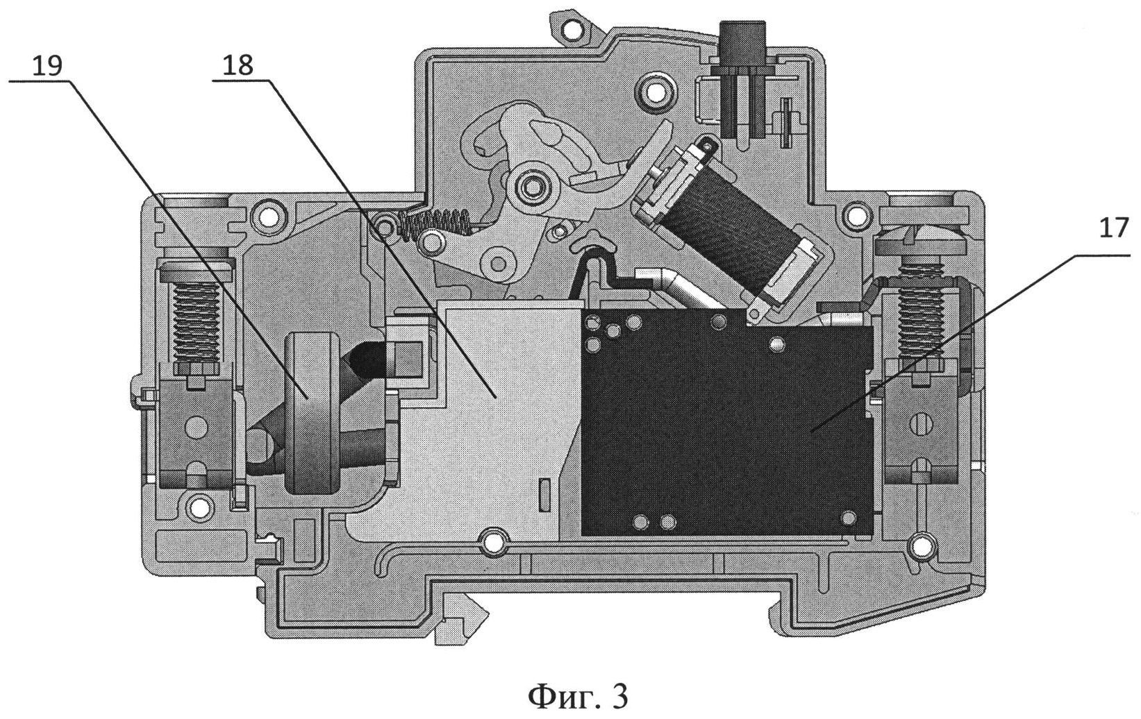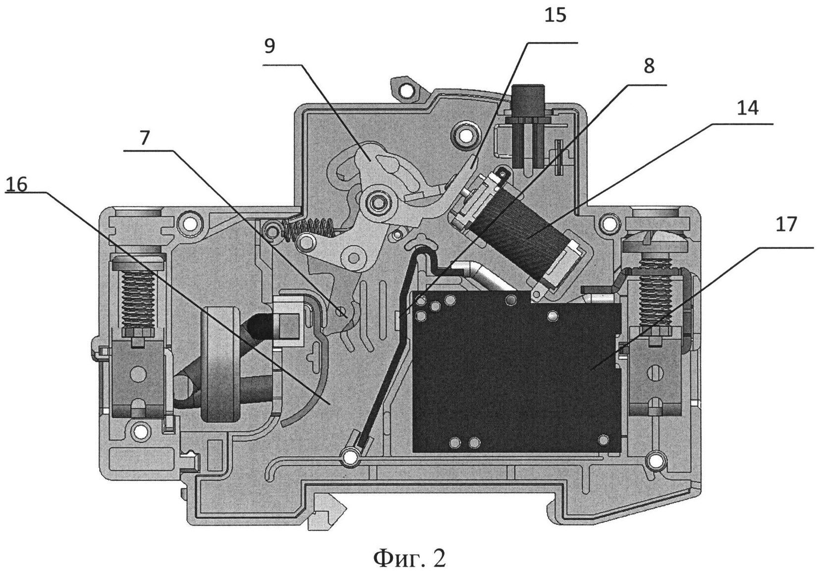 1. Автоматический выключатель, содержащий корпус из изолирующего материала, включающий в себя: первый и второй полюса, расположенные симметрично слева и справа от продольной оси выключателя, первый полюс содержит первый контакт и второй контакт, выполненные с возможностью взаимно соединяться/разъединяться друг с другом, второй полюс, содержащий третий контакт и четвертый контакт, выполненные с возможностью взаимно соединяться/разъединяться друг с другом, кинематический механизм замыкания/размыкания, связанный с первым и вторым полюсами для соединения/разъединения первого и второго контактов, и третьего и четвертого контактов, первое, второе и третье защитные устройства, средство соединения, которое соединяет кинематический механизм замыкания/размыкания с первым, вторым и с третьим защитными устройствами, отличающийся тем, что катушка расцепителя третьего защитного устройства расположена под углом к кинематическому механизму замыкания/размыкания и соединена с ним U-образным рычагом, а третий и четвертый контакты с дугоотводящей системой отделены от электронной платы крышкой. 2. Автоматический выключатель по п.1, отличающийся тем, что третье защитное устройство установлено во втором полюсе. 3. Автоматический выключатель по п.1, отличающийся тем, что первое и второе защитные устройства установлены в первом полюсе. 4. Автоматический выключатель по п.1, отличающийся тем, что первое защитное устройство обеспечивает защиту от коротких замыканий, второе защитное устройство обеспечивает защиту от токов перегрузки, а третье защитное устройство обеспечивает защиту от дифференциальных токов. 5. Автоматический выключатель по п.2, отличающийся тем, что третье защитное устройство содержит электронную плату, связанную с дифференциальным датчиком тока и катушкой расцепителя. 6. Автоматический выключатель по п.3, отличающийся тем, что второе защитное устройство выполнено в виде биметаллической пластины. 7. Автоматический выключатель по п.3, отличающийся тем, что первое защитное устройство выполнено в виде катушки электромагнитного расцепителя. 8. Автоматический выключатель по п.1, отличающийся тем, что катушка расцепителя третьего защитного устройства содержит втягивающий механизм срабатывания. 9. Автоматический выключатель по п.5, отличающийся тем, что конструкция корпуса в месте размещения дифференциального датчика тока выполнена в виде отдельной пластиковой детали, крепящейся на других частях корпуса с помощью выступов и пазов. 10. Автоматический выключатель по п.2, отличающийся тем, что во втором полюсе размещено устройство эксплуатационного контроля третьего защитного устройства. 11. Автоматический выключатель по п.1, отличающийся тем, что содержит механический индикатор состояния в первом полюсе. 12. Автоматический выключатель по п.1, отличающийся тем, что контактные зажимы выполнены со стороны подключения сети с возможностью соединения как с шиной, так и с проводником, а со стороны нагрузки - только проводником. 13. Автоматический выключатель по п.1, отличающийся тем, что может являться многополюсным с общим для всех полюсов кинематическим механизмом замыкания/размыкания с соединенными между собой рукоятками взвода и общий дифференциальный датчик тока. 14. Автоматический выключатель по п.13, отличающийся тем, что содержи