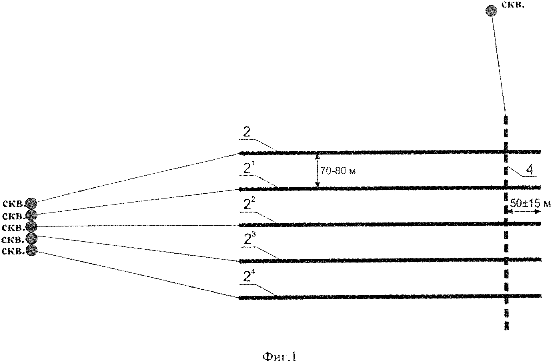Способ разработки залежи высоковязкой нефти, включающий строительство в пределах одного пласта параллельных горизонтальных скважин и отдельной скважины, расположенной на примерно равном расчетном расстоянии от забоев параллельных скважин, исключающем прорыв теплоносителя, но позволяющем создать гидродинамическую связь со всеми скважинами, закачку теплоносителя во все скважины с прогревом пласта и образование гидродинамической связи между параллельными скважинами и отдельной скважиной, перевод под закачку теплоносителя нагнетательных скважин и отбор продукции из добывающей скважины, отличающийся тем, что отдельную скважину строят над параллельными скважинами на расстоянии в плане 50±15 м до их забоев, причем отдельную скважину оборудуют колонной с муфтами, размещаемыми в точках пересечений в плане с нижними горизонтальными скважинами, диаметр муфт подбирают исходя из потребностей закачки пара для нижних горизонтальных скважин, после прогрева пласта и создания гидродинамической связи параллельные скважины переводят в добывающие для отбора продукции, а отдельную скважину - в нагнетательную для закачки теплоносителя, причем закачку теплоносителя осуществляют на всех этапах при давлении, исключающем нарушение целостности породы залежи.
