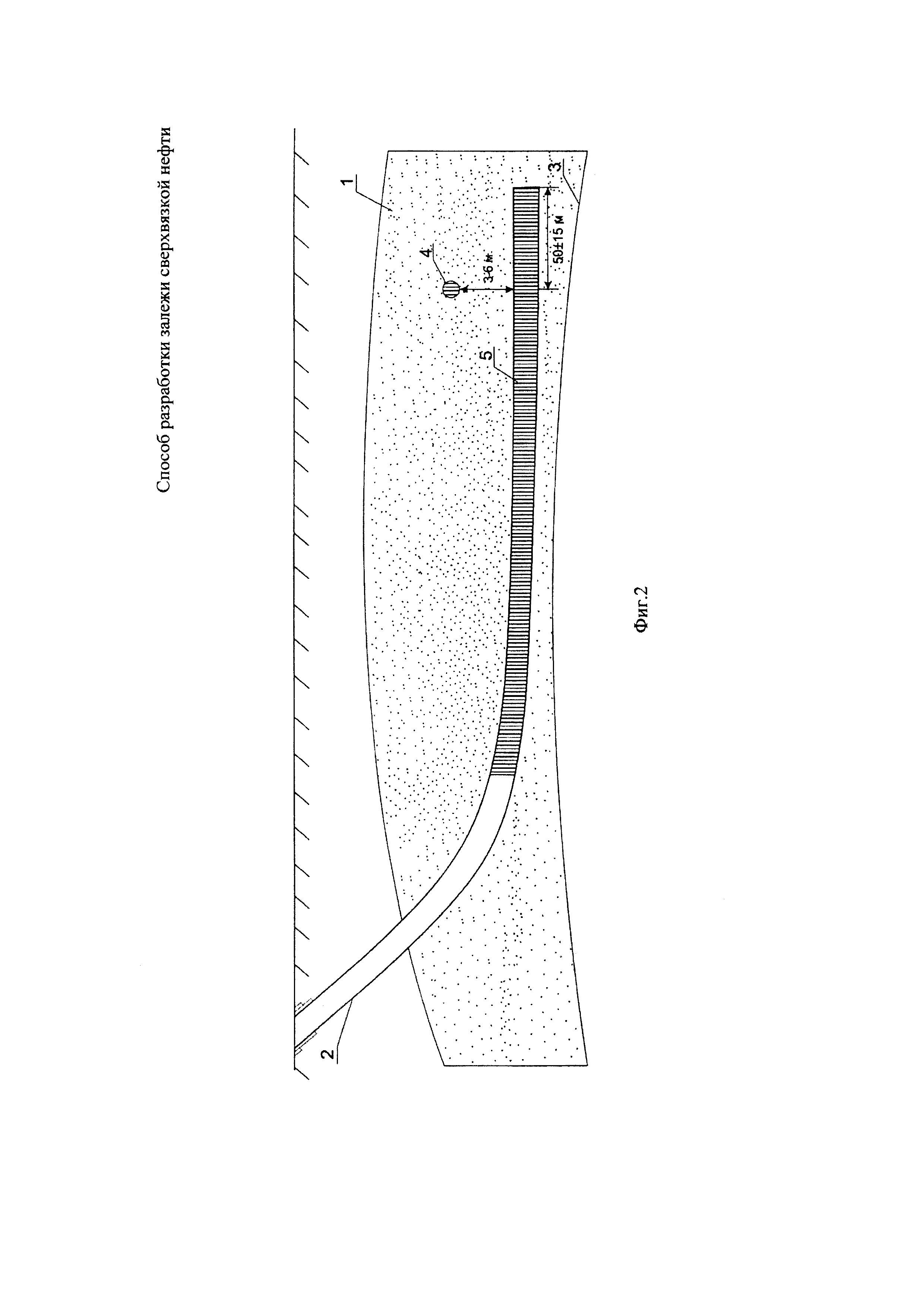 Изобретение относится к нефтедобывающей промышленности и, в частности, к термическим способам добычи сверхвязкой нефти и/или битума. Известен способ разработки залежи высоковязкой нефти (патент RU №2062865, МПК Е21В 43/20, опубл. Бюл. №36 от 27.06.1996), в соответствии, с которым на залежь высоковязкой нефти бурят вертикальные нагнетательные и горизонтальные добывающие скважины. Теплоноситель закачивают через нагнетательные скважины и одновременно периодически через горизонтальные скважины до прорыва теплоносителя к вертикальным добывающим скважинам. После прорыва теплоносителя через нагнетательные скважины закачивают вытесняющий агент, а через горизонтальные скважины осуществляют отбор песка и пластового флюида. Недостатком этого способа является то, что он не позволяет разрабатывать нефтяную залежь с достижением высокой нефтеотдачи. Вероятен быстрый прорыв теплоносителя из нагнетательной скважины в добывающую, что снижает его эффективность и увеличивает затраты на реализацию. Также известен способ разработки залежи высоковязкой нефти (патент RU №2334095, МПК Е21В 43/24, опубл. Бюл. №26 от 20.09.2008), включающий включающий бурение вертикальных нагнетательных скважин и горизонтальных добывающих скважин, закачку рабочего агента через нагнетательные скважины и отбор нефти через добывающие скважины, причем горизонтальный ствол добывающей скважины проводят в 1,5-2,5 м над подошвой продуктивного пласта, горизонтальный ствол перфорируют, выше горизонтального ствола добывающей скважины на 3,5-4,5 м размещают низ вертикальной нагнетательной скважины, перфорированной в интервале 0,5-1,5 м от низа, вертикальную нагнетательную скважину размещают от вертикального ствола добывающей скважины на расстоянии, большем 2/3 длины горизонтального участка добывающей скважины, вплоть до конца горизонтального ствола, при этом в качестве рабочего агента используют пар в чередовании с воздухом. Недостатком способа является вероятность быстрого прорыва теплоносителя из-за небольшого расстояния между забоем добывающей и нагнетательной скважин (3,5-4,5 м). В связи с этим - высокие затраты и малая эффективность. Известен также способ разработки залежи высоковязкой нефти (патент RU №2506417, МПК Е21В 43/16, опубл. в Бюл. №4 от 10.02.2014), включающий бурение вертикальных нагнетательных скважин и наклонно-горизонтальных добывающих скважин, закачку рабочего агента через нагнетательные скважины и отбор нефти через добывающие скважины, при этом определяют уровень водонефтяного контакта - ВНК, добывающую наклонно-горизонтальную от устья к забою скважину бурят с расположением как минимум на 2-3 м выше уровня ВНК, вертикальную нагнетательную скважину бурят с расположением забоя над забоем добывающей скважины выше на 5-8 м, перфорируют добывающую скважину по всей длине наклонного участка, нагнетательную вертикальную скважину перфорируют в зоне пласта в направлении устья добывающей скважины, поэтапно по мере прорыва рабочего агента или обводнения продукции выше 95% забой добывающей наклонно-горизонтальной скважины отсекают выше зоны прорыва или обводнения, а зону вскрытия нагнетательной скважины отсекают снизу на 1/3-1/2 часть всей ее длины, при выработке всей вырабатываемой зоны устье добывающей наклонно-горизонтальной скважины переводят под нагнетание рабочего агента. Недост