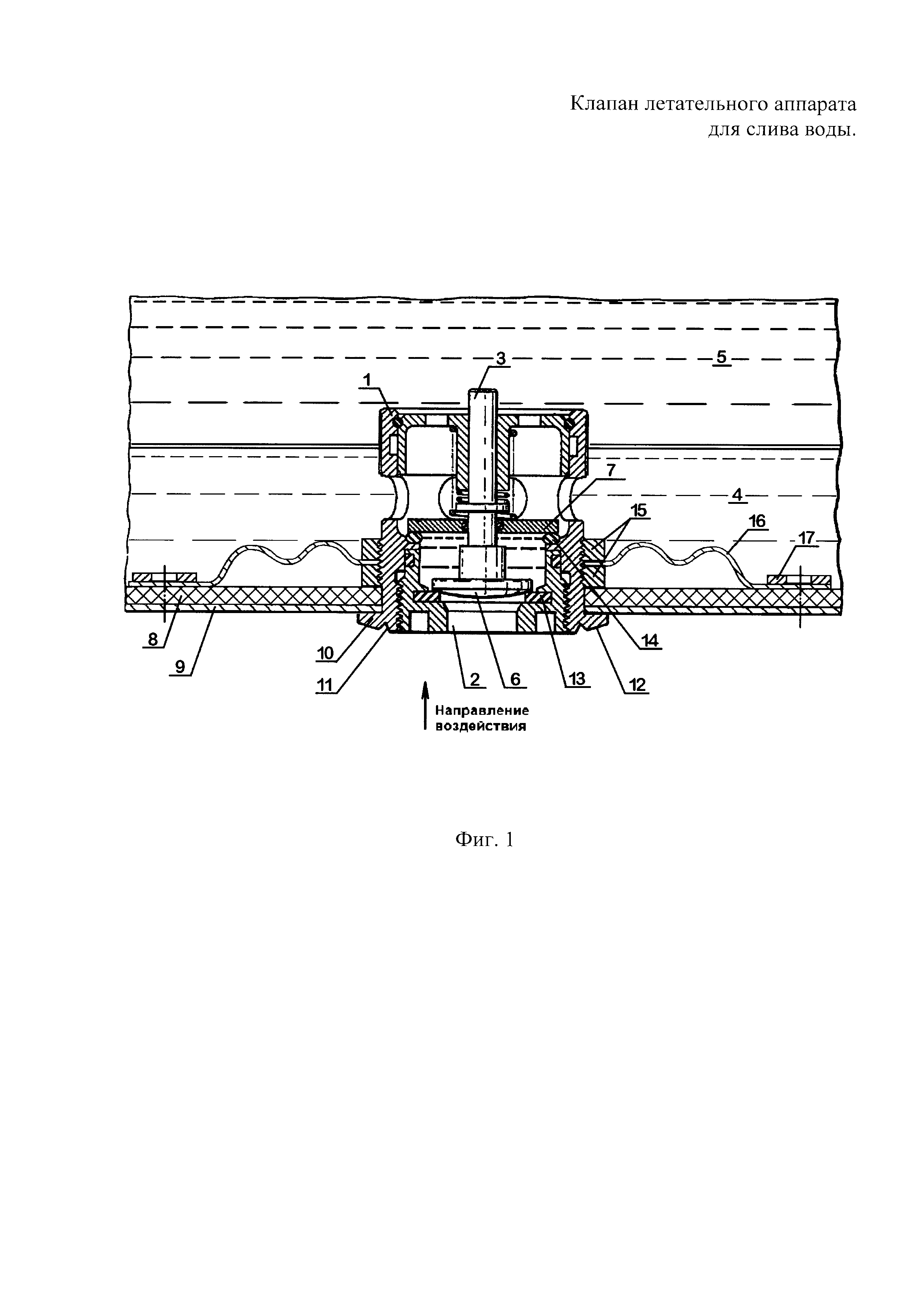 Изобретение относится к авиационной технике, а именно к клапану летательного аппарата для слива воды и может быть использовано в конструкции топливного бака летательного аппарата для предотвращения течи топлива при деформации конструкций клапана и топливного бака в случае нештатной жесткой посадки летательного аппарата. В настоящее время при жесткой посадке летательного аппарата нередки случаи возникновения пожара на борту вследствие разрушения и деформации конструкций топливных баков, в частности, в местах установки в них клапанов слива, а также вследствие разрушения и деформации самих клапанов слива. В этом случае процент травматизма и смертности значительно возрастает. Между тем, раздел «Топливная система», пункт 29.952 авиационных правил АП-29 гласит, что конструкция топливных баков не должна иметь таких разрушений, которые могли бы вызвать течь топлива на источник возгорания, а также должны быть установлены рассоединяющиеся самоуплотняемые соединители в местах топливной системы, где местные деформации могут привести к течи топлива. (Межгосударственный авиационный комитет. Авиационные правила, часть 29, 2003, 129 с.). Известно техническое решение «Клапан летательного аппарата для слива воды, топливный бак летательного аппарата, летательный аппарат и способ слива воды из топливного бака летательного аппарата», защищенное патентом РФ №2429399, кл. F16K 1/44, B64D 37/00 опубл. 20.09.2011. Данный клапан содержит пропускной канал для протекания жидкости между внутренней и внешней сторонами топливного бака, шток, первый и второй элементы уплотнения. Шток может перемещаться между открытым положением, в котором расположение первого и второго элементов уплотнения позволяет жидкости свободно протекать через пропускной канал, и закрытым положением, в котором расположение первого и второго элементов уплотнения не позволяет жидкости протекать через пропускной канал, предотвращая тем самым попадание жидкости в пространство между первым и вторым элементами уплотнения. Данное техническое решение способствует улучшению эксплуатационных характеристик клапана для слива воды при его работе в условиях низких температур. Однако, при такой конструкции данного клапана, в момент нештатной жесткой посадки летательного аппарата, под воздействием внешней силы неизбежно происходят местные деформации топливного бака и обшивки летательного аппарата от выступающих частей клапана. Именно выступающие части данного клапана первыми принимают на себя воздействие негативной внешней силы. Местные деформации обшивки летательного аппарата и стенок топливного бака могут привести к течи топлива и, как следствие, к возникновению пожара. Цель изобретения - улучшение эксплуатационных характеристик клапана для слива при его работе в нештатных ситуациях полета и посадки, повышение надежности работы топливной системы летательного аппарата. Поставленная цель достигается в клапане летательного аппарата для слива воды, состоящем из пропускного канала для протекания жидкости из топливного бака летательного аппарата, штока, первого элемента уплотнения и второго элемента уплотнения, установленных на упомянутом штоке. Корпус клапана установлен на стенке топливного бака таким образом, что внешняя поверхность стенки топливного бака плотно прилегает к внут