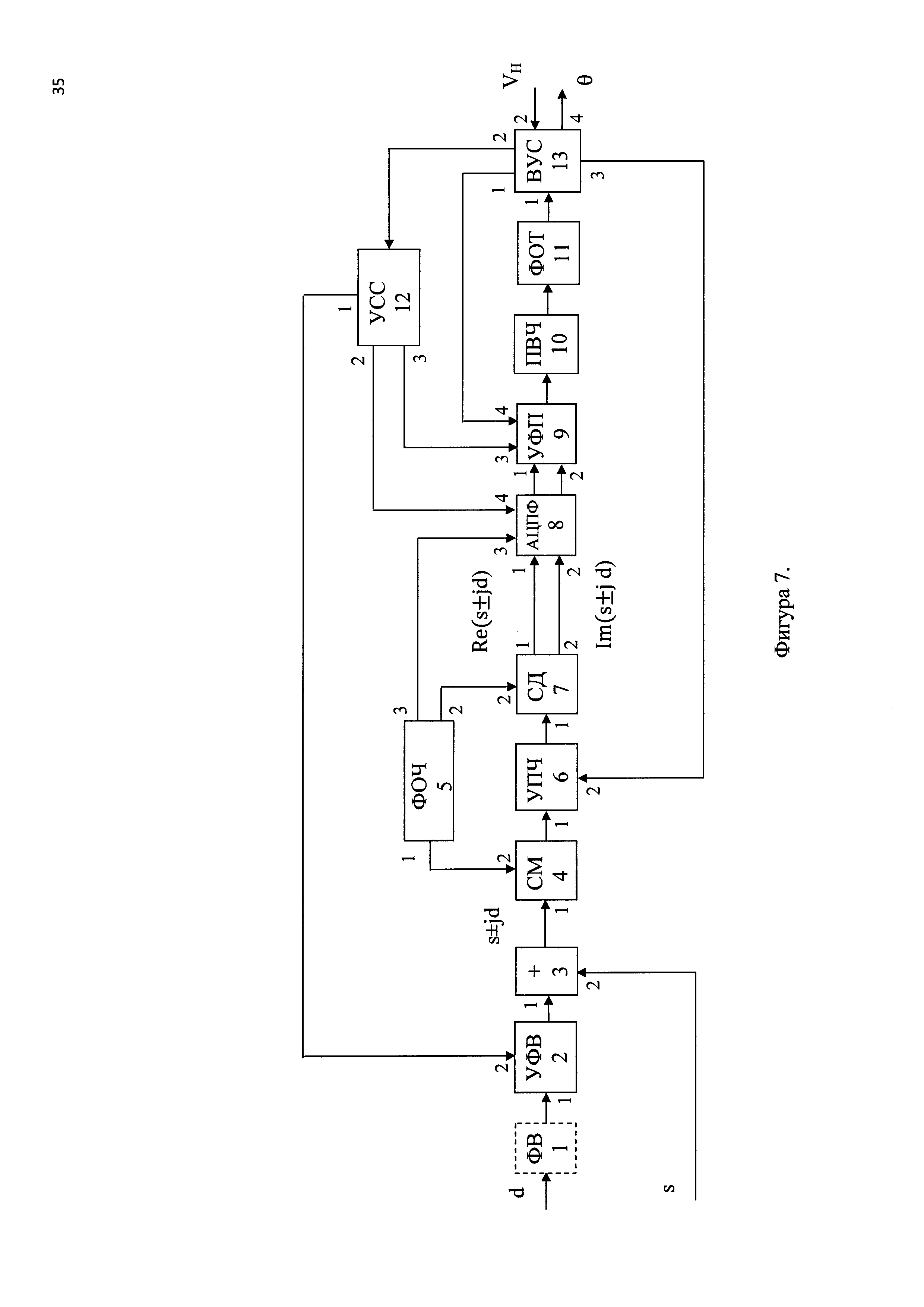 . В рассматриваемом примере реализации устройства, использующего предлагаемый способ обработки радиолокационных сигналов в моноимпульсной РЛС, аргументы αs(t) и αd(t) различаются между собой в условиях отсутствия помех и других каких-либо искажающих воздействий на величину 0° или 180° (т.е. эти сигналы синфазны или противофазны) в зависимости от знака угла отклонения линии визирования объекта радиолокационного наблюдения от равносигнального направления антенны моноимпульсной РЛС. Как указывается в источнике [2], данные соотношения фаз суммарного и разностного сигналов соответствуют случаю амплитудного пеленгования. Если антенной моноимпульсной РЛС осуществляется фазовое пеленгование, требуемое соотношение фаз αs(t) и αd(t) может быть получено включением дополнительного фазовращателя в суммарный или разностный канал поступления сигналов. Последний вариант иллюстрируется включением в схему, приведенную на фиг. 7, фазовращателя (ФВ) 1, контур которого показан пунктирной линией. Включение фазовращателя 1 в канал поступления разностного сигнала в большинстве случаев является предпочтительным, так как при этом не вносятся дополнительные потери, ухудшающие возможности начального обнаружения лоцируемых объектов по уровню суммарного сигнала.