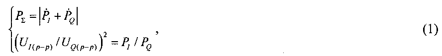 Изобретение относится к области измерительной техники и может быть использовано для измерения мощности радиосигнала в тракте, демодуляции сигнала, измерений амплитуды напряжения переменного тока, в частности к области измерений мощности сигнала путем измерений напряжения. Известен классический способ измерений мощности радиосигнала методом прямых измерений, с использованием ваттметров различной конструкции, состоящим в нагреве энергией электромагнитной волны чувствительного элемента ваттметра. Данный метод подходит для измерений суммарной мощности нескольких сигналов в тракте, но не позволяет измерить мощность двух квадратурных составляющих одного сигнала отдельно друг от друга. Другим способом является измерение проходящей СВЧ-мощности при помощи специализированного устройства (патент РФ №2071701 от 29.06.1994). Для уменьшения переменной составляющей погрешности рассогласования в полосе частот в предложенном устройстве, содержащем отрезок прямоугольного волновода, в его широкую и узкую стенки встроены две поглощающие пластины с установленными на них термодатчиками одинаковой длины, позволяющего измерять составляющие мощности сигнала. Однако так как предложенное устройство использует эффект нагрева чувствительного элемента, то также не позволяет проводить измерения мощности квадратурных составляющих сигнала по отдельности. Также известен способ определения составляющих мощности, основанный на измерении мгновенных значений тока и напряжения, формировании сигнала, ортогонального измеренному напряжению (с сохранением его нормы) по формулам преобразования Гильберта, вычислении действующего значения напряжения и пересчете норм полученных сигналов в активную и реактивную составляющие мощности (патент РФ 2191393 от 09.08.2000). Предложенный метод, хоть и позволяет оценить ортогональные составляющие мощности при работе на комплексную нагрузку, оценивает мощность только одного сигнала. Техническим результатом от внедрения изобретения является возможность определения мощности квадратурных составляющих радиосигнала отдельно друг от друга. Данный технический результат достигается за счет того, что одновременно осуществляется измерение мощности сигнала PΣ, являющейся суммарной мощностью его квадратурных составляющих, а также демодуляция сигнала. В процессе демодуляции происходит измерение амплитуд огибающих демодулированных сигналов квадратурных составляющих UI(p-p) и UQ(p-p), затем при последующей дополнительной обработке результатов демодуляции производится компенсация паразитного набега фазы сигнала путем расчета обратной матрицы поворота. На заключительном этапе, в процессе решения системы уравнений (1): производится расчет мощностей квадратурных составляющих PI и PQ. Предложенный метод отличается от перечисленных тем, что оценка мощности производится после математической обработки результатов демодуляции, чего ранее не применялось. Именно такой подход позволяет измерить мощности составляющих сигнала даже при существенной разнице их мощностей, а также разнице несущей частоты сигнала и частоты демодуляции. Предложенный способ измерений состоит в том, что результаты измерений получаются в результате совместной обработки измеренных значений суммарной мощности сигналов и амплитуд огибающих кв