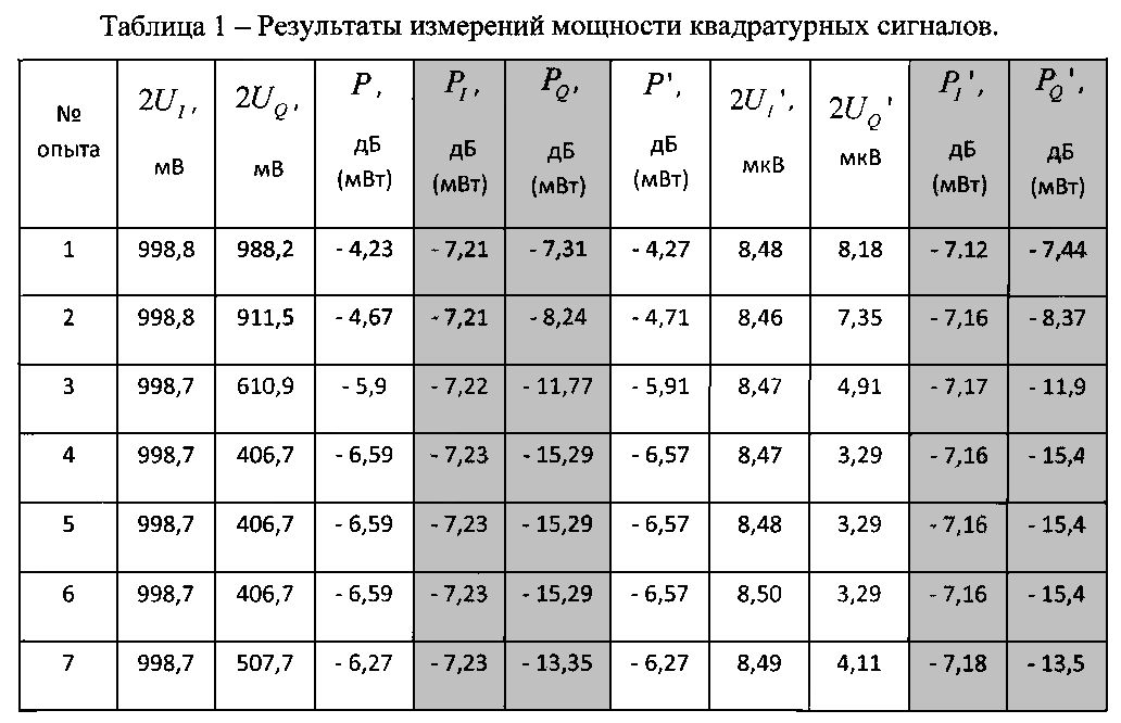 Изобретение относится к области измерительной техники и может быть использовано для измерения мощности радиосигнала в тракте, демодуляции сигнала, измерений амплитуды напряжения переменного тока, в частности к области измерений мощности сигнала путем измерений напряжения. Одновременно осуществляется измерение мощности сигнала P, являющейся суммарной мощностью его квадратурных составляющих, а также демодуляции сигнала. В процессе демодуляции происходит измерение амплитуд огибающих демодулированных сигналов квадратурных составляющих Uи U, затем при последующей дополнительной обработке результатов демодуляции производится компенсация паразитного набега фазы сигнала путем расчета обратной матрицы поворота. На заключительном этапе, в процессе решения системы уравненийпроизводится расчет мощностей квадратурных составляющих Pи P. Технический результат заключается в возможности определения мощности квадратурных составляющих радиосигнала отдельно друг от друга. 1 табл.