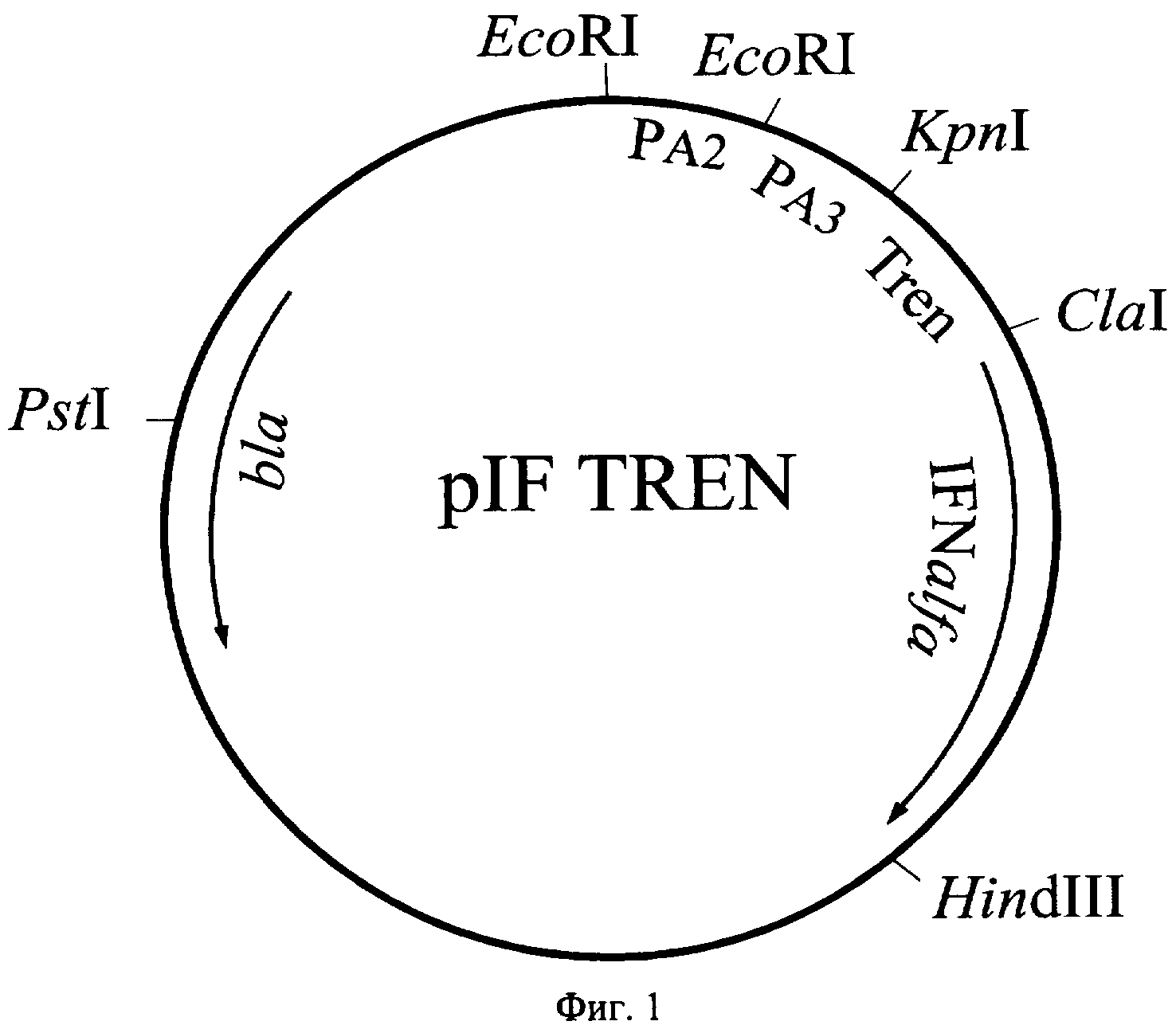 Рекомбинантная плазмидная ДНК pIF TREN, кодирующая полипептид интерферона альфа-2b человека, характеризуется следующими признаками: имеет молекулярную массу 2,40 Md (3,778 т.п.о.); кодирует аминокислотную последовательность зрелого интерферона альфа-2b человека; состоит из KpnI/HindIII - фрагмента плазмиды pTNF331 [8] длиной 3,170 т.п.о., содержащего
