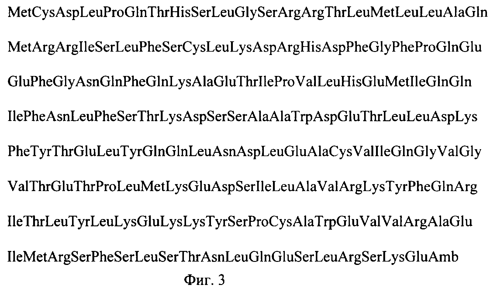 инициирующий и терминирующий кодоны выделены жирным шрифтом, подчеркнуты сайты рестриктаз: Hind III, PstI, Cla I; на фиг.3 - аминокислотная последовательность полипептида IFa2b, кодируемого