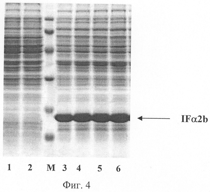 рекомбинантной плазмидой pIF TREN; на фиг.4 - электрофореграмма лизатов клеток штамма-реципиента Е. coli SGK25 (дорожки 1,2), штамма-продуцента Е. coli SGK25/pIF TREN (дорожки 3-6) в 12,5%-ном