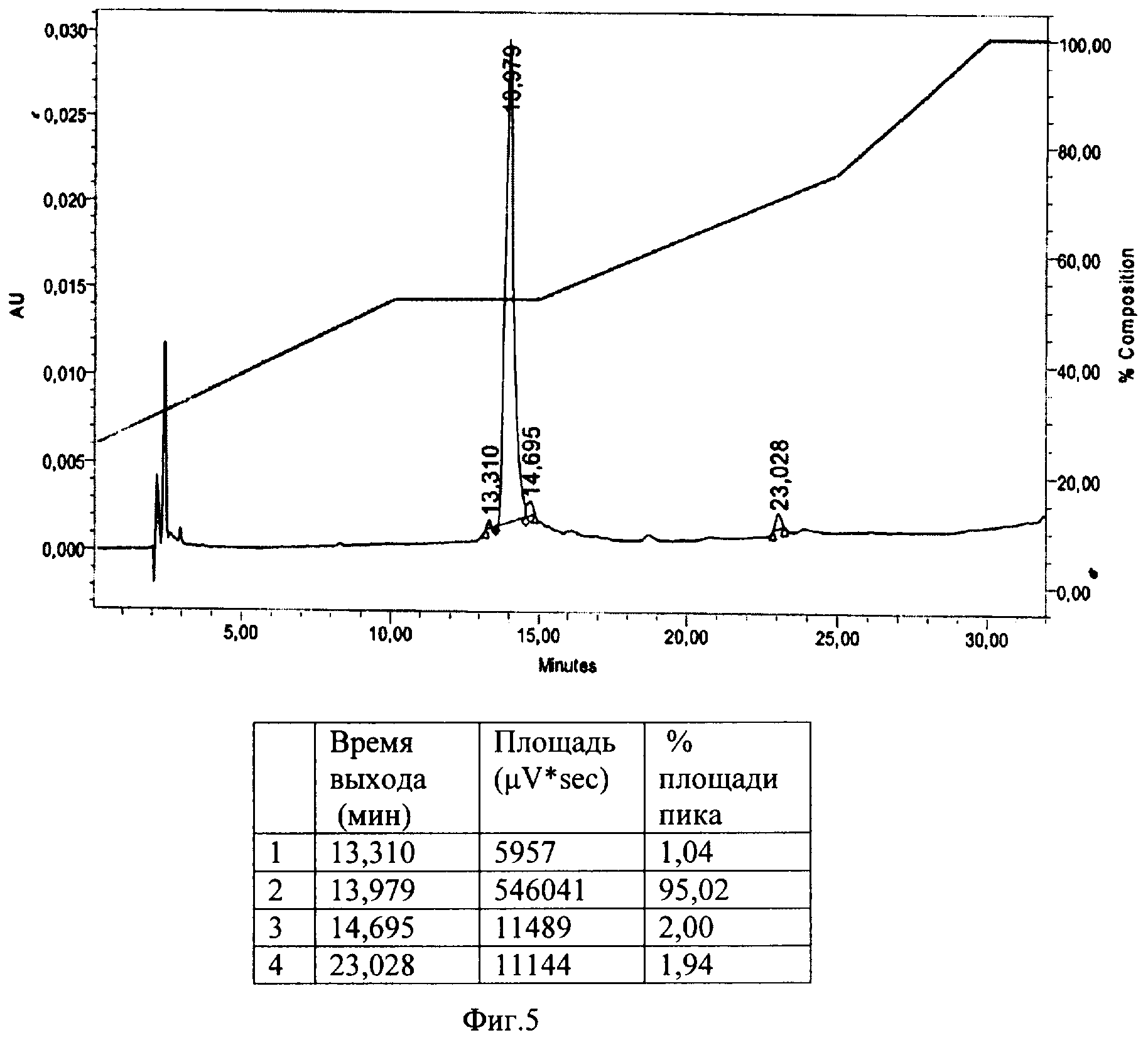 полиакриламидном геле (М - белковые маркеры молекулярной массы, kDa: 14,5; 21,5; 31,0; 45,0; 66,0; 97,4); стрелкой указан полипептид IFα2b. На фиг.5 представлена хроматограмма выделенного