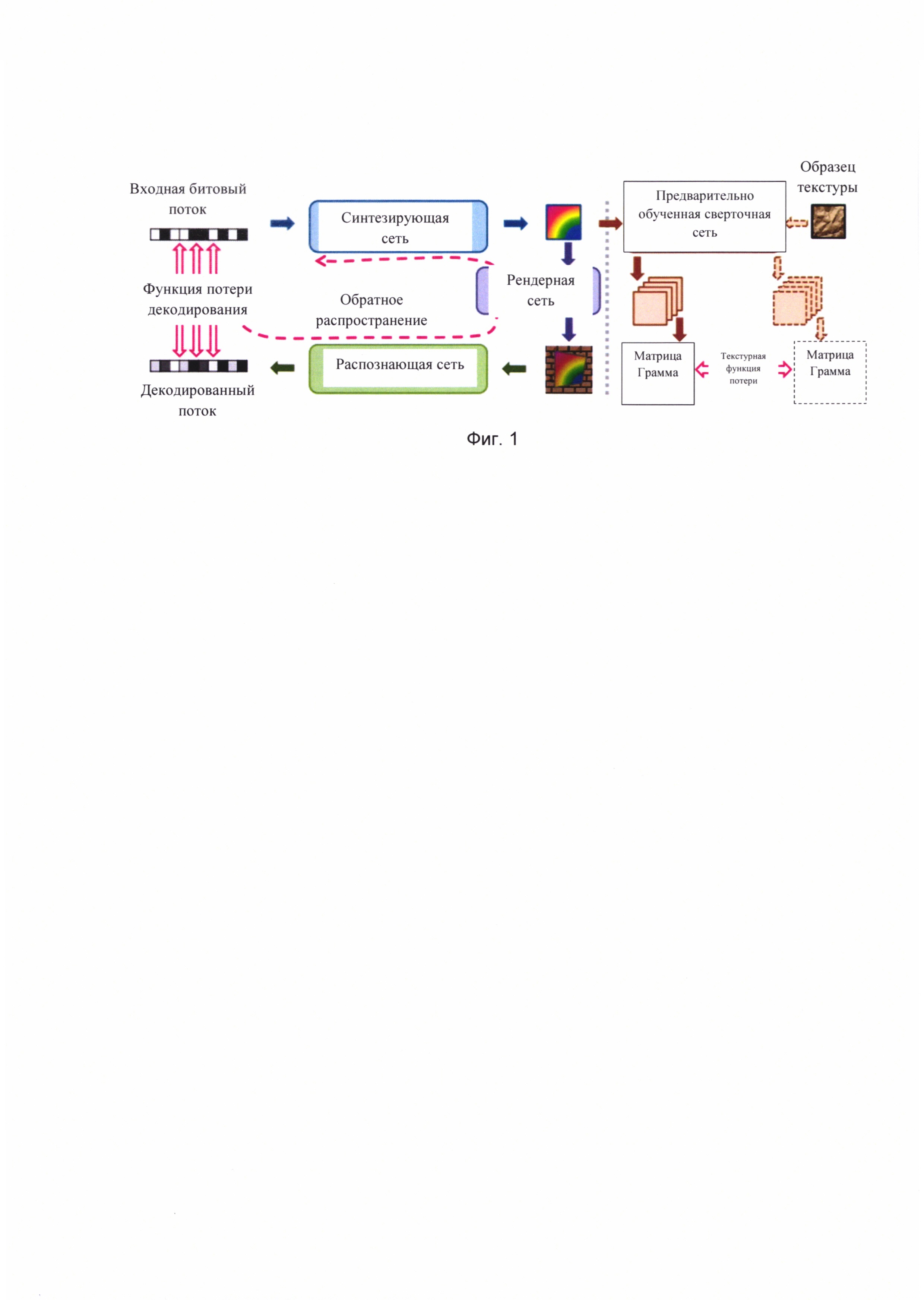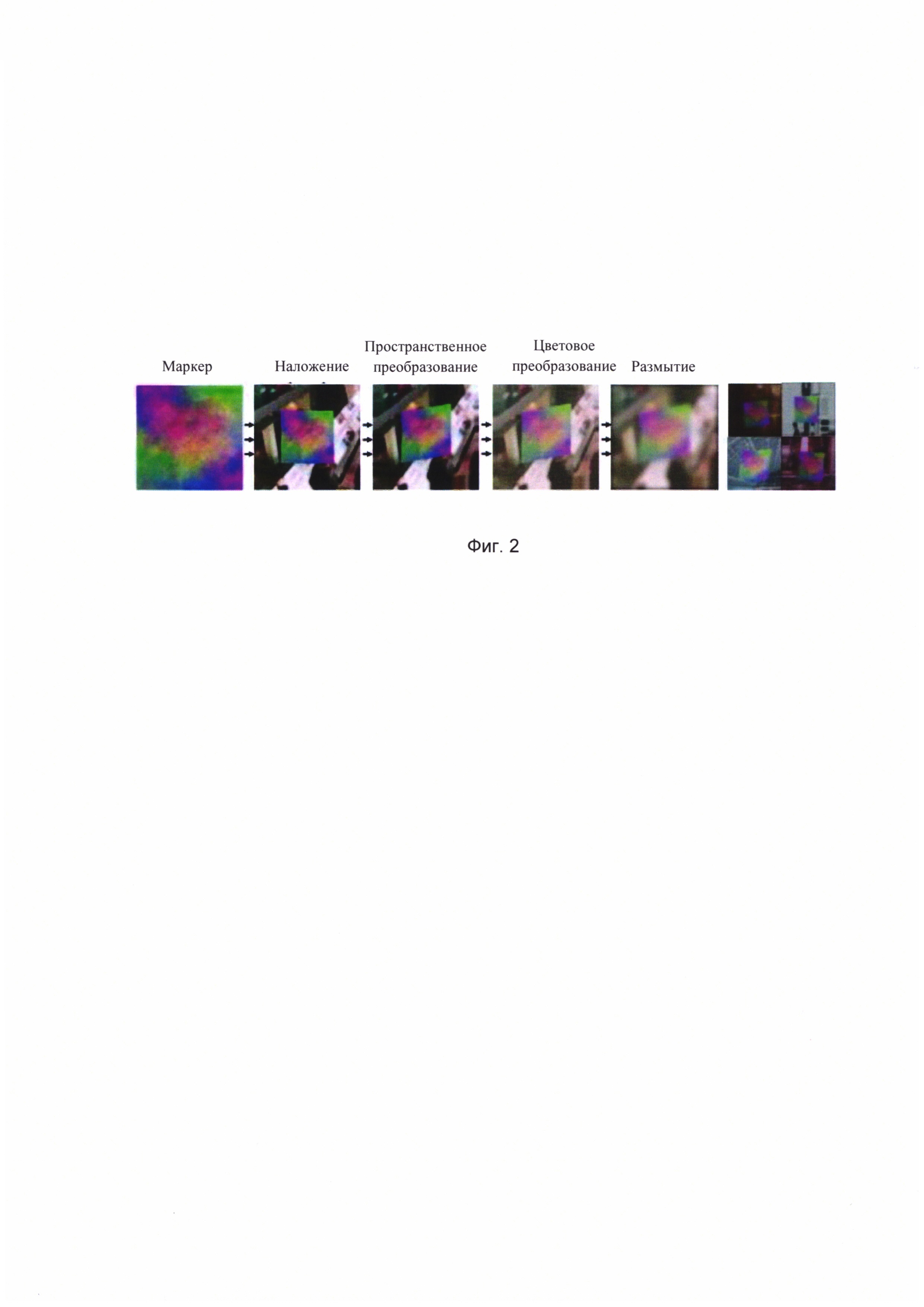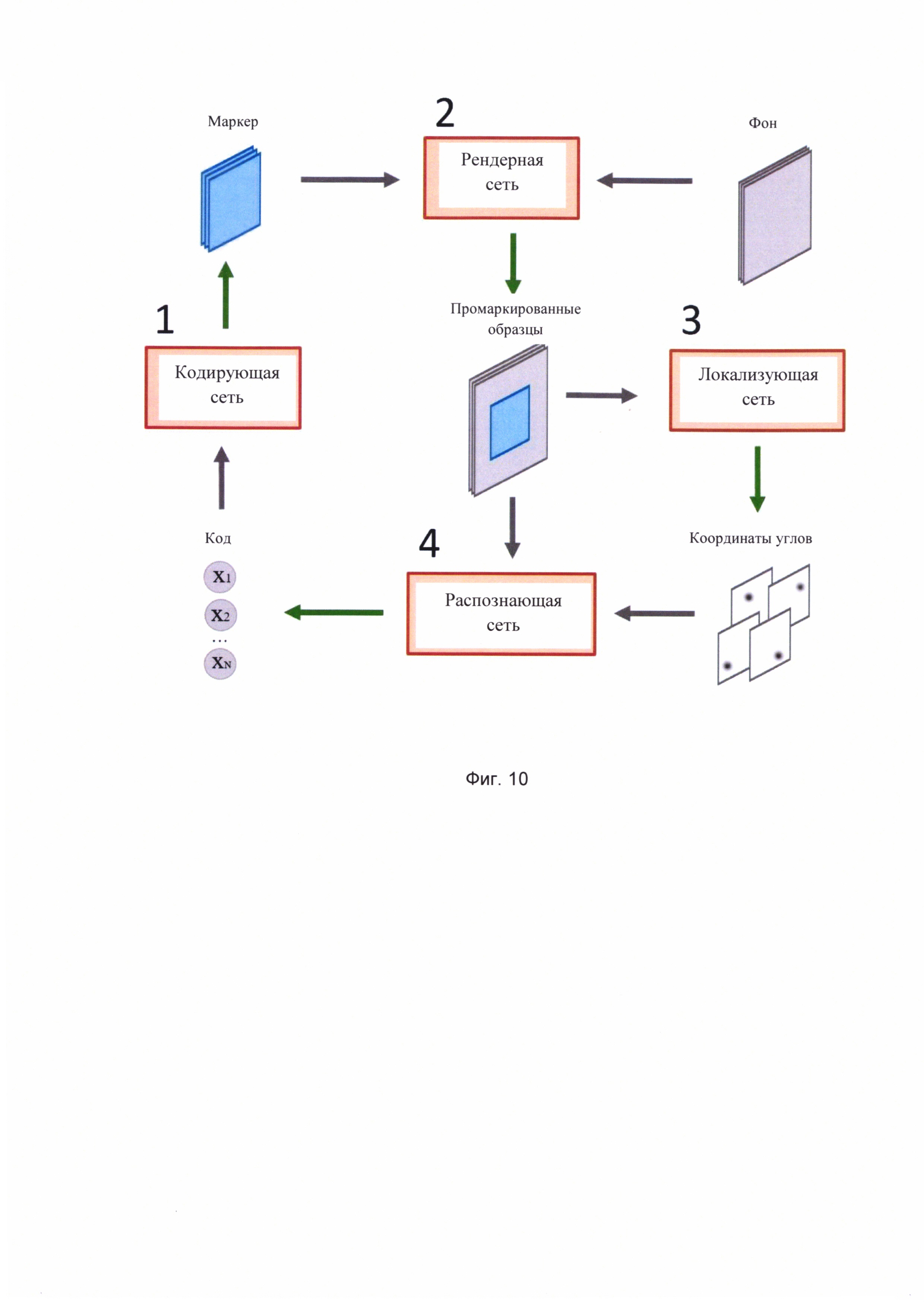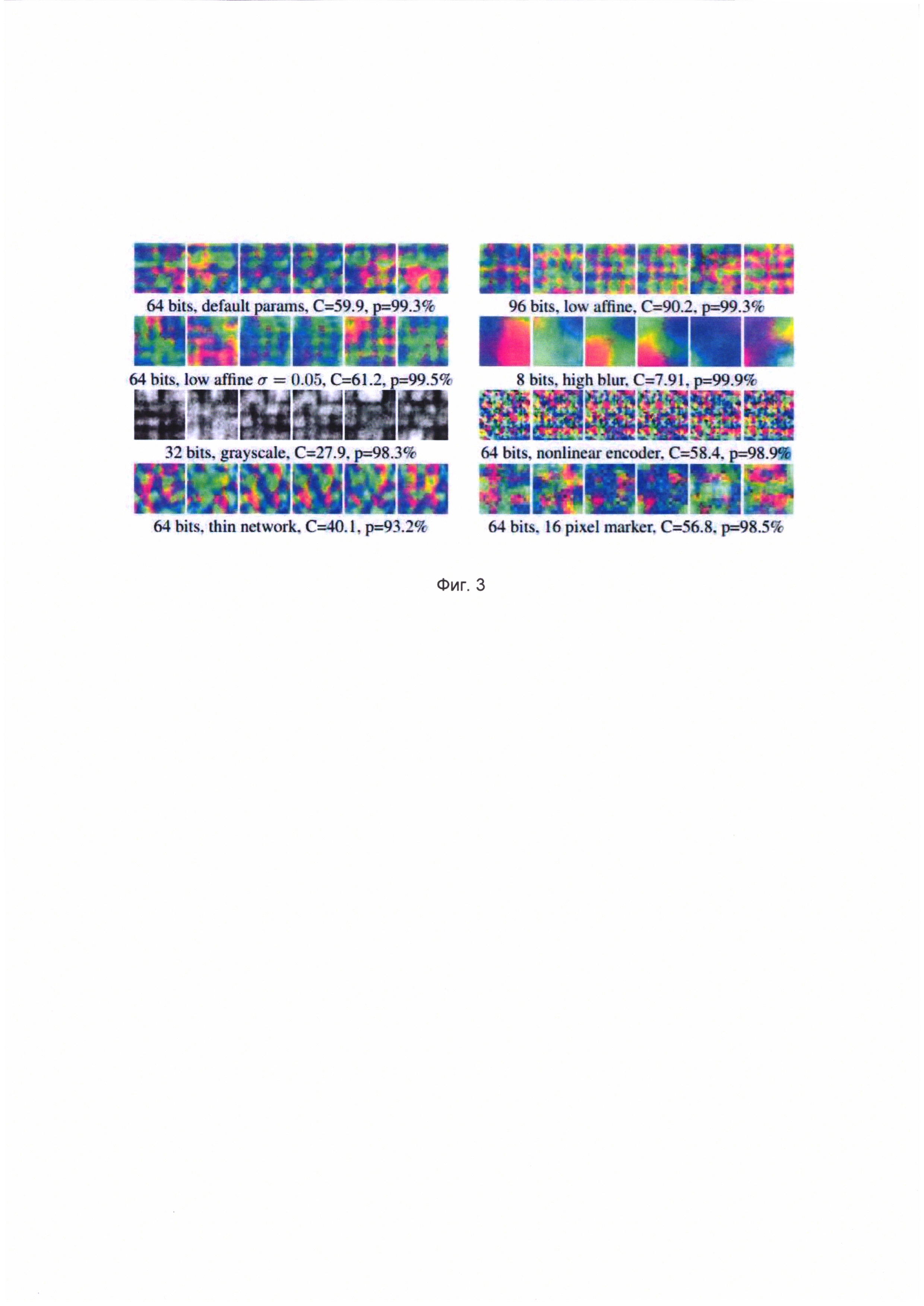 1. Способ продуцирования семейства визуальных маркеров, кодирующих информацию, включающий следующие шаги: - формируют синтезирующую нейронную сеть, переводящую последовательность бит в изображения визуальных маркеров; - формируют рендерную нейронную сеть, преобразующую входные изображения визуальных маркеров в изображения, содержащие визуальные маркеры посредством геометрических и фотометрических преобразований; - формируют распознающую нейронную сеть, переводящую изображения, содержащие визуальные маркеры, в последовательности бит; - обучают совместно синтезирующую, рендерную и распознающую нейронные сети путем минимизации функции потери, отражающей вероятность правильного распознавания случайных битовых последовательностей; - синтезируют визуальные маркеры путем пропускания битовых последовательностей через обученную синтезирующую нейронную сеть; - получают набор изображений визуальных маркеров из источника видеоданных; - извлекают из полученного набора изображений визуальных маркеров закодированные битовые последовательности посредством распознающей нейронной сети. 2. Способ по п. 1, характеризующийся тем, что рендерная нейронная сеть преобразует входные изображения визуальных маркеров в изображения, содержащие визуальные маркеры, помещенные в центр фонового изображения. 3. Способ по п. 1, характеризующийся тем, что синтезирующая нейронная сеть состоит из одного линейного слоя, за которым следует поэлементная сигмоидная функция. 4. Способ по п. 1, характеризующийся тем, что синтезирующая и/или распознающая нейронная сеть имеет сверточный вид. 5. Способ по п. 1, характеризующийся тем, что в процессе обучения в функционал оптимизации добавляется член, характеризующий эстетическую приемлемость маркеров. 6. Способ по п. 1, характеризующийся тем, что в процессе обучения в функционал оптимизации добавляется член, измеряющий соответствие маркеров визуальному стилю, заданному в виде изображения-образца. 7. Способ по п. 1, характеризующийся тем, что минимизация функции потерь выполняется с использованием алгоритма стохастического градиентного спуска. 8. Способ по п. 1, характеризующийся тем, что в процессе обучения битовая последовательность выбирается равномерно из Булевого куба. 9. Способ по п. 1, характеризующийся тем, что синтезирующая, рендерная, распознающая нейронная сеть является сетью прямого распространения. 10. Способ продуцирования семейства визуальных маркеров, кодирующих информацию, включающий следующие шаги: - создают переменные, соответствующие значениям пикселей создаваемых визуальных маркеров; - формируют рендерную нейронную сеть, преобразующую значения пикселей визуальных маркеров в изображения, содержащие визуальные маркеры посредством геометрических и фотометрических преобразований; - формируют распознающую нейронную сеть, переводящую изображения, содержащие визуальные маркеры, в последовательности бит; - обучают совместно синтезирующую, рендерную и распознающую нейронную сеть путем минимизации функции потери, отражающей вероятность правильного распознавания случайных битовых последовательностей; - синтезируют визуальные маркеры путем создания растровых изображений со значениями пикселей, найденными в результате обучения; - получают набор изображений визуальных маркеров 