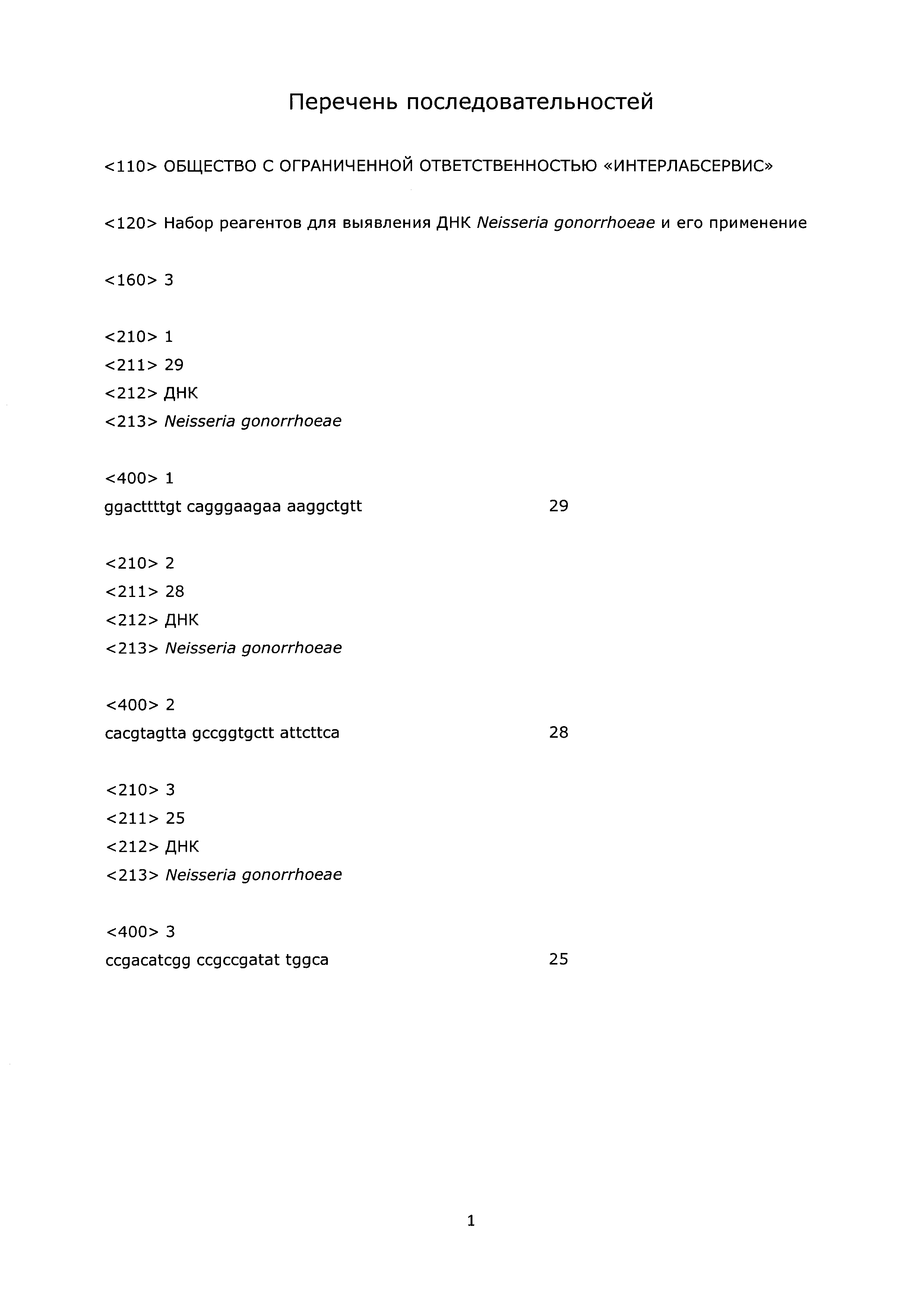 Область техники Группа изобретений относится к медицине, более конкретно к лабораторной диагностике и может быть использована для выявления ДНК Neisseria gonorrhoeae в биологических образцах. Уровень техники Neisseria gonorrhoeae (гонококк) - облигатный внутриклеточный бактериальный патоген человека. Гонококк является этиологическим агентом гонореи - инфекционного заболевания, передающегося половым путем. Гонорея является вторым по распространенности бактериальным инфекционным заболеванием, передающимся половым путем (после хламидиоза), инфицируя ежегодно свыше 60 миллионов человек [WHO. Global prevalence and incidence of selected curable sexually transmitted infections: overview and estimates. Geneva: World Health Organization, 2001]. Гонококки поражают преимущественно отделы урогенитального тракта, выстланные цилиндрическим эпителием: слизистые оболочки цервикального канала, уретры, парауретральные и/или большие вестибулярные железы. При попадании инфекции в урогенитальный тракт возможно развитие воспалительных заболеваний, таких как цервицит, уретрит, парауретрит, бартолинит. За пределами урогенитального тракта гонококки поражают слизистые оболочки глотки, прямой кишки, конъюнктиву и могут вызывать фарингит, тонзиллит, стоматит, проктит, конъюнктивит [Под ред. Савельевой Г.М., Бреусенко В.Г. Гинекология: Учебник. Москва, «ГЭОТАРМЕД», 2004]. Клинические симптомы гонореи могут иметь неспецифический характер, перекрываться с симптомами других инфекций, передающихся половым путем (ИППП). Более 50% случаев гонококковой инфекции цервикального канала имеют бессимптомное течение [Bignell С. et al. European Guideline on the Diagnosis and Treatment of Gonorrhoea in Adults, 2012]. Инфекции, протекающие бессимптомно, часто остаются не диагностированными и, следовательно, пациентам не назначается адекватная терапия в течение длительного периода времени. В отсутствие лечения гонорейная инфекция приводит к таким серьезным последствиям, как воспалительные заболевания органов малого таза у женщин, патология беременности, мужское и женское бесплодие, синдром хронической тазовой боли, конъюнктивит у новорожденных [WHO. Global prevalence and incidence of selected curable sexually transmitted infections: overview and estimates. Geneva: World Health Organization, 2001]. Кроме того, гонорея является одним из кофакторов передачи ВИЧ-инфекции [Verma et al. Diagnostic implications of 16S ribosomal assay for gonorrhoea. Sex Transm Infect. 2010 Nov; 86(6): 461-464]. В связи с затрудненной клинической диагностикой трудно переоценить важность надежной и эффективной лабораторной диагностики гонореи. Для выявления этиологического агента гонореи - гонококков - широко применяются традиционные методы лабораторной диагностики бактериальных инфекций - бактериоскопический (микроскопический) и бактериологический (культуральный). Микроскопическое исследование мазков, окрашенных метиленовым синим и по Граму, представляет собой простой и быстрый метод выявления гонококков. Однако метод субъективен, обладает низкой чувствительностью (45-80%) и специфичностью (38%), особенно при наличии обильной сопутствующей микрофлоры [Под ред. Савельевой Г.М., Бреусенко В.Г. Гинекология: Учебник. Москва, «ГЭОТАРМЕД», 2004]. «Золотым стандартом» диагностики гонореи в большинстве стран мира остается бактериологический (культуральный) метод, обладающий высокой специфичностью. Однако культуральный метод требует наличия живых микроорганизмов в анализируемом образце, а гонококки являются микроорганизмами с 