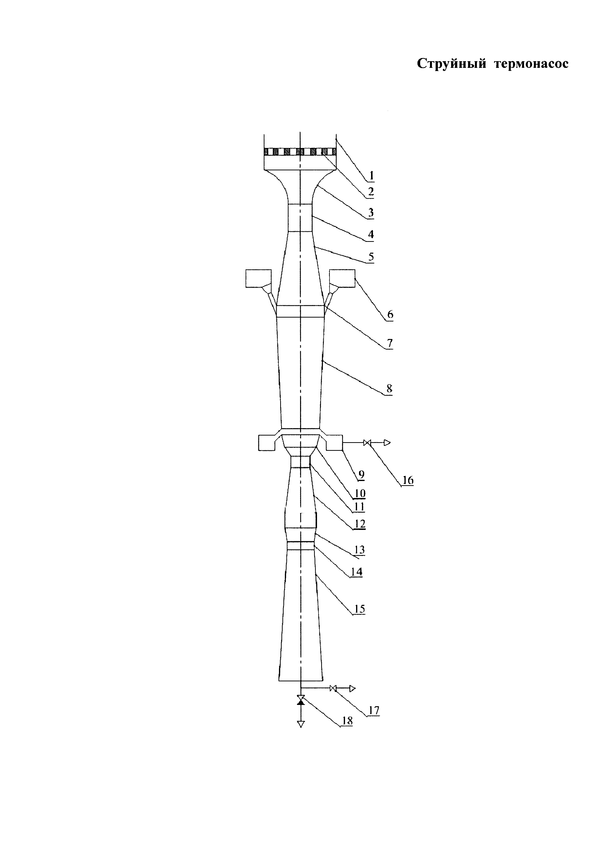 1. Струйный термонасос, проточная часть которого содержит сопло для активной среды, включающее конфузор, горловину и расширяющийся участок, выполненную в виде конфузора камеру смешения с профилированными отверстиями для подачи питательной воды, сверхзвуковой диффузор, состоящий из конфузора, горловины и расширяющегося участка, и дозвуковой диффузор, отличающийся тем, что конфузор сверхзвукового диффузора выполнен с переменным углом конусности, при этом величина угла выбрана от 10° до 15° на входе в конфузор и от 20° до 35° на выходе из конфузора. 2. Термонасос по п. 1, отличающийся тем, что проточная часть дополнительно содержит конфузор и горловину, которые расположены между расширяющимся участком сверхзвукового диффузора и дозвуковым диффузором. 3. Термонасос по п. 1, отличающийся тем, что горловина сопла для активной среды выполнена с длиной, выбранной в пределах от 3 до 4 диаметров горловины сопла для активной среды.