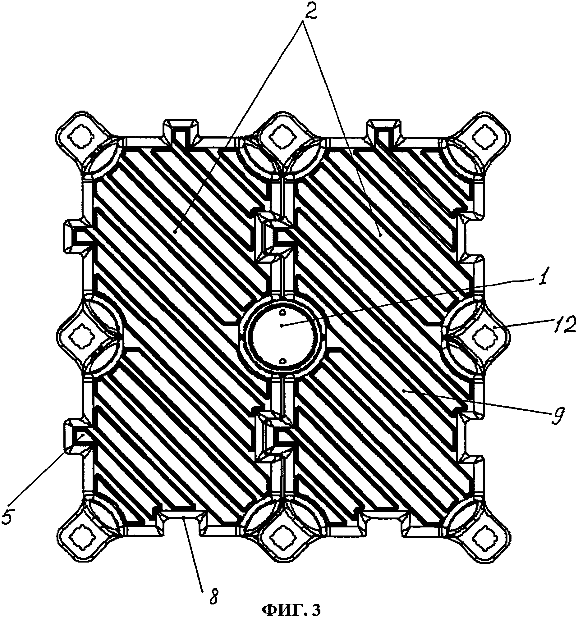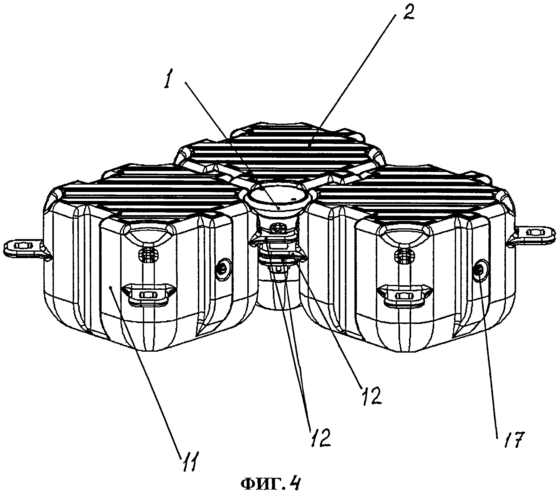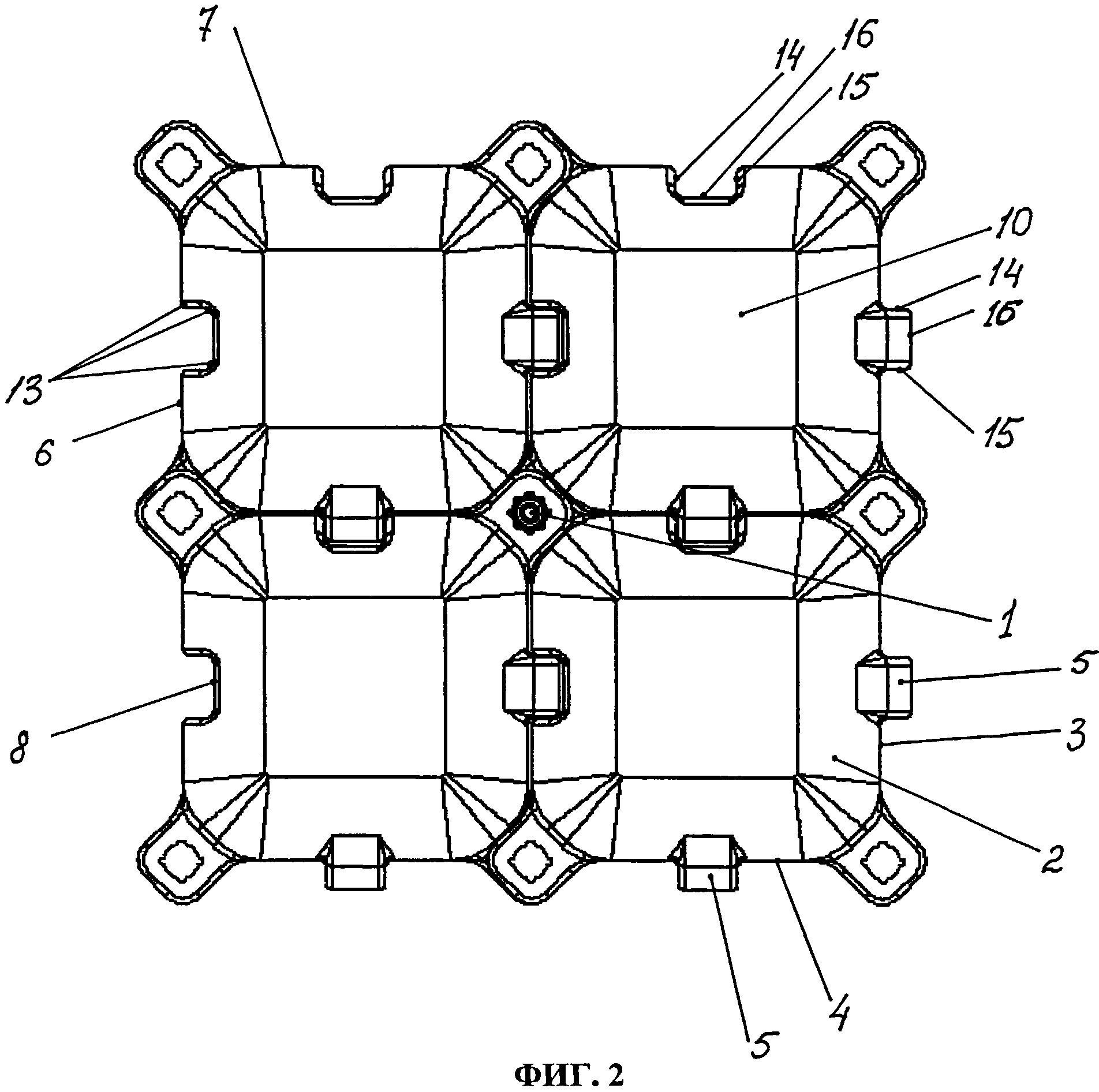 Изобретение относится к плавучим средствам, предназначенным для специальных целей, а именно к понтонам, плавучим докам, плотам и другим плавучим сооружениям. Наиболее близкой по технической сущности к предлагаемому изобретению является выбранная в качестве прототипа плавучая платформа, содержащая соединенные по крайней мере одним элементом крепления по крайней мере два плавучих элемента, состоящих из по крайней мере двух боковых граней с по крайней мере одним вертикальным выступом на одной из них и с по крайней мере одним вертикальным выступом на другой, из по крайней мере двух боковых граней с по крайней мере одной вертикальной впадиной на одной из них и с по крайней мере одной вертикальной впадиной на другой, соответствующей вертикальному выступу, из верхней грани и днища, образующих вместе пустотелый корпус соответствующего плавучего элемента с по крайней мере одной проушиной для размещения элемента крепления (патент РФ №2322549 от 30.09.2005 г.). Недостатками прототипа являются ненадежность конструкции из-за повышенных нагрузок на проушины при перекосах плавучих элементов платформы вследствие их ненадежной фиксации из-за возникающих сил, приводящих к взаимному перемещению волнообразных или угловых выступов относительно волнообразных или угловых впадин при их взаимодействии, и из-за недостаточной жесткости боковых граней пустотелых корпусов. Технический результат, достигаемый предлагаемым изобретением, заключается в снижении нагрузки на проушины путем улучшения фиксации плавучих элементов в составе плавучей платформы за счет отсутствия сил, приводящих к взаимному перемещению прямоугольных выступов относительно прямоугольных впадин при их взаимодействии во время фиксации, и в увеличении жесткости боковых граней пустотелых корпусов плавучих элементов, что приводит к повышению надежности конструкции в целом и расширению эксплуатационных возможностей за счет увеличения внешней нагрузки на плавучую платформу при сохранении материалоемкости или уменьшению материалоемкости (толщины стенок пустотелых корпусов и проушин) при сохранении внешней нагрузки. Поставленный технический результат достигается тем, что в плавучей платформе, содержащей соединенные по крайней мере одним элементом крепления по крайней мере два плавучих элемента, состоящих из по крайней мере двух боковых граней с по крайней мере одним вертикальным выступом на одной из них и с по крайней мере одним вертикальным выступом на другой, из по крайней мере двух боковых граней с по крайней мере одной вертикальной впадиной на одной из них и с по крайней мере одной вертикальной впадиной на другой, соответствующей вертикальному выступу, из верхней грани и днища, образующих вместе пустотелый корпус соответствующего плавучего элемента с по крайней мере одной проушиной для размещения элемента крепления, каждый вертикальный выступ и соответствующая вертикальная впадина образованы по крайней мере тремя гранями, две из которых параллельны друг другу и перпендикулярны третьей. На фиг.1 изображена плавучая платформа, состоящая из четырех плавучих элементов, общий вид в изометрии, на фиг.2 - та же плавучая платформа, вид снизу, на фиг.3 - плавучая платформа, состоящая из двух плавучих элементов, вид сверху, на фиг.4 - соединение трех плавучих элементов э