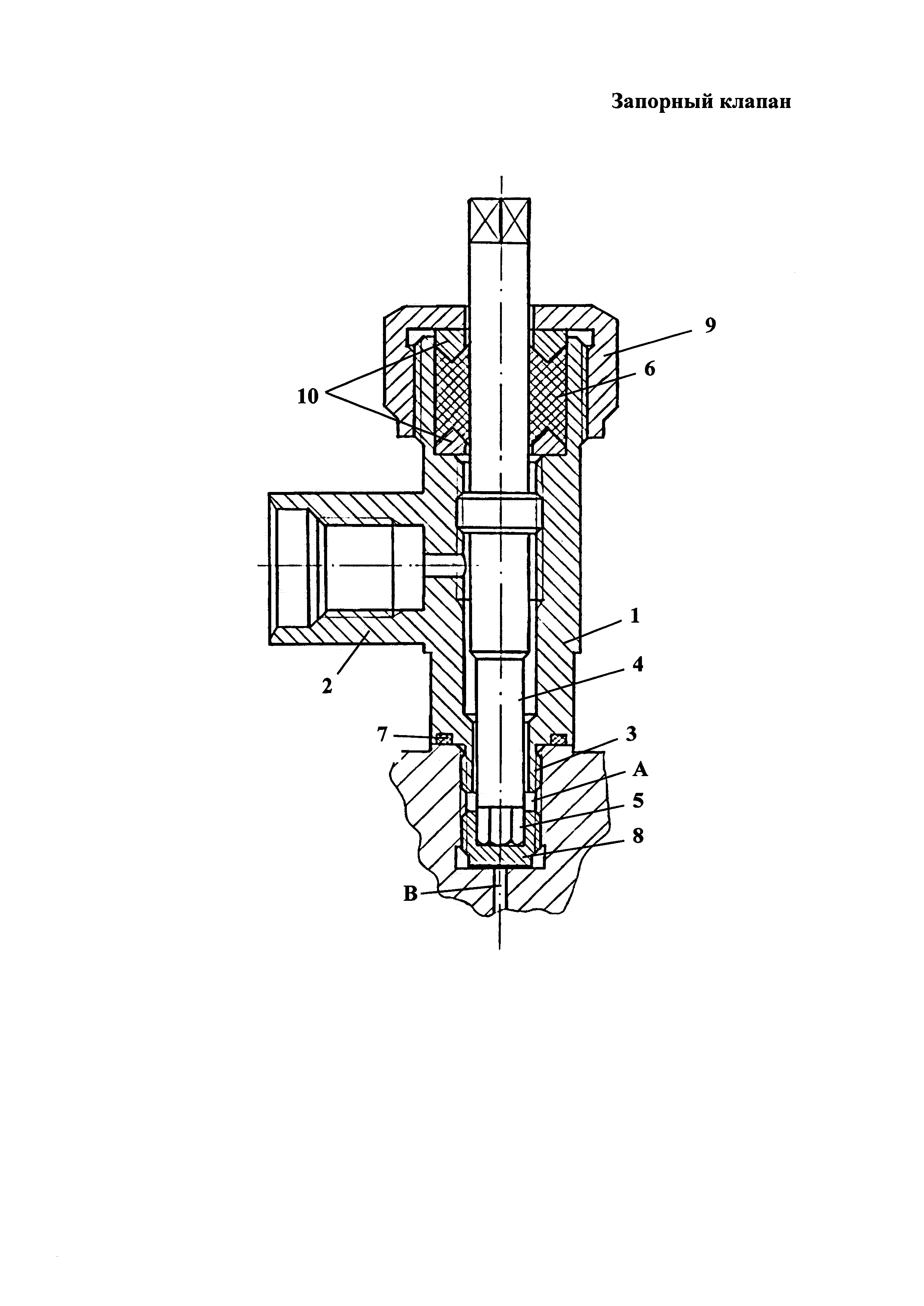 Изобретение относится к криогенной технике и предназначено для перекрытия при вакуумировании и для заправки газообразным криоагентом охладителей. Известен запорный клапан - вентиль запорный (каталог «Микрокриогенная техника», М.: ЦИНТИХИМНЕФТЕМАШ, 1972, стр. 26), содержащий корпус с седлом, шток, выполненный заодно с конусным запирающим элементом, сальниковое уплотнение штока (манжета). Основной недостаток такого вентиля заключается в том, что его нельзя отсоединять после заправки от заправляемого объекта, т.к. запирающий элемент и седло расположены в корпусе самого вентиля. Наиболее близким по технической сущности к предложенному техническому решению является запорный затвор фирмы Leybold (DE), применяющийся для перекрытия откачанного объекта (А. Рот. Вакуумные уплотнения. - М, 1971, стр. 381-382, рис. 6-90), основными частями которого являются корпус и патрубок с фланцем, герметично монтируемый на откачиваемый объект. Корпус затвора имеет два присоединительных патрубка с фланцами (один - для подключения к вакуумному посту, другой - для присоединения к откачиваемому объекту через монтируемый на нем патрубок с фланцем), шток с выполненным на его конце ключом, сальниковое уплотнение штока. В смонтированный на откачиваемый объект патрубок с фланцем вворачивают имеющую углубление под ключ резьбовую втулку с установленным на ней запирающим элементом, ключ осевым усилием на шток вдвигают в углубление втулки, фланцы патрубков корпуса и объекта соединяют между собой через уплотнительное кольцо хомутом, обеспечивая их соосность, проводят операцию вакуумирования, затем, завернув до упора штоком резьбовую втулку, перекрывают запирающим элементом проходное сечение в патрубке объекта, после чего корпус запорного затвора со штоком отсоединяют от объекта. К недостаткам данной конструкции относятся: - применение фланцевых соединений, которые препятствуют миниатюризации как самого затвора, так и объекта, к которому затвор присоединяется; - малое рабочее давление ~0,25 МПа (www.oerlikon.com, Catalog Part Leybold Worldwide, Edition 2013, p. 40), которое не позволяет использовать подобные затворы для заправки охладителей; - необходимость вручную прилагать осевое усилие на шток для преодоления трения штока в сальниковом уплотнении при совмещении ключа штока с углублением втулки. Задачей, на решение которой направлено заявляемое техническое решение, является уменьшение размеров запорного клапана, а также повышение рабочего давления. Поставленная задача решается тем, что в запорном клапане, содержащем корпус с двумя присоединительными патрубками, шток с выполненным на его конце ключом, сальниковое уплотнение штока, кольцо уплотнительное, запирающий элемент с резьбой и углублением под ключ, устанавливаемый в резьбовое заправочное отверстие охладителя, один присоединительный патрубок выполнен в виде муфты, второй - в виде штуцера, часть штока и корпуса выполнена в виде резьбового соединения с шагом резьбы, равным шагу резьбы заправочного отверстия охладителя, а резьба штуцера, равная резьбе заправочного отверстия охладителя, выполнена соосно резьбовому соединению. На фиг. изображен предложенный запорный клапан. Запорный клапан содержит корпус 1 с двумя присоединительными патрубками, один из которых выполнен в виде муфты 2 для присоединения к заправочному стенду (на чертеж