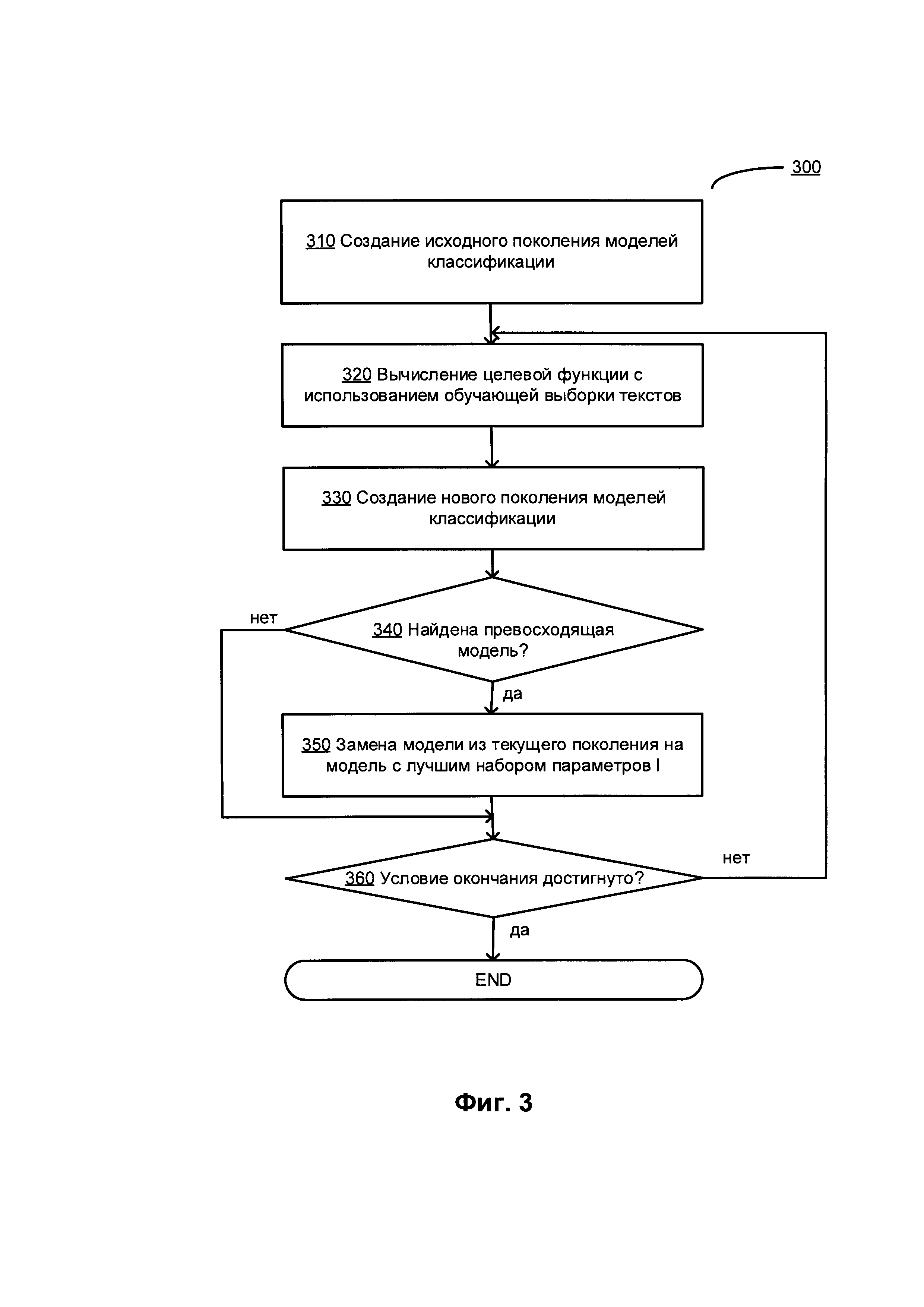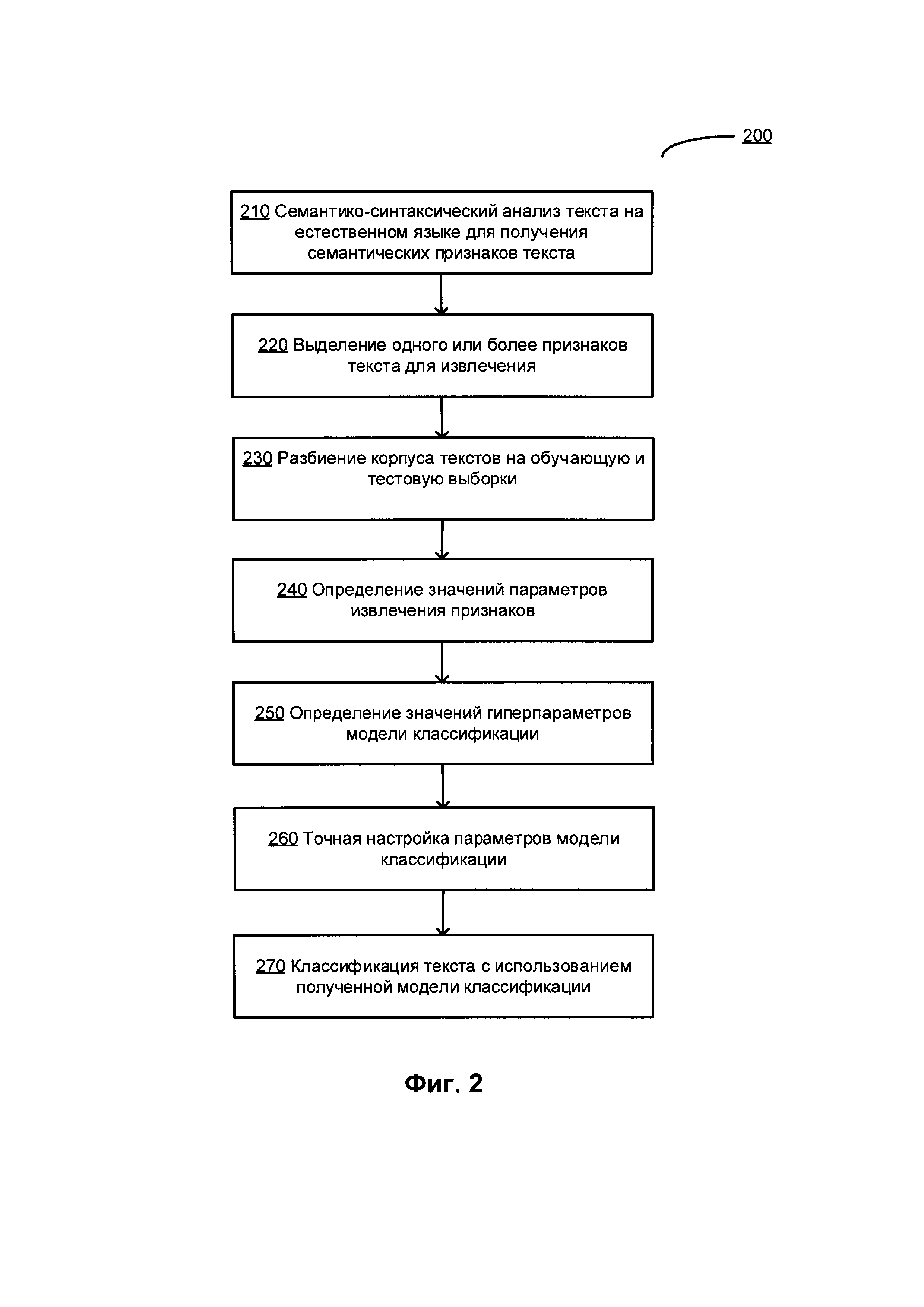 1. Выполняемый компьютерной системой способ подбора параметров текстового классификатора, включающий: выполнение с помощью устройства обработки семантико-синтаксического анализа текста на естественном языке из корпуса текстов на естественном языке для создания семантической структуры, представляющей набор семантических классов; выявление признака текста на естественном языке, извлекаемого на основе набора значений из множества параметров извлечения признаков; разделение корпуса текстов на естественном языке на обучающую выборку данных, включающую первое множество текстов на естественном языке, и тестовую выборку, включающую второе множество текстов на естественном языке; определение набора значений параметров извлечения признаков с учетом категории обучающей выборки; оценка полученного набора значений параметров извлечения признаков с помощью тестовой выборки. 2. Способ по п. 1, отличающийся тем, что разделение корпуса текстов на естественном языке включает перекрестную проверку первого множества текстов на естественном языке и второго множества текстов на естественном языке. 3. Способ по п. 1, отличающийся тем, что при оценке полученного наборов значений параметров извлечения признаков создается квазиоптимальный набор значений для третьего множества текстов на естественном языке. 4. Способ по п. 1, отличающийся тем, что параметр извлечения признаков из множества параметров извлечения признаков содержит, по меньшей мере, одно из следующего: ряд уровней анализируемой семантической иерархии, идентификатор семантического класса, экземпляры которого должны быть выявлены в тексте на естественном языке, или значение определенного признака семантического класса, который должен быть связан с экземпляром семантического класса. 5. Способ по п. 1, дополнительно включающий: классификацию исходного текста на естественном языке путем применения модели классификатора текста. 6. Способ по п. 5, отличающийся тем, что классификация исходного текста на естественном языке дополнительно включает: создание с помощью модели классификатора текста множества значений, каждое из которых отражает степень соотнесения исходного текста на естественном языке с конкретной категорией текстов на естественном языке; соотнесение исходного текста на естественном языке с категорией, соответствующей оптимальному значению из множества значений. 7. Способ по п. 1, отличающийся тем, что определение набора значений параметров извлечения признаков дополнительно включает: оптимизацию указанной целевой функции. 8. Способ по п. 7, отличающийся тем, что целевая функция определяет количество текстов на естественном языке из тестовой выборки, которые были правильно классифицированы с помощью набора значений указанных параметров модели классификатора текста. 9. Способ подбора параметров текстового классификатора, включающий: выполнение с помощью устройства обработки семантико-синтаксического анализа текста на естественном языке из корпуса текстов на естественном языке для создания семантической структуры, представляющей набор семантических классов; выявление модели классификатора текста, связанной с набором значений из множества гиперпараметров; разделение корпуса текстов на естественном языке на обучающую выборку, включающую перво