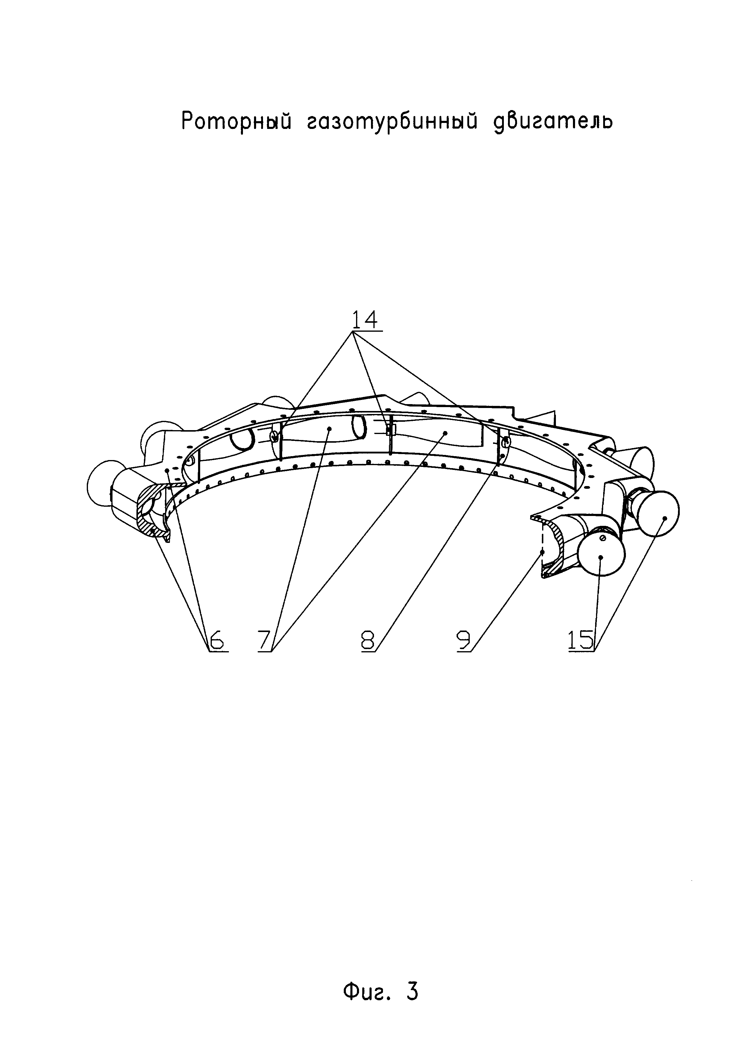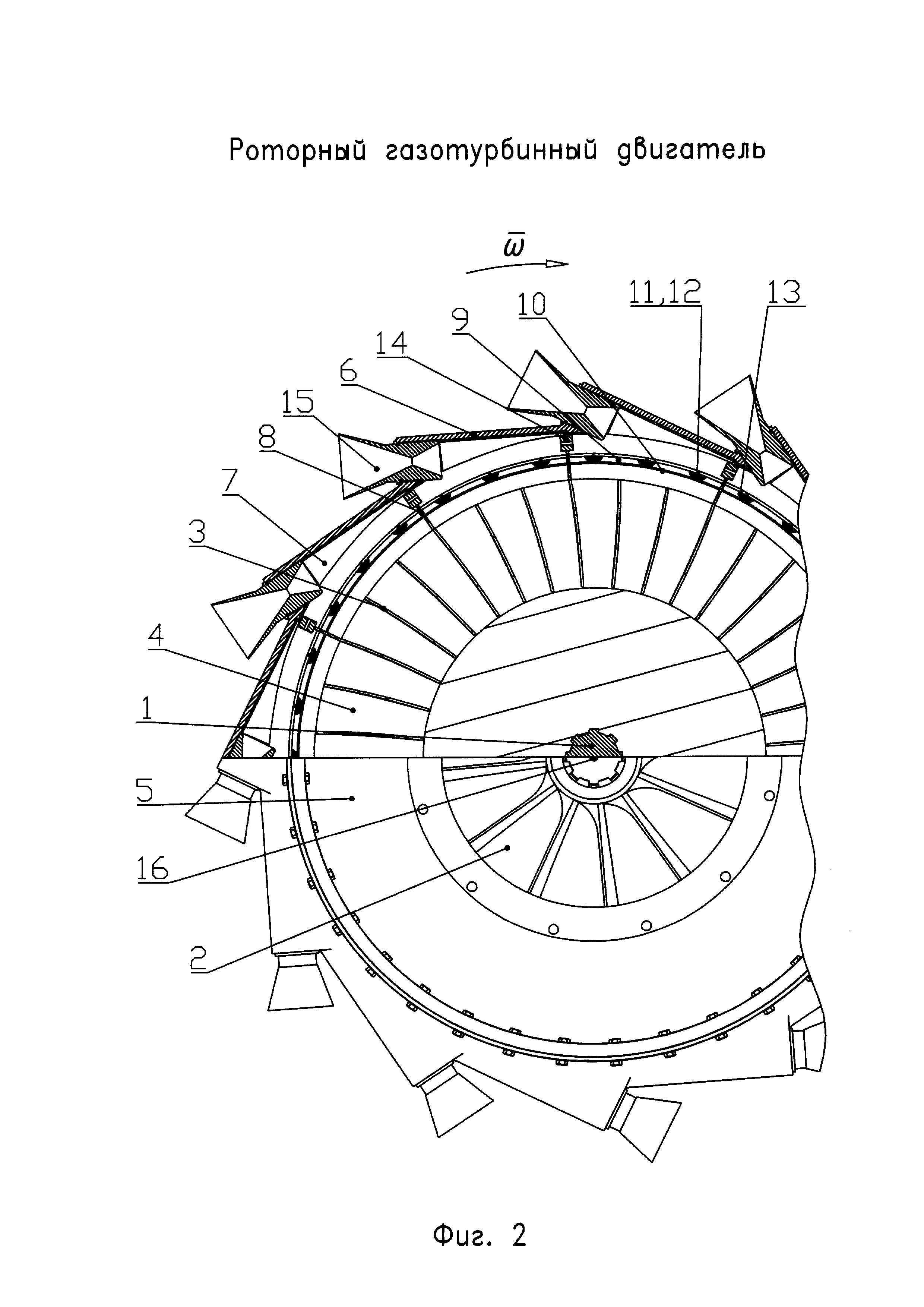 Роторный газотурбинный двигатель содержит жестко установленное на валу центробежное рабочее колесо с центробежными каналами, обеспечивающее сжатие поступающего в него окислительного рабочего тела, установленную коаксиально с ним камеру сгорания торообразной формы с тангенциально расположенными на ней соплами, обеспечивающими создание импульса реактивной силы от истекающих через сопла продуктов сгорания смеси горючего и окислительного рабочего тела для вращения рабочего колеса и камеры сгорания, средства подачи горючего рабочего тела и средства зажигания смеси горючего и окислительного рабочего тела. Внутренняя полость корпуса камеры сгорания разделена на отдельные камеры сгорания жестко закрепленными поперечными перегородками, которые являются продолжением лопаток рабочего колеса, и закреплены с образованием входных отверстий в отдельные камеры сгорания. Выходные отверстия центробежных каналов открыты в полости отдельных камер сгорания через входные отверстия. По меньшей мере по одному выходному отверстию центробежного канала открыто в полость каждой отдельной камеры сгорания, снабженной по меньшей мере одним соплом, выполненным сверхзвуковым, в виде круглого или плоского сопла Лаваля. Центральная ось сопла на его входе совпадает по направлению с центральной осью отдельной камеры сгорания на ее выходе. Отдельные камеры сгорания снабжены средствами подачи горючего рабочего тела, и средствами зажигания, размещенными в каждой поперечной перегородке, и обеспечивающими одновременное воспламенение смеси горючего и окислительного рабочего тела в примыкающих друг к другу отдельных камерах сгорания. Между центробежным рабочим колесом и отдельными камерами сгорания установлено средство дросселирования, обеспечивающее заданные расходные и термодинамические параметры сжатых потоков окислительного рабочего тела на входе в каждую отдельную камеру сгорания. Техническим результатом заявляемого изобретения является повышение эффективности и надежности работы роторного газотурбинного двигателя за счет организации устойчивого и эффективного горения топливо-воздушной смеси. 7 з.п. ф-лы, 3 ил.