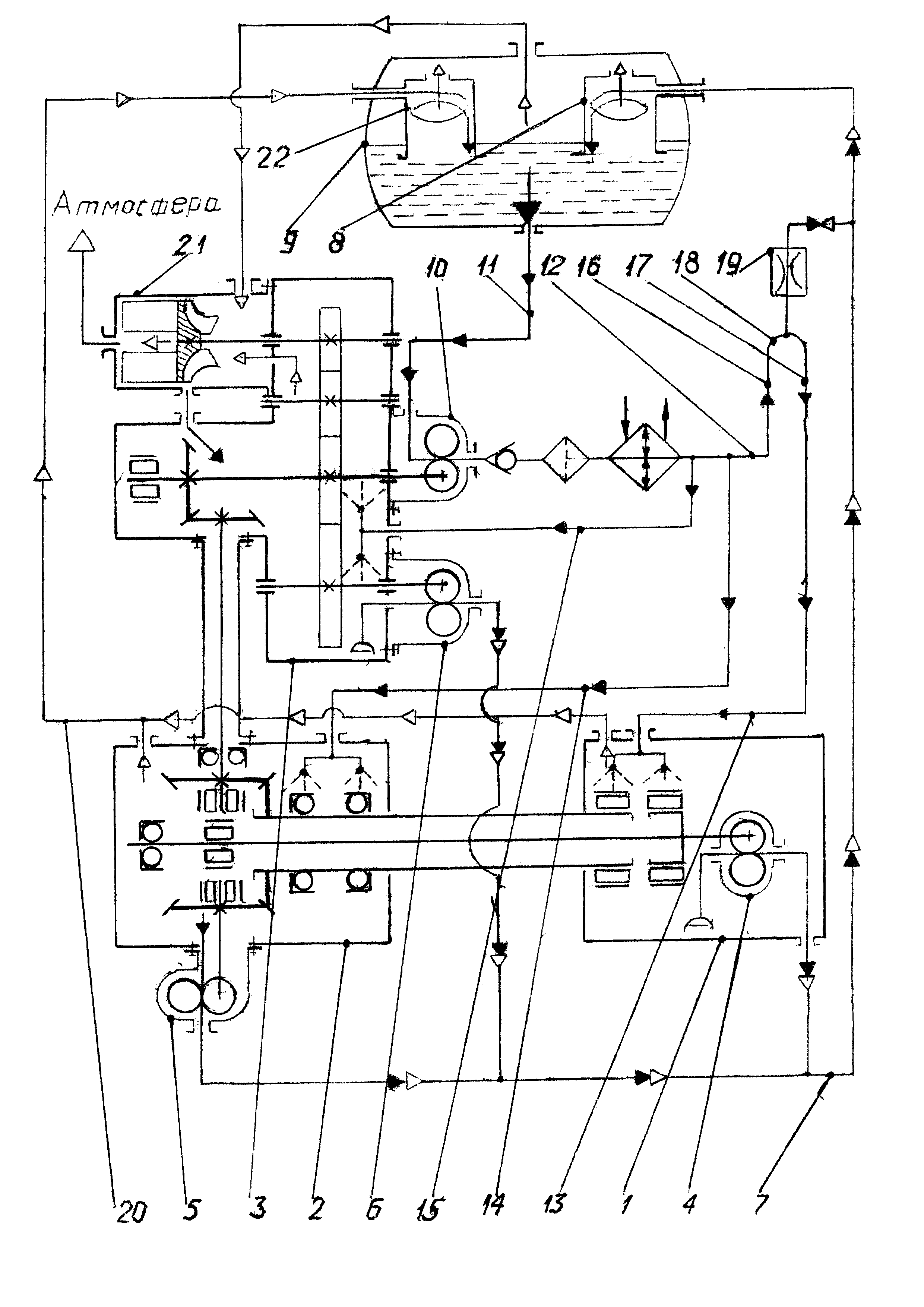 Маслосистема газотурбинного двигателя, содержащая магистраль нагнетания с подстыкованными к ней магистралями подвода масла к масляным полостям подшипников ротора компрессора, турбины и коробки привода агрегатов, магистраль откачки масла и сообщенный с магистралями нагнетания и подвода масла сифонный затвор с восходящей и нисходящей ветвями и жиклером стравливания воздуха в петле затвора, отличающаяся тем, что магистрали подвода масла к масляным полостям подшипников ротора компрессора и коробки привода агрегатов сообщены с восходящей ветвью сифонного затвора, а магистраль подвода масла в масляную полость подшипника турбины сообщена с нисходящей ветвью сифонного затвора, причем жиклер стравливания воздуха сообщен с магистралью откачки масла.