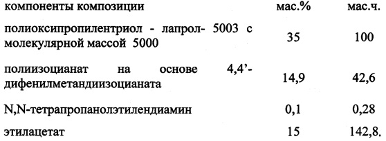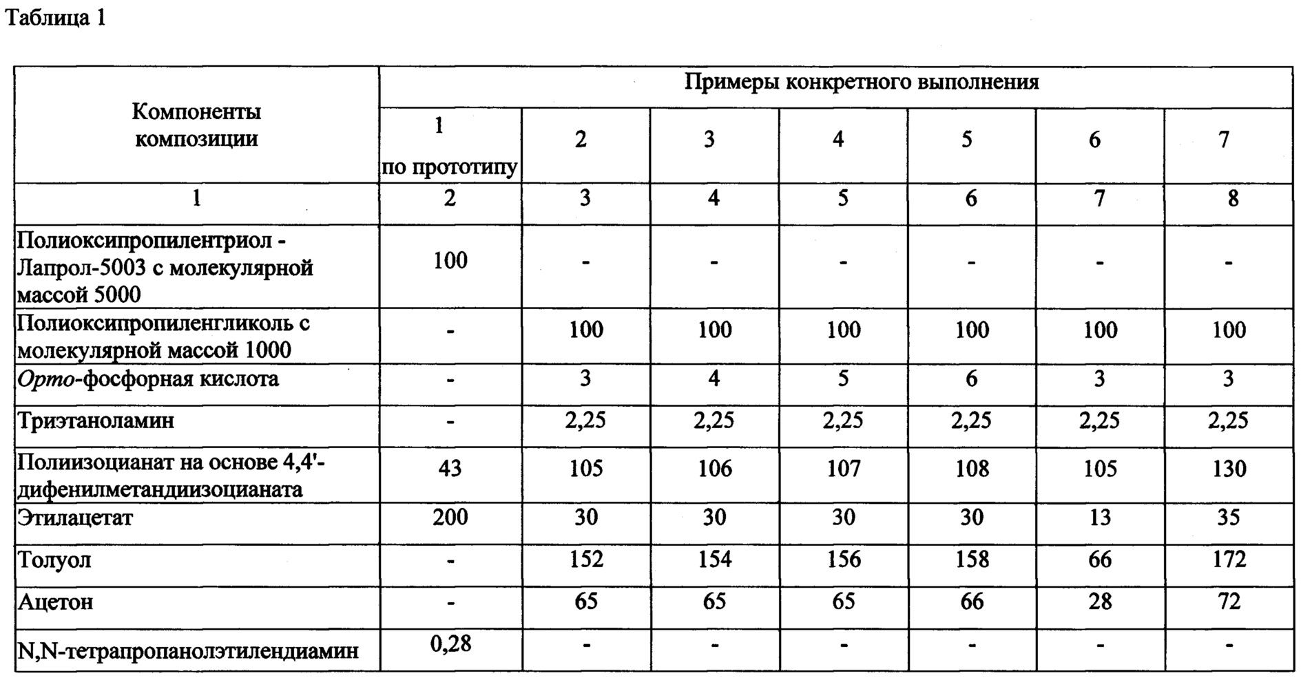 полиоксипропиленгликоль с молекулярной массой 1000 100 триэтаноламин 2,25 opто-фосфорная кислота 3. этилацетат 105 толуол 30 ацетон 152. полиизоцианат на основе 4,4'-дифенилметандиизоцианата 105