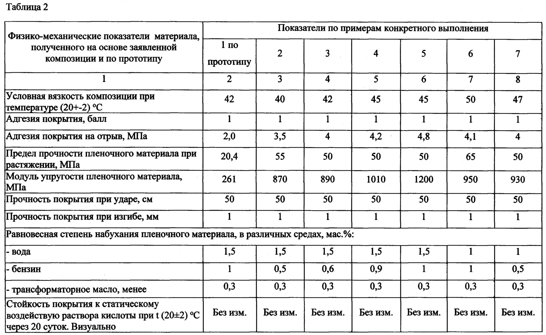 Изобретение относится к составу полиуретановых защитных композиций для получения покрытий и может быть использовано для защиты металлических, бетонных, железобетонных, деревянных поверхностей строительных конструкций от коррозии и воздействия агрессивных сред. Полиуретановая защитная композиция содержит полиоксипропиленгликоль с молекулярной массой 1000, полиизоцианат на основе 4,4'-дифенилметандиизоцианата, триэтаноламин, ортофосфорную кислоту, толуол, ацетон. Изобретение позволяет увеличить в 2,0-2,4 раза адгезию покрытия на отрыв, в 2,4-3,0 раза передел прочности пленочного материала при растяжении, до 3,5-4,5 раза модуль упругости пленочного материала на основе полиуретановой защитной композиции. 2 табл.