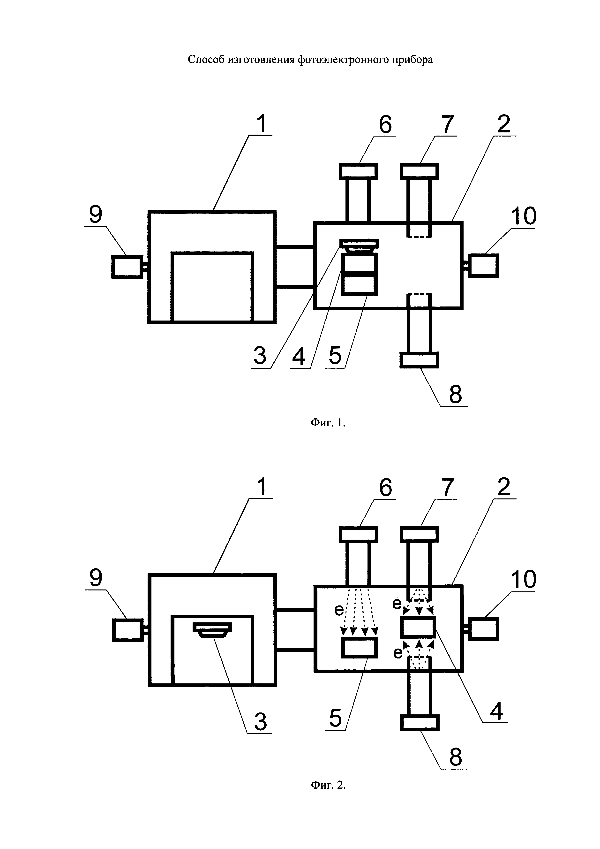 Способ изготовления фотоэлектронного прибора, включающий изготовление корпуса прибора, катодного узла, коллектора электронов, монтаж внутренних деталей и узлов, сварку узлов прибора, загрузку всех узлов в высоковакуумную установку финишной сборки, откачку всей системы, термическое обезгаживание всех узлов в вакууме, электронное обезгаживание МКП и коллектора электронов в вакууме, изготовление фотокатода на катодном узле, герметизацию прибора, выгрузку ФЭП из установки финишной сборки, отличающийся тем, что после загрузки в высоковакуумную установку финишной сборки катодного узла, корпуса с микроканальными пластинами и коллектора электронов, корпус с МКП и коллектор электронов разносят друг от друга и осуществляют откачку всей системы до давления не более 10-8 Па, термическое обезгаживание всех узлов в вакууме в течение не менее 4 ч при температуре от 300 до 400°C, раздельно выполняют одностороннее электронное обезгаживание в течение не менее 2 ч при температуре от 0 до 400°C коллектора электронов направленным на него потоком электронов и двустороннее электронное обезгаживание МКП при той же температуре, для чего в течение не менее 2 ч попеременно включают и выключают источники возбуждения вторичных электронов в МКП, расположенные перед входом и выходом МКП, и тем самым электронный поток направляют от входа к выходу МКП и, наоборот, от выхода к входу МКП, синхронно меняя полярность напряжения питания между входом и выходом МКП и постепенно увеличивая напряжение на МКП и выходной ток МКП до значений, не ухудшающих параметры МКП, после чего формируют фотокатод на катодном узле и далее корпус с МКП устанавливают на коллектор электронов, а катодный узел - на корпус, и выполняют герметизацию прибора.