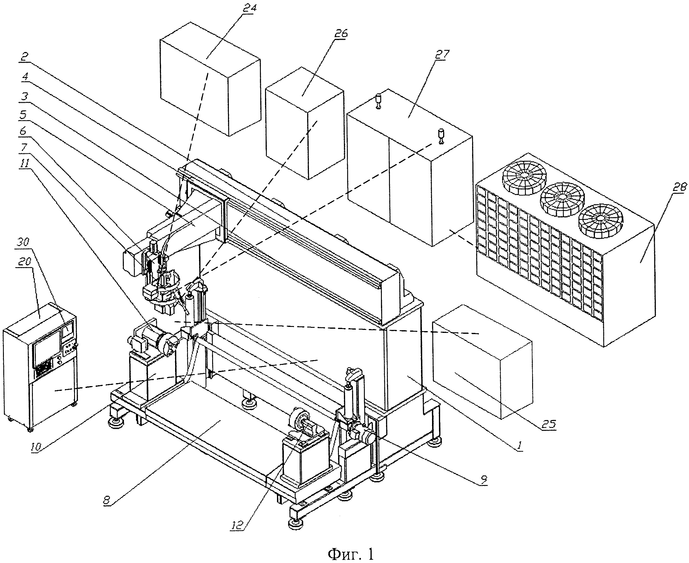 Изобретение относится к сварочному оборудованию, а именно к комбинированным (гибридным) лазерно-дуговым установкам, предназначенным для сварки деталей из жаропрочных сталей и химически активных металлов в среде защитных газов, и может быть использовано в ракетно-космической отрасли, судостроении и других отраслях промышленности. Известна машина для комбинированной лазерно-дуговой сварки, состоящая из сварочной головки, лазера, смонтированного на плите, горелки, ось которой наклонена под углом (25-45°) к оси лазерного излучения. Ось лазерного излучения направлена под углом 90° к поверхности детали. Зазор между торцом сварочной проволоки, выходящей из горелки, и фокусным пятном лазерного излучения на поверхности детали составляет 0-4 мм (см. заявка WO 138038, РСТ/АТ00/00312, 2001 г.). В результате анализа конструкции данной машины установлено, что она не позволяет выполнять сварку соединений с криволинейным сварным стыком по причине отсутствия в составе установки системы слежения за свариваемым стыком, что значительно ограничивает ее функциональные возможности. Известна машина для комбинированной лазерно-дуговой сварки, отличительной особенностью которой является то, что в ее составе есть устройство оптимизации энергетического баланса, позволяющее управлять энергией лазерного луча в зависимости от энергии сварочной дуги (WO 2006063374 А1). Однако в данной конструкции не предусмотрена система подготовки свариваемых кромок, что в значительной степени снижает качество свариваемых деталей и производительность процесса. Известен автомат для лазерно-дуговой сварки, содержащий платформу с установленными на ней вертикальными направляющими, посредством которых при помощи роликов осуществляется относительное позиционирование автомата и свариваемого изделия, после чего автомат фиксируется на полу с помощью домкратов и жестко крепится к изделию верхними и нижними зажимами, например струбцинами. Автомат оснащен ходовой тележкой, обеспечивающей перемещение установленной на ней каретки по вертикальным направляющим на рабочей и маршевой скорости. Каретка, на которую установлены механизм поперечного колебания сварочной головки и механизм подачи сварочной проволоки с кассетой, снабжена сервоприводами, которые по информации от системы слежения за свариваемым стыком, обеспечивают поперечное перемещение в процессе сварки лазерной и дуговой головок по линии стыка с постоянным контролем расстояния до поверхности свариваемого изделия. В конструкции каретки предусмотрены кронштейны для перестановки лазерной головки, сварочной головки и системы наведения на сварочный стык для обеспечения быстрой переналадки автомата для проведения процесса вертикальной сварки сверху вниз, либо снизу вверх. Система управления автомата для лазерно-дуговой сварки представляет собой распределенную вычислительную управляющую систему, выполняющую функцию автоматического управления всеми технологическими компонентами и имеющую в своем составе систему наведения на сварочный стык, содержащую триангуляционный лазерный сканер, закрепленный на сварочной головке и обеспечивающий контроль за положением и параметрами свариваемого стыка, а также за поддержанием заданного расстояния между лазерной и дуговой сварочными головками и свариваемой поверхнос