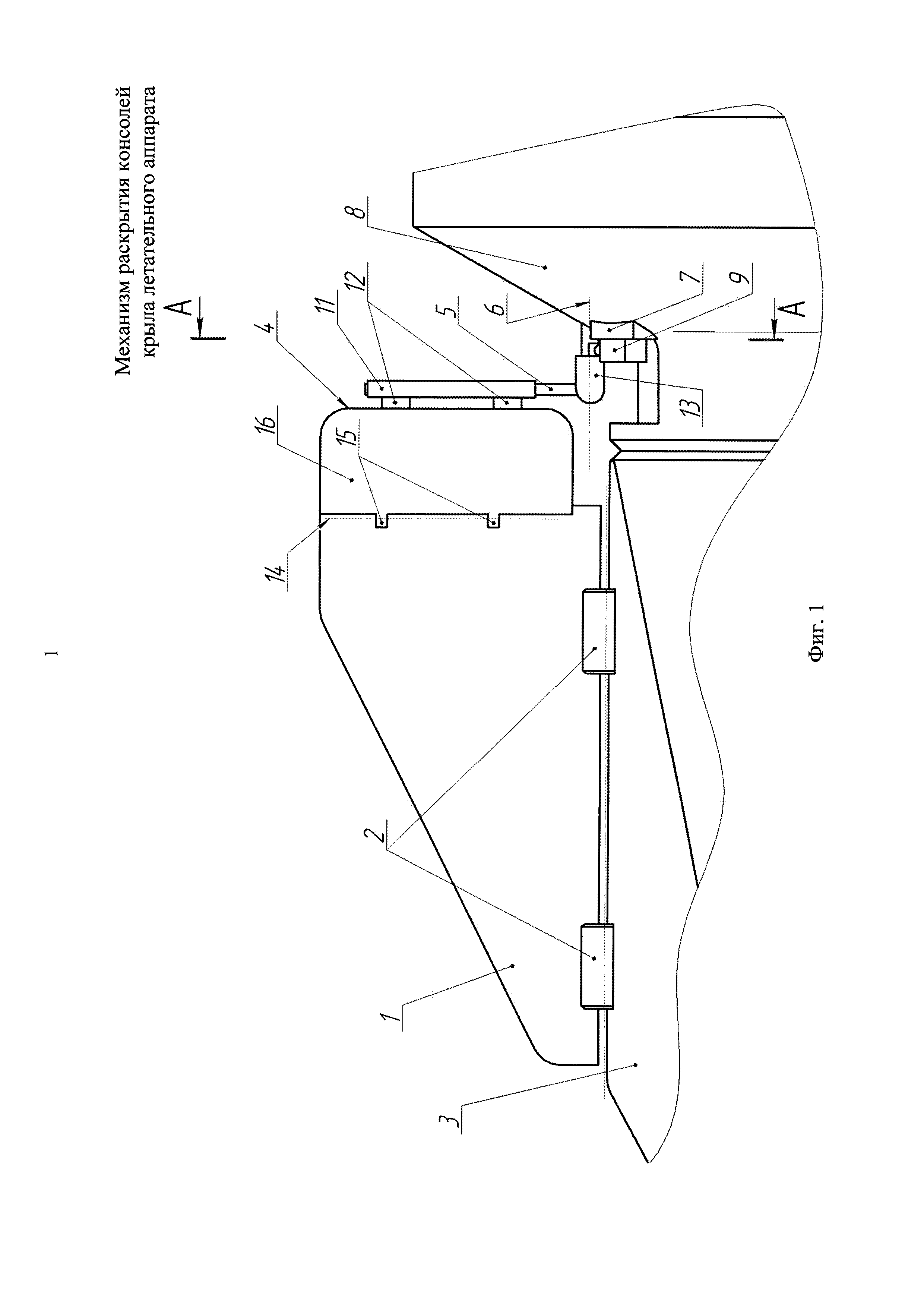 Механизм раскрытия консолей крыла летательного аппарата, состоящий из фиксируемого в раскрытом положении, шарнирно закрепленного на корпусе ракеты крыла и механизма раскрытия крыла с приводом, автономно установленных на разных ступенях ракеты, отличающийся тем, что механизм раскрытия крыла выполнен в виде Т-образно вращающихся стержней, установленных перпендикулярно друг к другу, один из которых имеет возможность перемещаться вдоль оси другого и вдоль консоли крыла, а второй закреплен шарнирно на другой ступени ракеты.