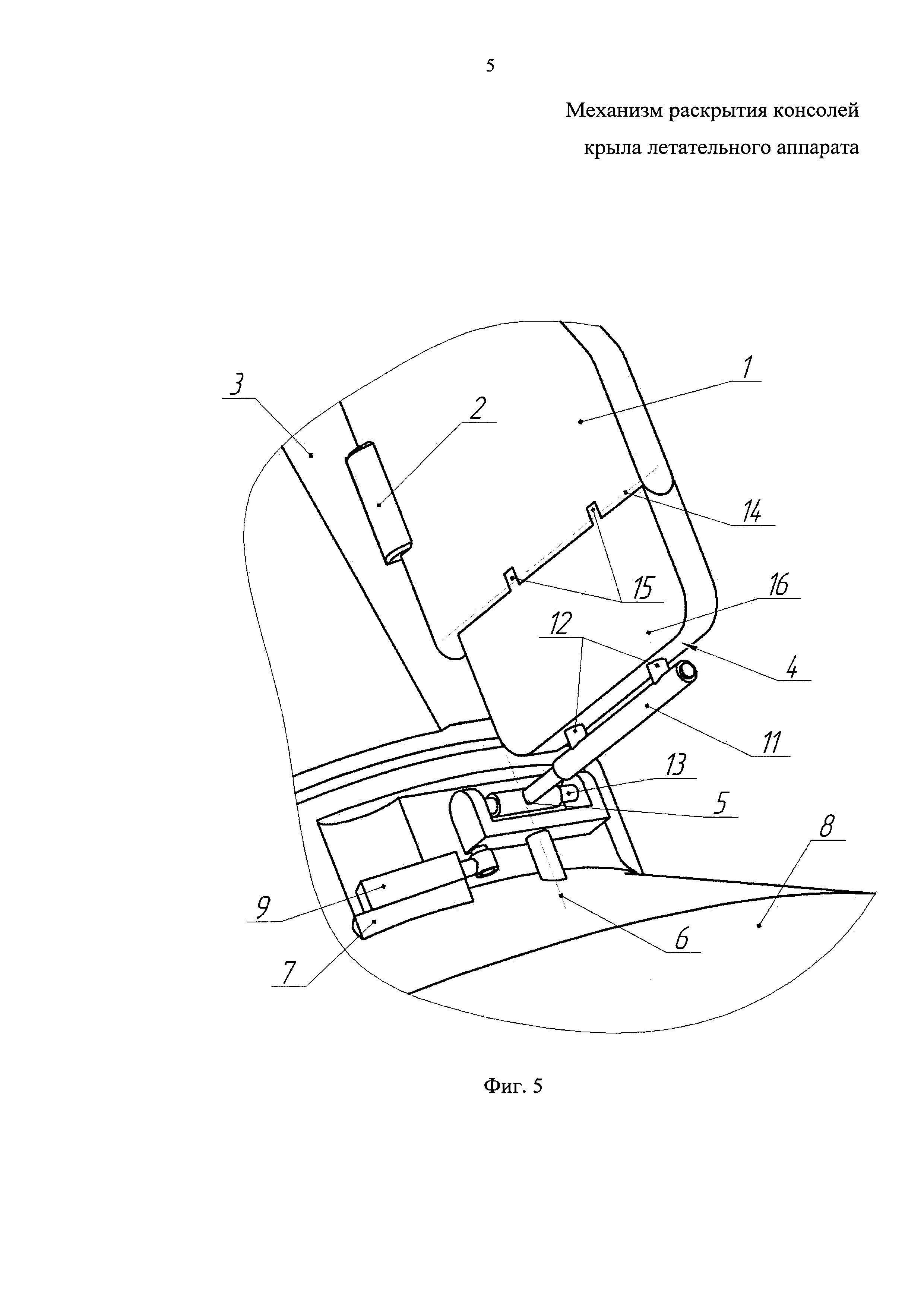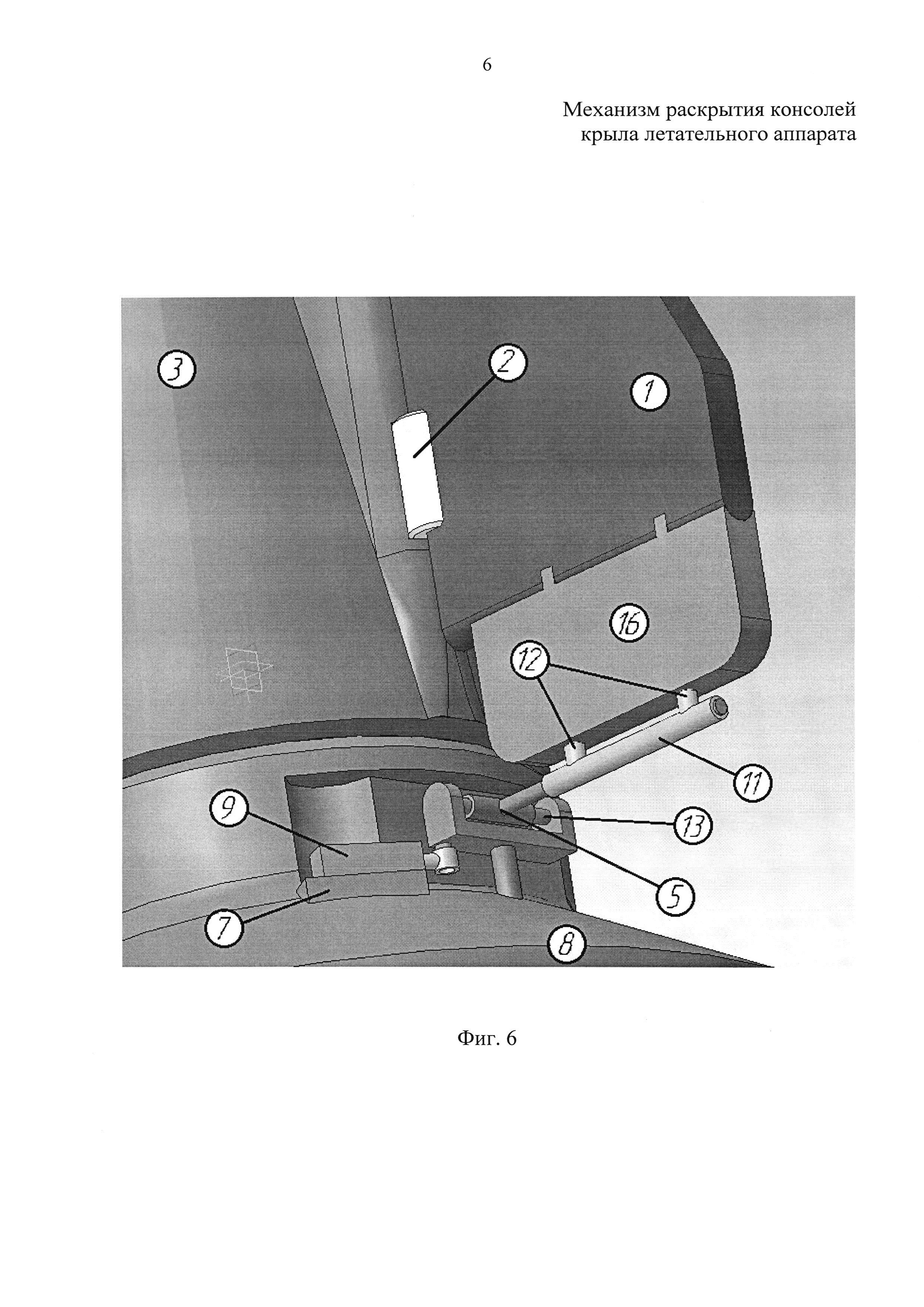 Изобретение относится к области ракетной техники, а именно к складным аэродинамическим поверхностям и механизмам их раскрытия. Раскрываемое, шарнирно закрепленное на корпусе крыло и механизм раскрытия консолей крыла, выполненный в виде Т-образно вращающихся стержней, установленных перпендикулярно друг к другу, один из которых имеет возможность перемещаться вдоль оси другого и вдоль консоли крыла, а второй закреплен шарнирно на другой ступени ракеты. Крыло раскрывается за свою заднюю кромку с помощью двух пальцев (пластин), установленных на одном из рычагов механизма раскрытия. Технический результат заключается в обеспечении более простой конструкции при изготовлении механизма, отсутствии его настройки и, как следствие, в исключении возможных ошибок при сборке, а также в снижении массы ракеты за счет уменьшения количества деталей. 6 ил.