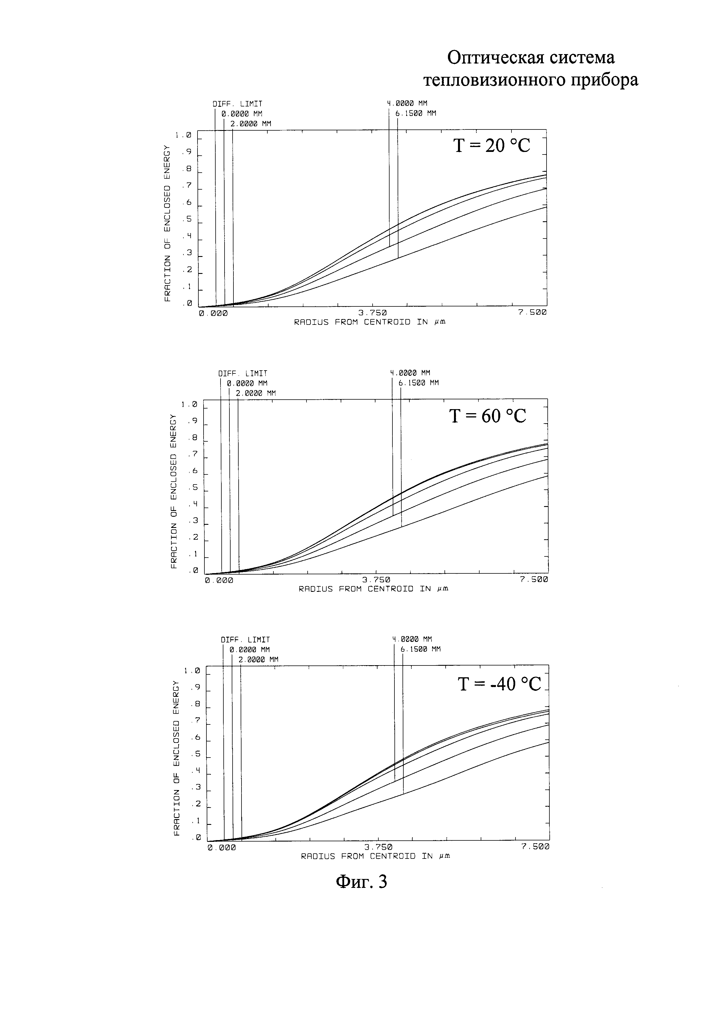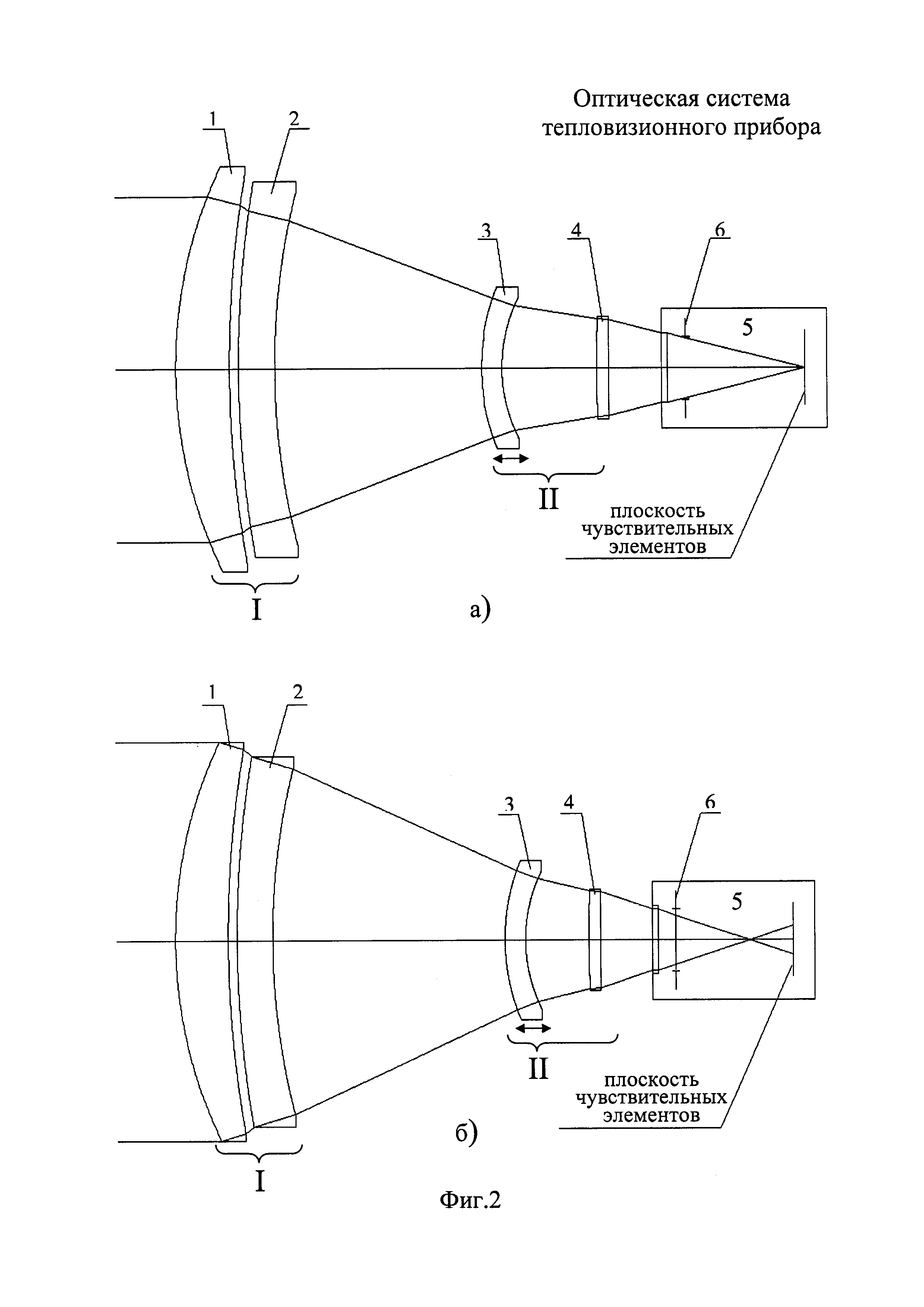 Оптическая система тепловизионного прибора, состоящая из объектива, содержащего последовательно расположенные вдоль оптической оси первый компонент, первая линза которого выполнена выпукло-вогнутой, и второй компонент, выполненный в виде двух выпукло-вогнутых линз, и приемника излучения с охлаждаемой диафрагмой, выход которого соединен с входом блока обработки информации, отличающаяся тем, что введены датчик температуры и блок позиционирования, подключенные к входу и выходу блока обработки информации соответственно, в первом компоненте объектива первая линза выполнена положительной и дополнительно введена отрицательная выпукло-вогнутая линза, при этом оптическая сила первого компонента в целом положительная, во втором компоненте первая линза выполнена отрицательной и установлена с возможностью перемещения вдоль оптической оси под управлением блока позиционирования, вторая линза выполнена положительной, при этом оптическая сила второго компонента в целом отрицательная, а расстояния между первым и вторым компонентами d1 и между линзами второго компонента d2 удовлетворяют следующим условиям: 0,2f'<d1<0,4f'; 0,1f'<d2<0,2f', где f' - фокусное расстояние системы.