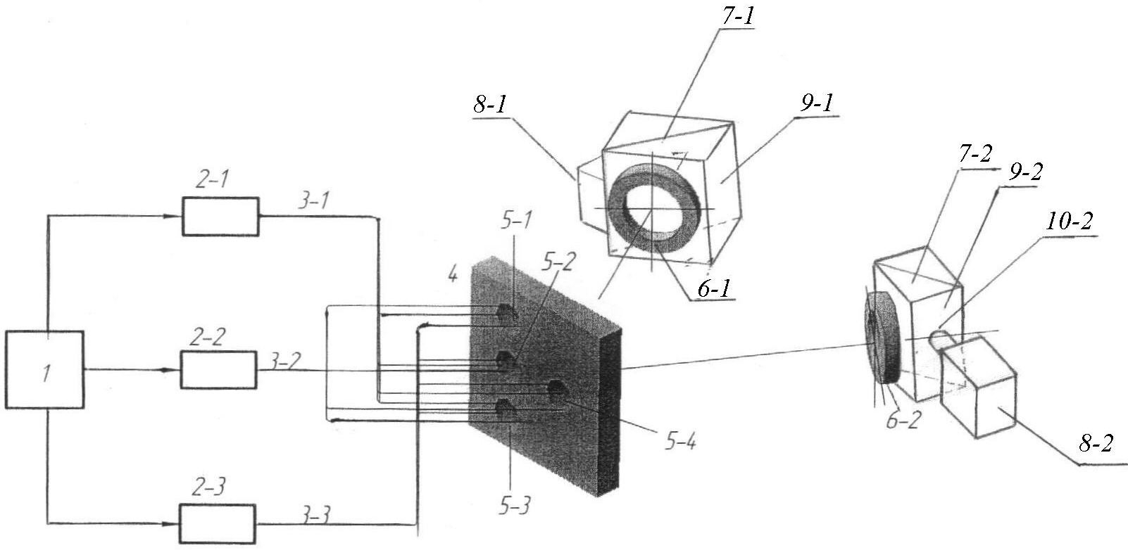 Изобретение относится к области медицины, а именно к офтальмологии, предназначено для исследования бинокулярного зрения и может быть использовано в офтальмологических клиниках, больницах, специализированных детских садах. Известно устройство для диагностики и развития бинокулярного зрения, содержащее диапроектор с лампой накаливания, конденсатор, теплозащитный фильтр, объектив, поляроидный фильтр и анизотропный диск, установленные с возможностью вращения с различной скоростью при включении электродвигателей. Кроме того, в состав устройства входит металлизированный экран и поляроидные очки (пат. РФ №2076620, кл. A61B 3/08, публ. 10.04.97.). Недостатками данного устройства являются: во первых, применение некогерентного источника подсвета, которое не обеспечивает стимуляцию активности зрения ведомого глаза, что приводит при диагностике к недостаточно эффективному выявлению остатков фузионного слияния, во вторых, устройство громоздко из-за электромеханических блоков, неудобно в эксплуатации. Для выявления фузии, чтобы прогнозировать в ходе диагностики возможность восстановления бинокулярного зрения, в настоящее время в технике подобного назначения используют в основном лазерные источники излучения, это когерентные источники подсвета, которые при проведении диагностики обеспечивают активное функционирование ведомого глаза, так как спекл-структуры лазерного излучения стимулируют функционирование сетчатки глаза, в результате обеспечивается повышение остроты зрения ведомого глаза. Наиболее близким к предлагаемому является устройство для диагностики и восстановления бинокулярного зрения, содержащее фороптеры с поляроидными фильтрами для левого и правого глаз, четырехточечный поляроидный тест-объект, 4 лазерных источника подсвета световых окон тест-объекта, соединенных с блоком включения и оптически сопряженных с 4 световыми окнами тест-объекта (Инструкция по применению аппарата для диагностики по трем видам разделения полей зрения и диплоптического лечения косоглазия “ФОРБИС”, М. 2001 г., стр.4-10). Недостатками данного устройства является то, что для подсветки тест-объекта используют лазерное излучение на одной длине волны 0,65 мкм, которое при проведении диагностики воспринимают только фоторецепторы сетчатки глаза в красной области спектра. Отсутствие диагностики состояния фоторецепторов зрения в зеленой и синей областях спектра существенно ограничивает функциональные возможности устройства, не позволяет определить сохранность фузионных возможностей отдельно для разных фоторецепторов сетчатки, что снижает достоверность диагностики. Использование 4 отдельных лазерных источников не позволяет создать единовременно одну спекл-структуру для правого и левого глаз. Поэтому когерентное лазерное излучение в разных световых окнах не коррелированно между собой по фазовым параметрам, что снижает точность определения фузионных способностей пациента, а следовательно, и достоверность диагностики. Кроме того, проведение диагностики, основанной на устном диалоге между врачом и пациентом, отсутствие в устройстве конструктивных элементов, обеспечивающих визуализацию процесса диагностики, снижает объективность оценки состояния зрения больного, особенно при обследовании детей в раннем возрасте 3-4 лет. Именно диа