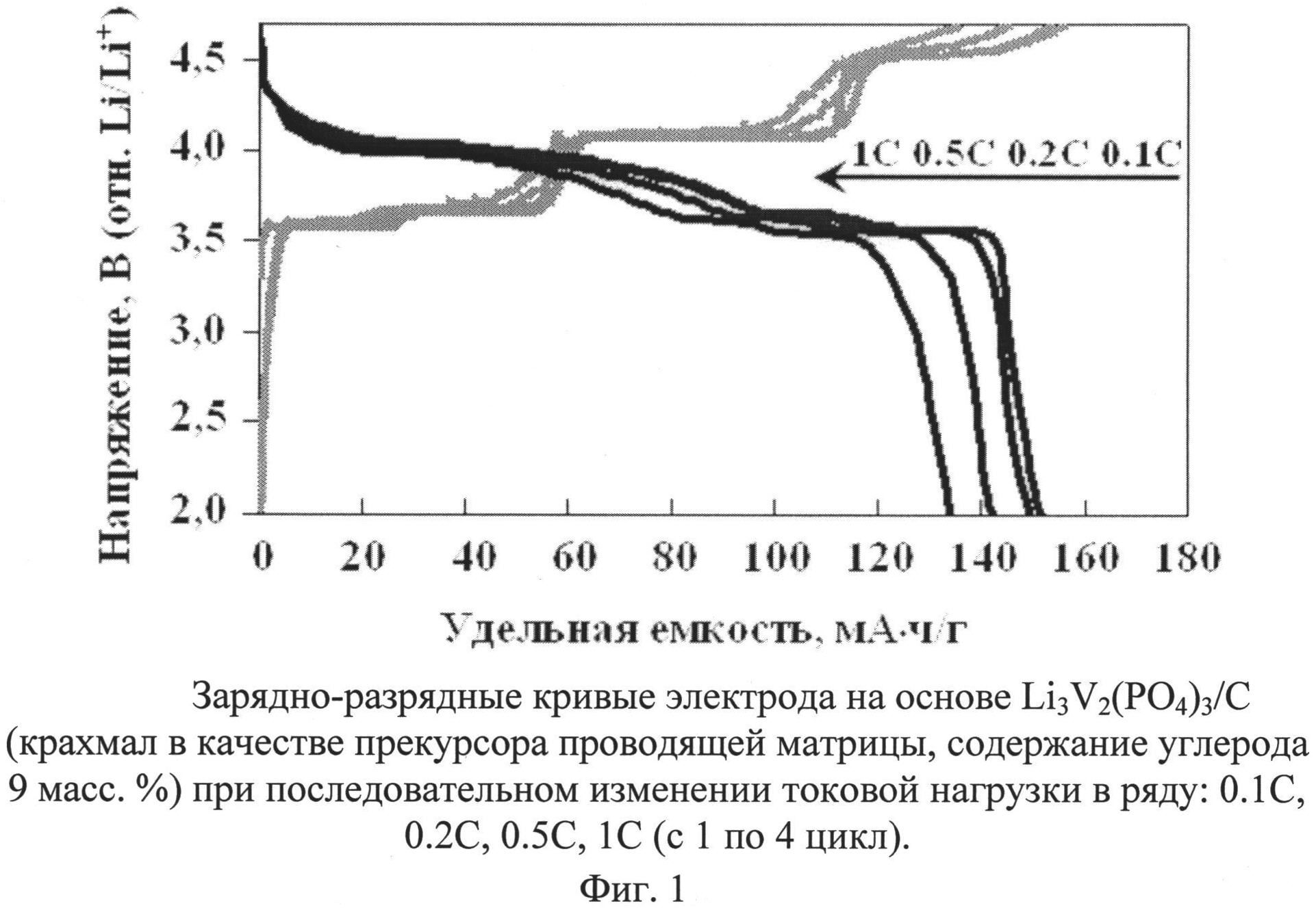 Изобретение относится к химической технологии и используется для получения катодных материалов со структурой НАСИКОН для литиевой автономной энергетики (гибридного транспорта, электромобилей, буферных систем хранения энергии и т.д.). Благодаря высокой степени развития технологии литий-ионных (ЛИА) и литий-полимерных (ЛПА) аккумуляторов, этот тип автономных источников электропитания является наиболее энергоемким среди перезаряжаемых электрохимических систем и имеет наибольший потенциал дальнейшего развития. В таких аккумуляторах в качестве анода преимущественно используется графит, способный обратимо внедрять литий [1], а в качестве катода - литерованный оксид кобальта (оксид лития-кобальта) LiCoO2[2]. Несмотря на то что ЛИА системы «углерод - оксид лития-кобальта» в настоящее время занимают значительную часть рынка источников питания для портативной электроники, их применение для питания транспорта и энергетики невозможно из-за таких присущих им недостатков, как пожароопасность при высоких температурах, деградация емкости при высоких потенциалах, температурах и скоростях циклирования, малый срок службы (500 циклов). Решение проблемы создания надежных, безопасных, но в то же время мощных и энергоемких для транспорта и энергетики невозможно без создания принципиально новых активных материалов, как анодных, так и катодных. Подавляющее большинство катодных материалов можно отнести к одному из двух основных классов (слоистые оксиды и фосфаты лития и одного или нескольких переходных металлов), родоначальниками которых являются LiCoO2 и LiFePO4 [3]. Разработка новых материалов направлена на повышение удельных энергетических и мощностных характеристик при сохранении или, если возможно, повышении уровня безопасности. Перспективным материалом в этом отношении является фосфованадат лития или фосфат лития-ванадия (III) Li3V2(PO4)3 со структурой типа НАСИКОН [4]. По уровню безопасности и области применения этот материал близок к LiFePO4, однако имеет ряд отличительных особенностей, обусловливающих как его преимущества, так и недостатки. К числу преимуществ относятся: - высокое теоретическое значение удельной емкости - 198 мАч/г, которое заметно выше такового для LiFePO4 (170 мА·ч/г), и возможность достижения удельной емкости, близкой к теоретической; - более высокое среднее напряжение на разряде - 4 В в сравнении с LiFePO4 (3,5 В); - высокие значения разрядных токов - более 20С. В числе недостатков можно назвать следующие: - низкая электронная проводимость, требующая введения электропроводной добавки как правило, углеграфитового материала. Этот недостаток является общим для LiFePO4 и Li3V2(PO4)3; - заметное снижение емкости при циклировании, которое практически отсутствует у лучших образцов LiFePO4. Одним из направлений преодоления этих недостатков является разработка состава и способа синтеза углеграфитового композита Li3V2(PO4)3/С, позволяющих получить высокие емкостные и токовые показатели циклирования. Эти свойства обусловлены в первую очередь морфологией материала (размером и формой частиц), а также структурой и свойствами углеродной проводящей матрицы. Существует два основных направления получения композита Li3V2(PO4)3/С: твердофазные, к числу которых относят твердофазный обжиг, механохимическая активация, карботермическое восстановление, микроволновый синтеза, и