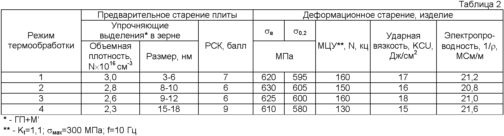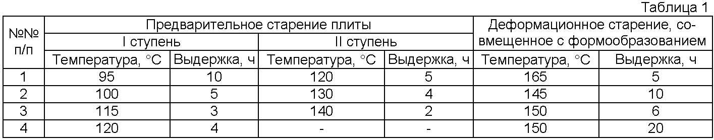 Изобретение относится к области металлургии и машиностроения, а именно к способу получения изделий из высокопрочных, особенно сверхпрочных алюминиевых сплавов системы Al-Zn-Mg-Cu-Zr, применяемых в качестве обшивок крыла и других крупногабаритных силовых элементов планера самолетов, а также наземных транспортных средств. Известно, что высокопрочные алюминиевые сплавы имеют недостаточную технологическую пластичность при традиционных процессах формообразования деталей (гибка, обтяжка) в закаленном и искусственно состаренных состояниях. Это приводит к большой трудоемкости изготовления и даже к невозможности получения изделий сложной конфигурации (в том числе двойной кривизны) определенной номенклатуры, а также к снижению качества деталей в результате ухудшения их эксплуатационных характеристик под действием повышенной деформации. Поэтому для этих сплавов представляет особый интерес процесс получения изделий одновременного формообразования и искусственного старения - деформационное старение (ДС) в условиях воздействия температуры и деформации ползучести (деформации при низкой скорости, не превышающей 0,5%/час) применительно к изделиям сложной формы из плит и прессованных полуфабрикатов (Proceeding of ICAA-7, 2000, Japan p.1, p.455-460). Этот ресурсосберегающий процесс позволяет за одну операцию плавного, однородного и медленного нагружения (преимущественно в автоклаве) получить точную, сложную форму без необходимости доводочных и правильных, как правило, трудно регулируемых, ручных работ. Это расширяет применение и увеличивает весовую отдачу конструкций. Проблема ДС при формообразовании наиболее актуальна и реальна для получения изделий, особенно крупногабаритных, длинномерных, из высокопрочных и сверхпрочных высоколегированных сплавов на основе системы Al-Zn-Mg-Cu с малой добавкой Zr, которые находят возрастающее применение для снижения массы конструкций ввиду высокой удельной прочности. Деформирование высокопрочных сплавов в холодном состоянии - правка плит и прессованных полуфабрикатов и формообразование изготовленных из них изделий жестко регламентируется, зависит от состояния термообработки и является одним из критических процессов производства. Деформирование выполняется кратковременным нагружением механическими способами (на растяжных машинах, прессах) в 2-х состояниях термообработки: - до проведения искусственного старения, сразу после закалки (в пределах нескольких часов - свежезакаленном состоянии), когда сплавы имеют повышенную пластичность; - в искусственном состаренном состоянии. [Цветные металлы и сплавы, Энциклопедия «Машиностроение», М, 2001, т.II-3, с.94-131; Aluminum Standards and Data, Aluminium Association, USA, 2006, p 1.8-1.9.] Деформирование в свежезакаленном состояние является одним из самых распространенных способов формообразования изделий, однако имеет для изделий сложной формы и крупногабаритных существенные недостатки: - как правило, процесс многократный, в основном по двум причинам: - ограничена (до ~3%) степень деформации ввиду того, что она ускоряет процесс дальнейшего искусственного старения, вызывая снижение прочности; ограничена продолжительность проведения деформации; - возможный неблагоприятный рост зерна, что ухудшает эксплуатационные характеристики; - недостаточная точность получаемой формы изделия, что требует дополни