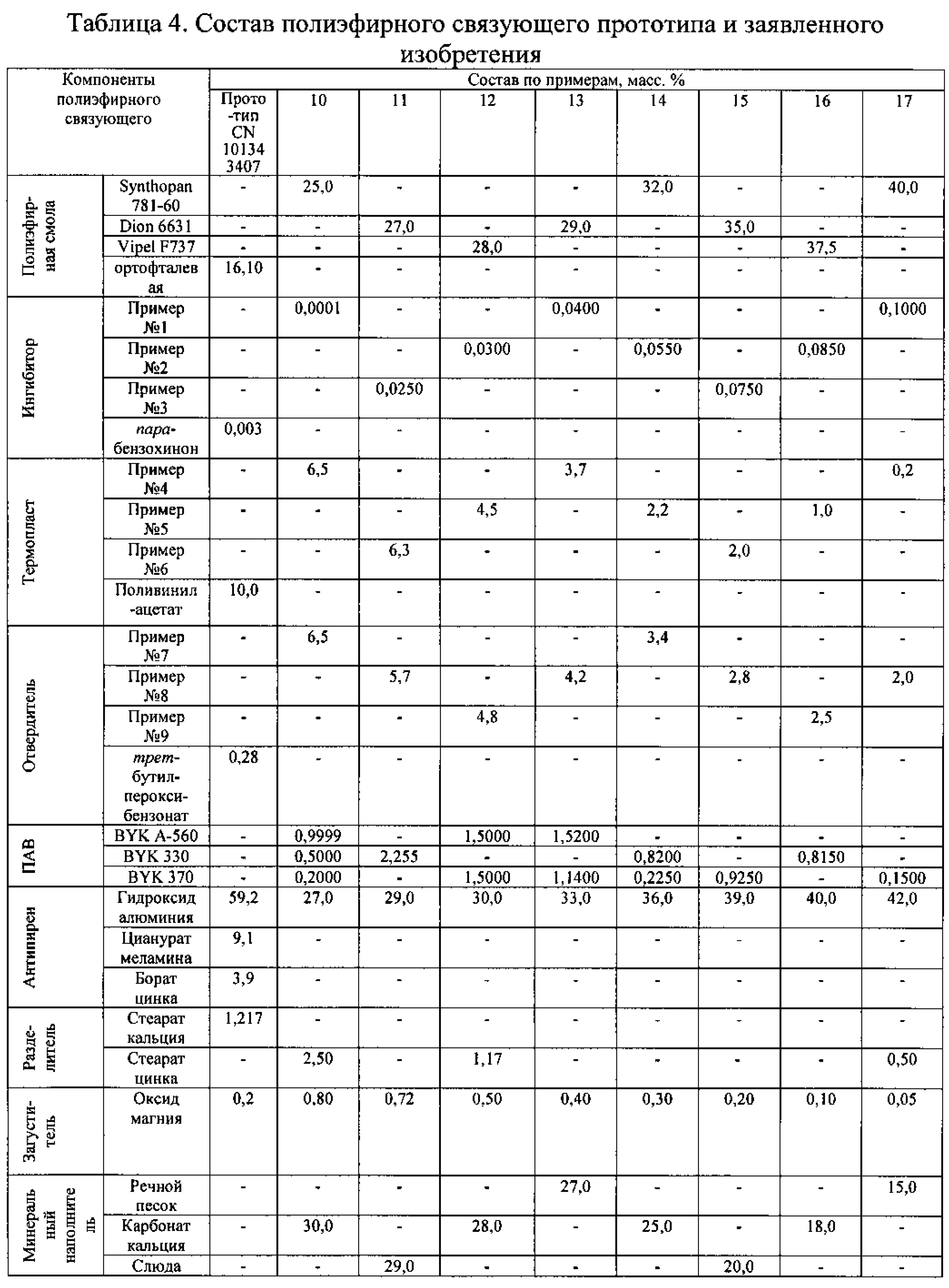 Изобретение относится к области создания полимерных связующих на основе полиэфирного олигомера с наполнителем в виде коротких волокон для полимерных композиционных материалов (ПКМ), получаемых из листового полуфабриката (SMC-препрега) методом прямого прессования (sheet molding compound - SMC-технологии), которые могут быть использованы для изготовления экономически эффективных деталей, элементов интерьера и корпусов транспорта, имеющих улучшенные эксплуатационные и прочностные характеристики. Из уровня техники известен композиционный материал на основе полиэфирной смолы, состоящий из ненасыщенной полиэфирной смолы ПН-15 и отверждающей системы, которая представляет собой раствор анилино-формальдегидной смолы СФ-342А в ацетоне (RU 2232175 С2, C08L 67/06, опубл. 10.07.2004). Основным недостатком этого материала является наличие инертного органического растворителя в составе отверждающей системы, что негативно сказывается на процессе формирования изделия из него, поскольку удаление летучих продуктов приводит к образованию пористой структуры ПКМ, характеризующегося невысокими показателями прочности. Известна полимерная композиция, армированная стекловолокном, содержащая полиэфирный олигомер, полиэтилентерефталат и антипирен галогенового ряда (хлорбензол, бромбензол и т.п.) (US 3671487 А, C08K 5/03, опубл. 20.06.1972). Полученный материал имеет температуру тепловой деформации 207°С. В качестве основного недостатка этой композиции является ее низкие экологические характеристики в связи с наличием антипиренов галогенового ряда, что ограничивает их применение в обитаемых помещениях. Наиболее близким техническим решением по совокупности существенных признаков и достигаемому техническому результату, принятым за прототип, является полиэфирное связующее, включающее: ортофталевую ненасыщенную полиэфирную смолу - 16,10 масс. %, термопласт на основе винилацетата: поливинилацетат - 10,00 масс. %, отвердитель пероксидного типа: трет-бутилпероксибензонат - 0,28 масс. %, ингибитор фенольного типа: пара-бензохинон - 0,003 масс. %, загуститель: оксид магния - 0,20 масс. %, антипирен: смесь гидроксида алюминия - 59,20 масс. %, цианурата меламина - 9,10 масс. % и бората цинка - 3,9 масс. %, и разделитель: стеарат кальция -1,217 масс. %. Препрег, включающий указанное полиэфирное связующее и рубленый стекловолоконный наполнитель, при соотношении компонентов: связующее - 88,46 масс. %, наполнитель - 11,54 масс. %. Изделие из листового пресс-материала (препрега) получают по технологии термореактивного формования (CN 101343407 A, C08J 5/04, опубл. 14.01.2009). Недостатками указанного прототипа являются его высокая стоимость, низкий уровень технологических характеристик полиэфирного связующего (высоковязкая композиция), что затрудняет процесс его переработки в ПКМ, а также низкая температура тепловой деформации отвержденной композиции, что понижает сопротивление этого материала к распространению огня, а также и низкие физико-механические и деформационно-прочностные характеристики (предел прочности при статическом изгибе и ударная вязкость) изделий из ПКМ, изготовленных из препрега на основе связующего. Технической задачей заявленного изобретения является создание экономически эффективного полиэфирного связующего с улучшенными технологическими характеристиками (композиция с пониженной вязкостью), с повышенной темпе