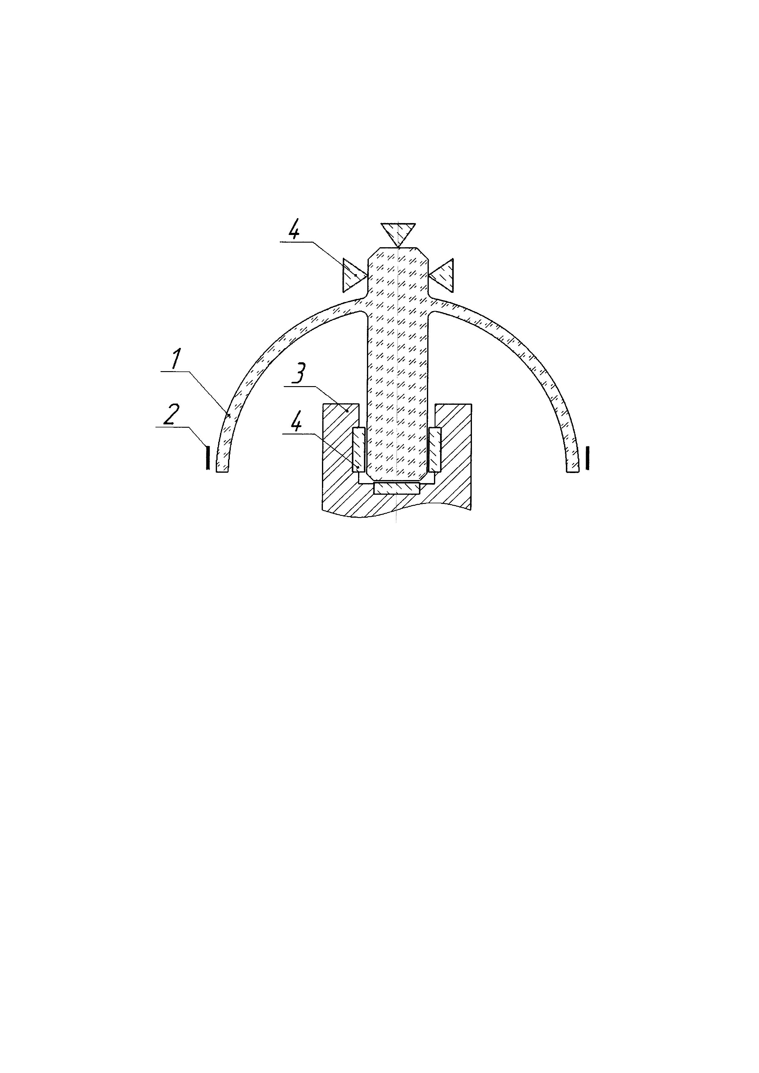 Изобретение относится к производству твердотельных волновых гироскопов. При производстве резонатора твердотельного волнового гироскопа (ТВГ) из-за технологических дефектов появляются погрешности, которые приводят к расщеплению собственных частот резонатора, снижению добротности вследствие конструктивного демпфирования. Все эти дефекты отрицательно сказываются на точностных характеристиках прибора. Ряд дефектов устраняется балансировкой. В ходе балансировки влияние дефектов компенсируется путем удаления небольшого количества вещества из определенных мест полусферического резонатора. Известен способ балансировки полусферического резонатора волнового твердотельного гироскопа и устройство для его осуществления (RU 2147117, публ. 27.03.2000 г.), включающий закрепление резонатора за ножку, установку датчиков возбуждения и измерения и удаление неуравновешенной массы. Пьезоэлектрический датчик устанавливают на свободном конце ножки резонатора для измерения его перемещения, возбуждают колебания резонатора, измеряют напряжение пьезоэлектрического датчика для различных ориентаций стоячей волны в резонаторе, рассчитывают неуравновешенную массу путем математической обработки полученных экспериментальных данных и удаляют неуравновешенную массу с поверхности полусферической оболочки резонатора. Недостатком известного способа является отсутствие возможности регистрировать реакцию в опоре крепления и определять момент сил, позволяющий проводить балансировку по всей поверхности полусферы. Так же из-за ограниченного количества измерительных датчиков ограничивается точность измерений. Задачей заявляемого способа является повышение точности определения дефектов резонатора. Указанный технический результат достигается тем, что способ определения дисбаланса масс полусферического резонатора твердотельного волнового гироскопа включает закрепление резонатора за ножку, установку датчиков возбуждения и измерения, возбуждение колебаний резонатора, регистрацию сигналов с датчиков для различных ориентации стоячей волны в резонаторе, расчет неуравновешенной массы путем математической обработки полученных экспериментальных данных для дальнейшей балансировки резонатора, при этом дополнительно измеряют реакцию в опоре в месте крепления резонатора. В месте крепления резонатора устанавливают, по крайней мере, один дискретный измерительный датчик, а также измерительные датчики устанавливают на свободном конце ножки со стороны внешней полусферы. Дискретный контакт в месте крепления ножки резонатора позволяет ввести в зону сопряжения датчики, число которых три или более, и провести более точные измерения перемещений во время возбуждения резонатора для различных ориентаций стоячей волны. Большее число датчиков позволяет провести более точную обработку полученных сигналов и повысить точность балансировки путем удаления неуравновешенной массы с поверхности полусферической оболочки резонатора. Устройство для определения дисбаланса масс полусферического резонатора ТВГ поясняется рисунком и содержит резонатор 1, датчики возбуждения 2, опору для установки ножки резонатора (цанговый зажим) 3, датчики измерения 4. Датчики 4 установлены как в месте крепления резонатора, так и на свободном конце ножки резонатор