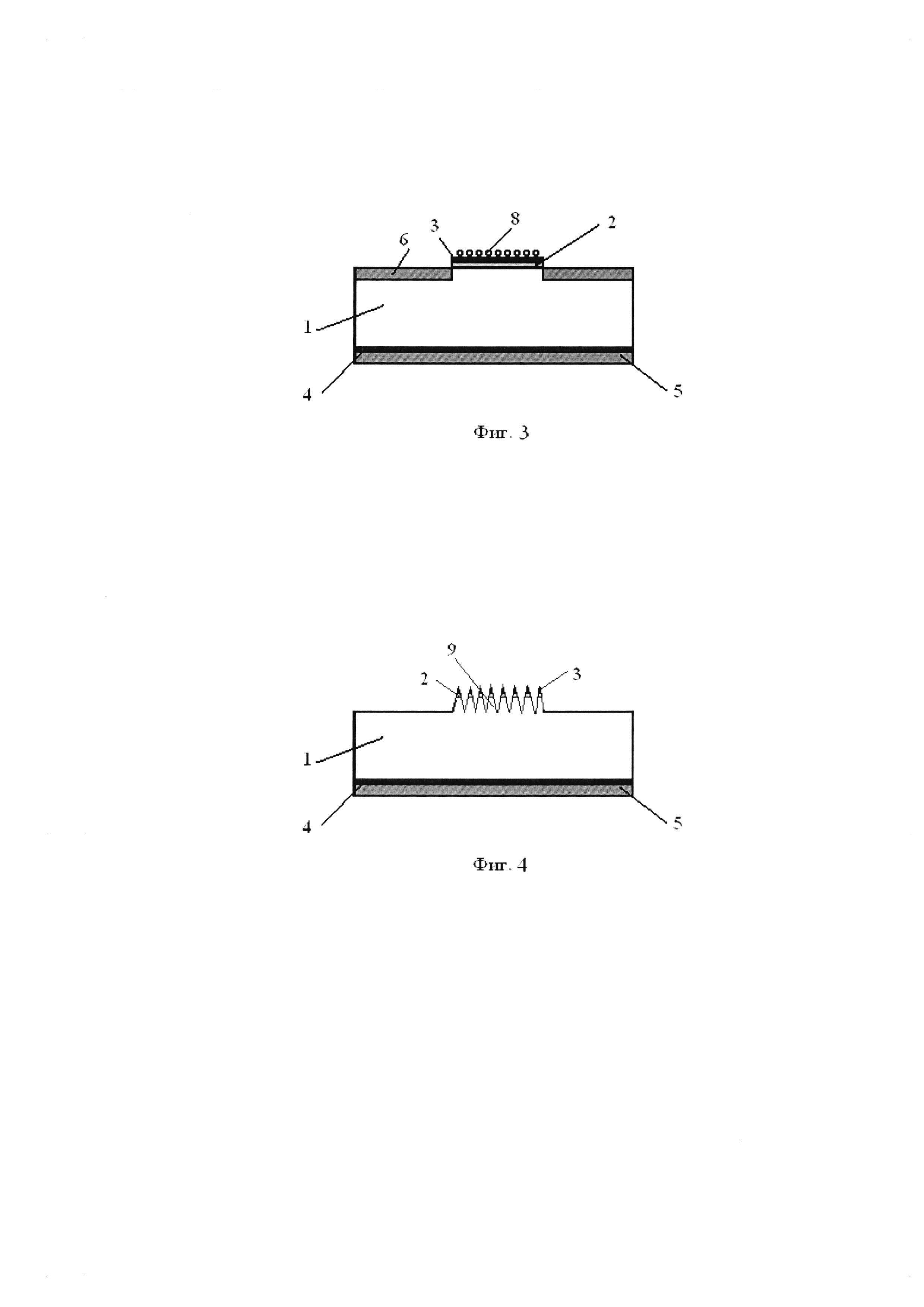 Изобретение относится к приборам твердотельной и вакуумной электроники, в частности к автоэмиссионным элементам на основе системы Si-SiC-графен, используемых в качестве катодов: к диодам, к триодам и к устройствам на их основе. В последние годы большой интерес вызывают исследования связанные с необычными физико-химическими свойствами углеродосодержащих материалов (УСМ), благодаря которым УСМ являются привлекательным объектом не только фундаментальной науки, но и прикладного их использования. Известно, что холодный катод, используемый в качестве источника электронной эмиссии в электронном приборе, должен удовлетворять таким основным требованиям, как высокая стабильность тока, высокая поверхностная однородность эмиссионных характеристик эмиттера и малый разброс энергии эмиттируемых электронов. Катоды на основе УСМ в большей степени удовлетворяют сформулированным требованиям и в отношении указанных параметров не уступают наиболее распространенным коммерческим источникам холодной эмиссии. Аналогом предлагаемого автоэмиссионного элемента и способа его изготовления является холодно-эмиссионный пленочный катод в виде подложки с нанесенной на нее углеродной пленкой, позволяющей получать высокую плотность эмиссионных токов 0,15-0,5 А/см2 [1]. Углеродная пленка представляет собой структуру, состоящую из углеродных микро- и наноребер или микро- и нанонитей, ориентированных перпендикулярно поверхности подложки, с характерным размером от 0,05 до 1 мкм. Особенности технологии формирования эмиссионных катодов на основе углеродных материалов (такие как высокая температура осаждения, недопустимость осаждения других слоев на сформированную эмиссионную поверхность) затрудняют создание интегрированных эмиссионных элементов (диодов и триодов), что требует разработки новых структур полевых эмиссионных элементов. Также известно устройство интегральных автоэмиссионных элементов с эмиттерами на основе наноалмазных покрытий, что позволяет получить большие плотности тока [2]. Для получения больших плотностей автоэмиссионных токов полевой катод должен быть изготовлен из материала с достаточно высокой электронной проводимостью, которая в поликристаллических алмазных пленках обуславливается различными структурными дефектами, формирующими системы дополнительных уровней в запрещенной зоне алмаза. Эмиссионные свойства алмазных пленок значительно улучшаются с увеличением их дефектности вплоть до формирования аморфного материала, существенным признаком которого остается алмазный тип гибридизации связей валентных электронов атома углерода. Однако, во-первых, контролировать и управлять процессом получения алмазоподобных пленок с вышеуказанными параметрами довольно-таки затруднительно, а, следовательно, получаются приборы с невоспроизводимыми эмиссионными характеристиками и, во-вторых, наиболее предпочтительной формой эмиттеров являются микро- и наноострия или структуры в виде лезвий, в отличие от предлагаемой планарной структуры эмиттеров на основе наноалмазных покрытий. Прототипом устройства автоэмиссионного элемента, наиболее близким к заявляемому техническому решению, является углеродный многоострийный автоэмиссионный катод и способ его изготовления, представленные в [3]. Для создания периодической стру