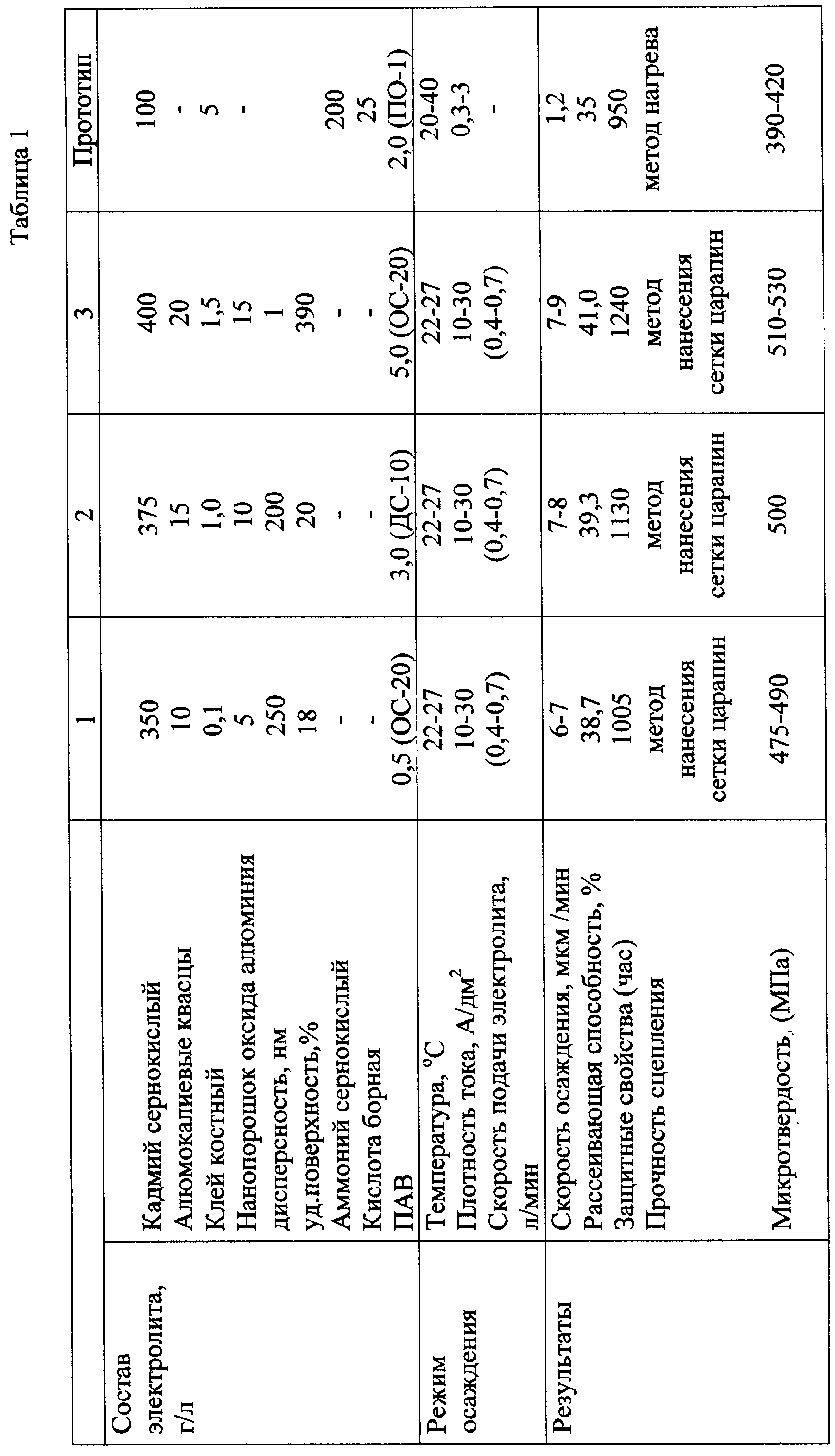 1. Электролит кадмирования, содержащий кадмий серно-кислый, поверхностно-активное вещество, костный клей, отличающийся тем, что он дополнительно содержит KA1(SO4)·12H2O и нанопорошок оксида алюминия при следующем соотношении компонентов, г/л: 2. Электролит по п.1, отличающийся тем, что в качестве ПАВ он содержит полиоксиэтиленалкиловые эфиры CnH2n+1O(C2H4O)mH, где n=8-18, m≈20. 3. Электролит по п.1, отличающийся тем, что нанопорошок оксида алюминия имеет дисперсность (1-200) нм и удельную поверхность (20-390) м2/г. 4. Способ нанесения кадмиевого покрытия на металлические изделия путем электронатирания поверхности изделий анодом из кадмия в пористой оболочке, заполняемой электролитом, отличающийся тем, что в качестве электролита используют электролит по любому из пп.1-3, а нанесение покрытия осуществляют при плотности тока 10-30 А/дм2 и скорости подачи электролита 0,4-0,7 л/мин. кадмий серно-кислый 350-400 ПАВ 0,5-5,0 костный клей 0,1-1,5 KA1(SO4)·12H2O 10-20 нанопорошок оксида алюминия 5-15