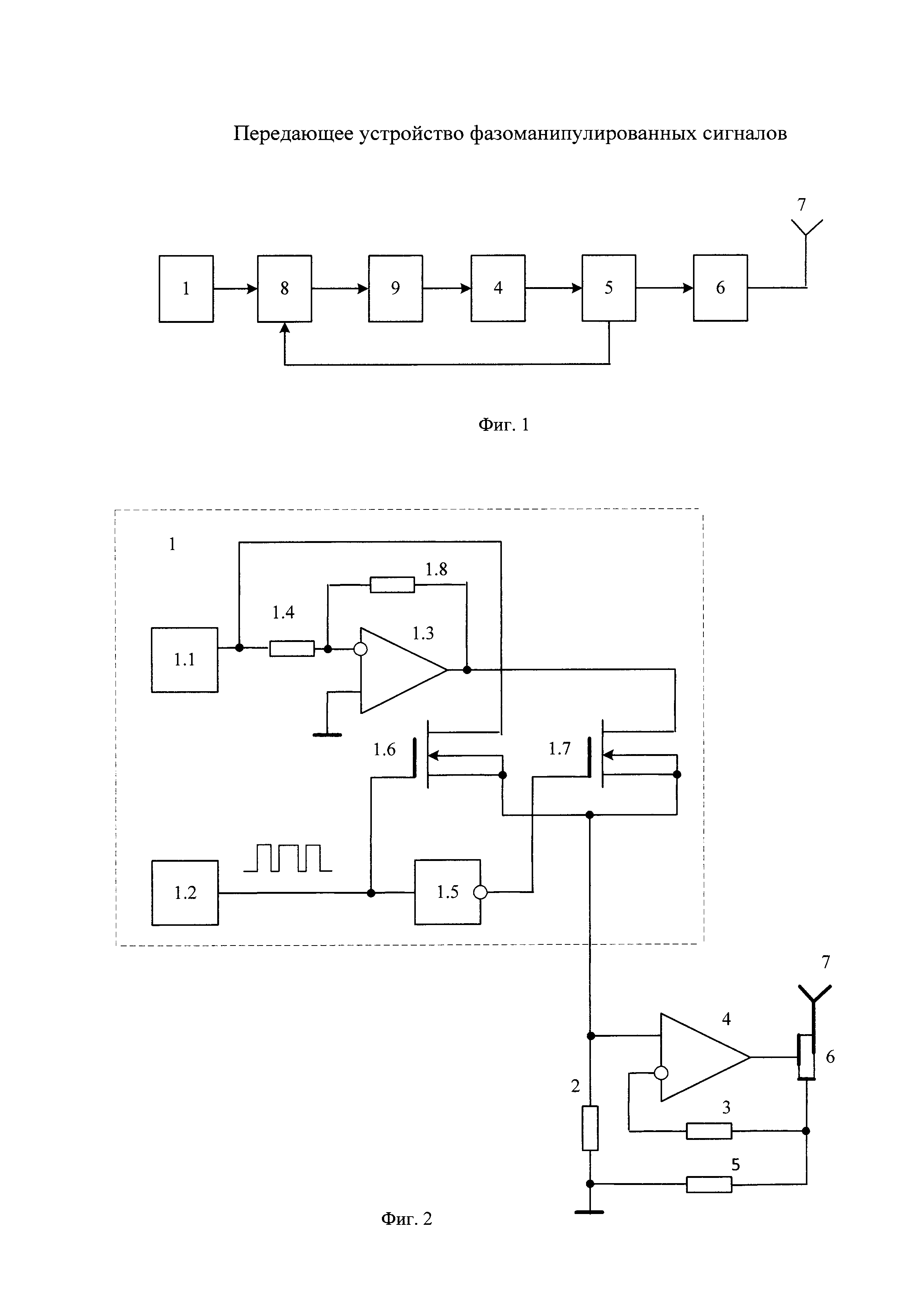 Передающее устройство фазоманипулированных сигналов, содержащее формирователь фазоманипулированных сигналов (ФМн), усилитель мощности, последовательно соединенные датчик тока, согласующее устройство и антенну, отличающееся тем, что введены первый и второй резисторы, причем первый резистор включен между неинвертирующим входом усилителя мощности и общей шиной, а второй резистор - между инвертирующим входом усилителя мощности и входом согласующего устройства, другой вход которого соединен с выходом усилителя мощности, кроме того, формирователь ФМН содержит последовательно соединенные источник сигнала несущей частоты и первый резистор формирователя, вывод которого подключен к инвертирующему входу операционного усилителя и через второй резистор формирователя - к выходу операционного усилителя, который соединен со стоком второго МОП-транзистора, выход источника сигнала несущей частоты подсоединен к стоку первого транзистора, истоки обоих МОП-транзисторов объединены и являются выходом формирователя ФМн, при этом выход формирователя ПСП подсоединен к затвору первого МОП-транзистора и входу инвертора, инвертирующий выход которого соединен с затвором второго МОП-транзистора, кроме того, неинвертирующий вход операционного усилителя соединен с общей шиной, при этом согласующее устройство выполнено из материала, диэлектрическая проницаемость которого находится в диапазоне 200…230.
