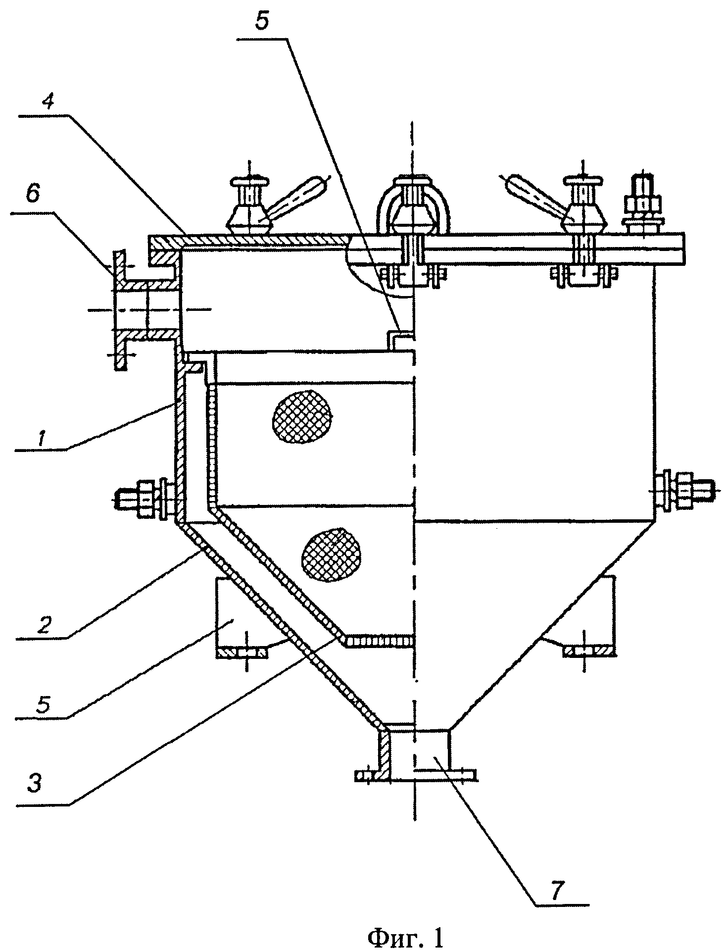 Изобретение относится к области производства смесевых твердых ракетных топлив (СТРТ) на основе активных нитроэфирных связующих. В технологическом процессе приготовления активного связующего имеется стадия растворения каучука в органическом растворителе-ацетоне, являющемся, как известно, токсичной и легко воспламеняющейся жидкостью (ЛВЖ). По окончании процесса растворения приготовленный раствор каучука необходимо профильтровать. Это вызывается тем, что каучук может быть засорен посторонними твердыми частицами, а также может содержать включения геля - частично сшитого при синтезе каучука. Твердые частицы и сгустки геля необходимо из раствора удалять, что обусловлено высокими требованиями безопасности, предъявляемыми при смешении раствора каучука с нитроэфиром, и требованиями обеспечения заданного качества продукта. Попадание твердых посторонних предметов в реактор для приготовления нитроэфирного связующего, в том числе в его разгрузочный клапан, может привести к серьезной аварии с выходом из строя производственного участка. А попадание твердых посторонних предметов с активным связующим в изготовленное изделие может привести к взрыву при его работе, поэтому недопустимо. До настоящего времени фильтрацию раствора осуществляли с использованием открытого рамочного сетчатого фильтра при сливе раствора в реактор для приготовления активного связующего. Эта операция являлась неэффективной и опасной. Согласно техническим условиям каучук может содержать гель в количестве до 0,5%. Гель способен в течение короткого времени забить фильтрующую поверхность фильтра и прекратить фильтрацию. Скорость фильтрации раствора каучука, обладающего высокой вязкостью (до 200 Па·с при 20 град. C), мала. Чтобы ее повысить, необходимо увеличивать живое сечение фильтра, площадь поверхности фильтрации. Размер отверстий в фильтрующей поверхности задан исходя из требований по допустимым размерам твердых включений и его изменение невозможно. Таким образом, для рассматриваемых условий (заданных реологических свойств раствора каучука и давления фильтрации) повышение скорости фильтрации возможно только за счет увеличения живого сечения и площади фильтрующей поверхности. Известен фильтр для суспензий, включающий вертикальный цилиндрический корпус, разделенный фильтровальной перегородкой по высоте на две неравные камеры (Н.И.Гельперин «Основные процессы и аппараты химической технологии». - М.: Химия, 1981, стр.228-229). Данное техническое решение принято за прототип. Суспензия загружается в верхнюю камеру, а фильтрат собирается в нижней камере. После промывки осадок выгружается. Нижняя камера, включая фильтровальную перегородку, для облегчения выгрузки осадка делается откидной. Выгрузка осадка возможна также через боковые люки. Однако из-за конструктивных особенностей этот аппарат не может обеспечить качественную фильтрацию с требуемой производительностью. Применение его для фильтрации вязких растворов полимеров затруднено вследствие того, что аппарат имеет неоптимальную форму фильтрующей поверхности, вследствие чего очистка фильтровальной перегородки является длительной, трудоемкой и не приемлемой в условиях производства активных связующих. В связи с этим возникла необходимость конструктивного усовершенствования фильтра и о
