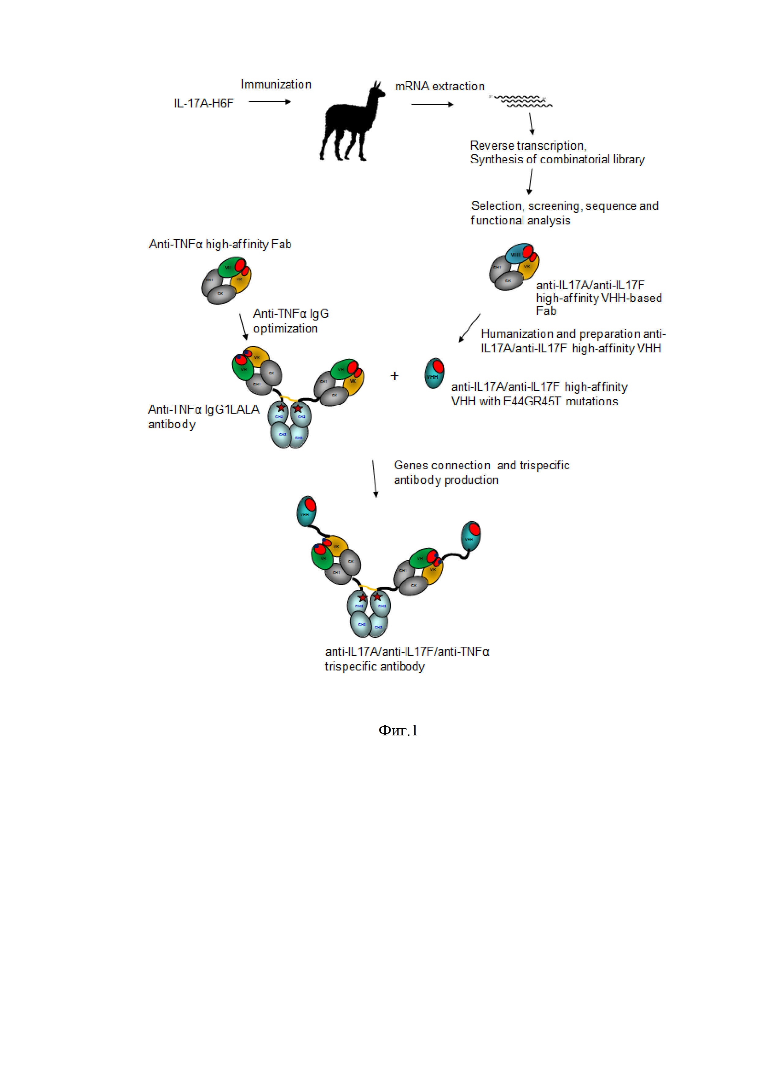 Изобретение относится к вариантам триспецифичной связывающей молекулы, содержащей вариабельный домен VHH, специфично связывающий человеческие IL-17A и IL-17F, и домен, содержащий вариабельные домены тяжелой и легкой цепи и специфично связывающий человеческий TNF-альфа (ФНО-альфа). Также предложены: нуклеиновая кислота, кодирующая упомянутую молекулу, экспрессионный вектор, клетка-хозяин и способ получения триспецифичной молекулы по изобретению. Кроме того, представлена фармацевтическая композиция и способы лечения заболеваний, опосредованных человеческими IL-17A, IL-17F или TNF-альфа, таких как ревматоидный артрит, псориаз или псориатический артрит. Данное изобретение может найти дальнейшее применение в профилактике и лечении различных аутоиммунных и воспалительных нарушений. 10 н. и 17 з.п. ф-лы, 29 ил., 11 табл., 30 пр.