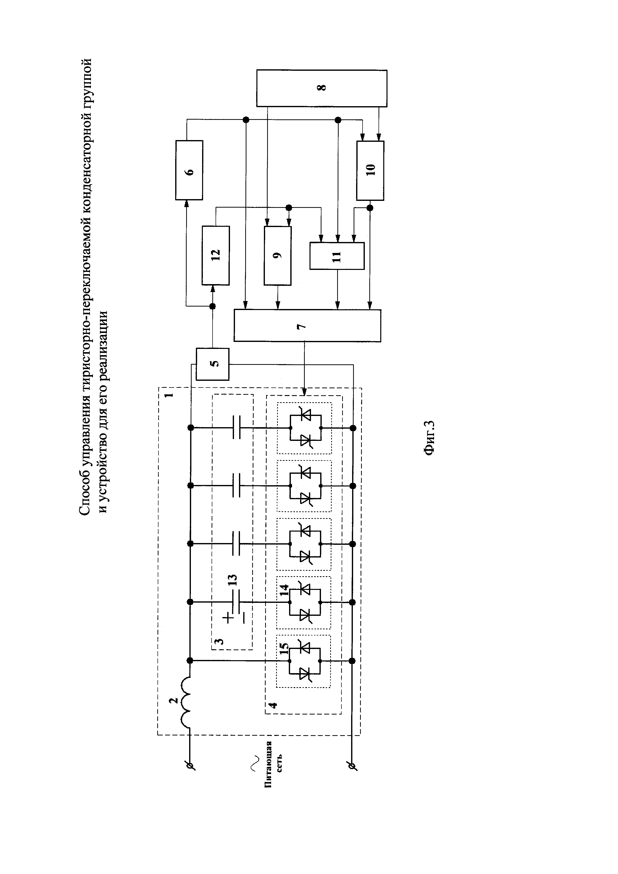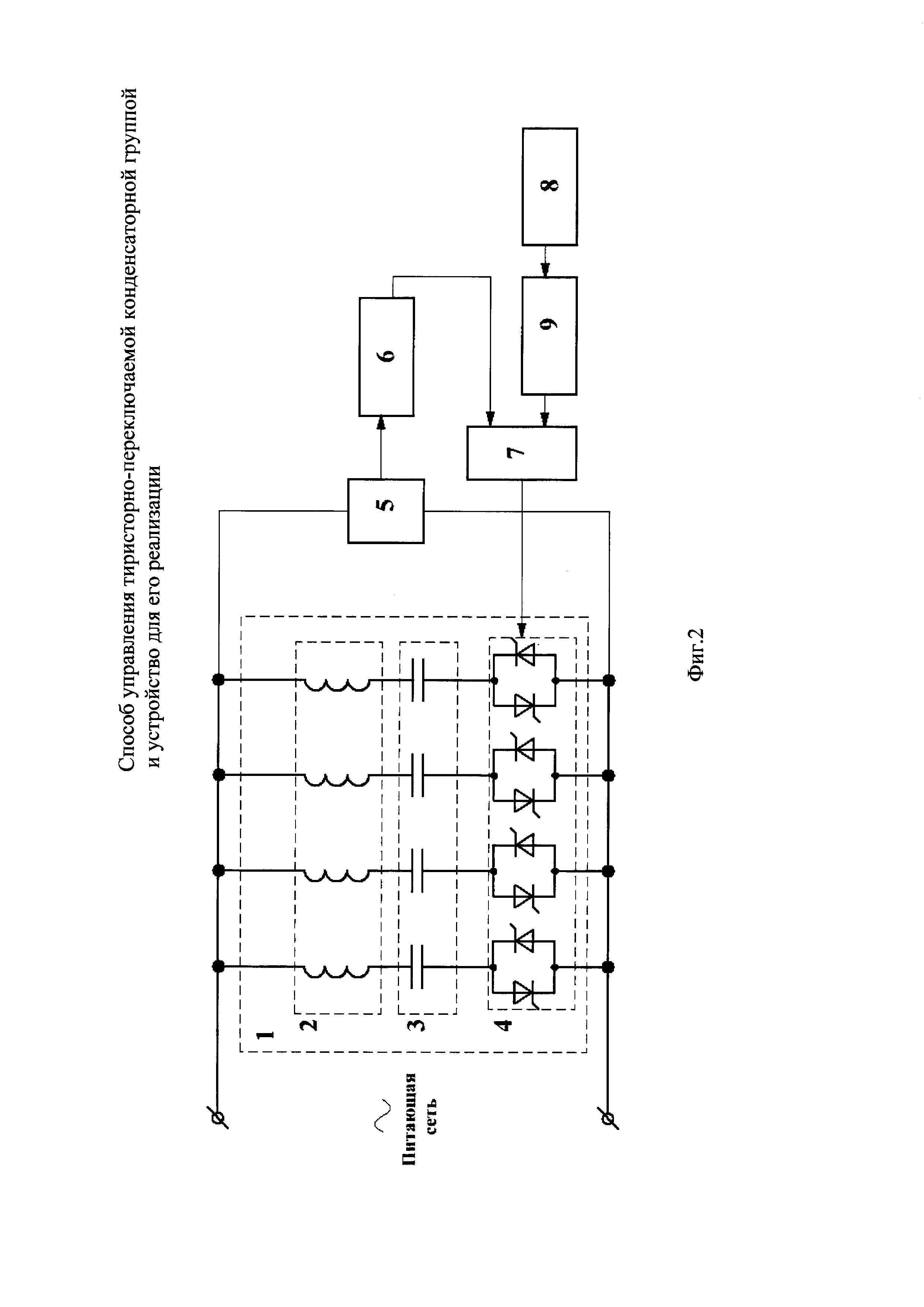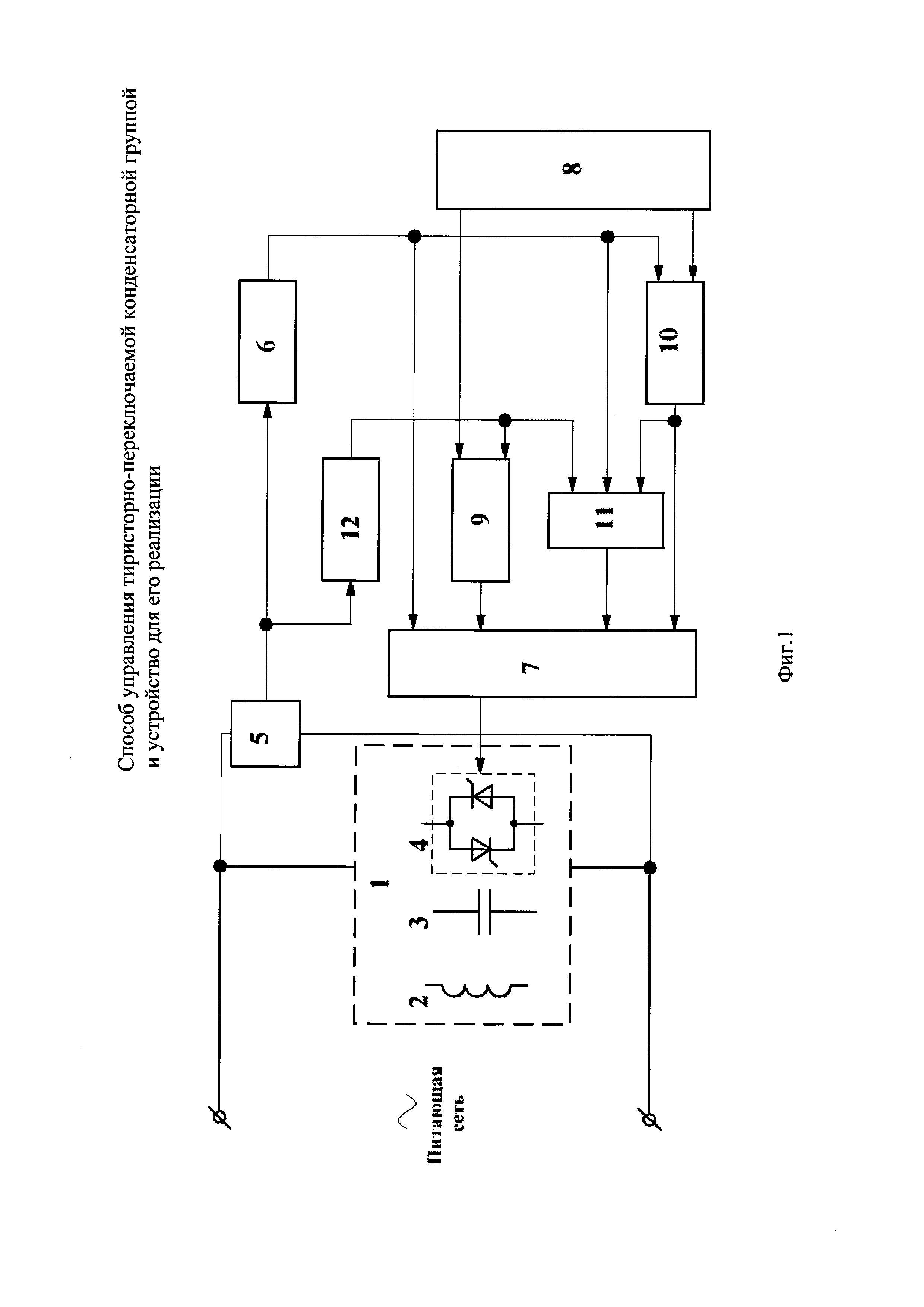 Изобретение относится к области электротехники и силовой электроники и может быть использовано для управления тиристорно-переключаемой конденсаторной группой с целью обеспечения управления реактивной мощностью в точке ее подключения. Такая технология реализуется в различных устройствах силовой электротехники, применяемых в электроэнергетике, электроприводе, электротермии, электролизе, преобразовательной технике, для компенсации реактивной мощности нагрузки. Известен способ управления реактивным сопротивлением устройства компенсации реактивной мощности, основанный на дискретном регулировании сопротивления реактивного элемента, использующий синхронизацию управления относительно приложенного к нему синусоидального напряжения. Способ применим к управлению сопротивлением индуктивного характера управляемого шунтирующего реактора. (Патент на изобретение №2641643 от 19.01.2018 «Способ управления управляемым шунтирующим реактором и устройство для его осуществления»). Известен способ управления тиристорно-переключаемой конденсаторной группой, основанный на дискретном регулировании емкости конденсаторной группы, также использующий синхронизацию управления относительно приложенного к конденсаторной группе синусоидального напряжения. Способ предполагает изменение состояния тиристоров в момент максимума приложенного к тиристорно-переключаемой конденсаторной группе синусоидального напряжения, при этом начальное напряжение на конденсаторной группе должно быть равно максимальному напряжению питающей сети. Это обеспечивает отсутствие скачка тока в тиристорно-переключаемой конденсаторной группе в момент изменения состояния тиристоров. (Энергосбережение в системах промышленного электроснабжения: Справочно-методическое издание / Под редакцией Э.А. Киреевой. - М.: «Интехэнерго-Издат», «Теплоэнергетик», 2014, 304 с. Стр. 137). Известна также тиристорно-переключаемая конденсаторная группа, состоящая из токоограничивающих реакторов, тиристоров, конденсаторов и устройства управления, использующая переключение конденсаторов с помощью тиристоров синхронизировано с синусоидальным напряжением питающей сети. Устройство управления обеспечивает переключение тиристоров в моменты максимума переменного синусоидального напряжения питающей сети, приложенного к тиристорно-переключаемой конденсаторной группе. Устройство управления состоит из блока измерения синусоидального напряжения питающей сети, блока синхронизации, блока задания величины емкости тиристорно-переключаемой конденсаторной группы, блока задания набора включаемых тиристоров, блока управления тиристорами. (Энергосбережение в системах промышленного электроснабжения: Справочно-методическое издание / Под редакцией Э.А. Киреевой. - М.: «Интехэнерго-Издат», «Теплоэнергетик», 2014, 304 с. Стр. 137, рис 5.10) К недостаткам указанных выше способа и устройства следует отнести необходимость обеспечения начального напряжения на конденсаторах тиристорно-переключаемой конденсаторной группы на момент их переключения на уровне максимального напряжения, прикладываемого к тиристорно-переключаемой конденсаторной группе. Это приводит к усложнению схемы построения устройства и увеличению его массо-габаритных показателей за счет введения в устройство дополнительн