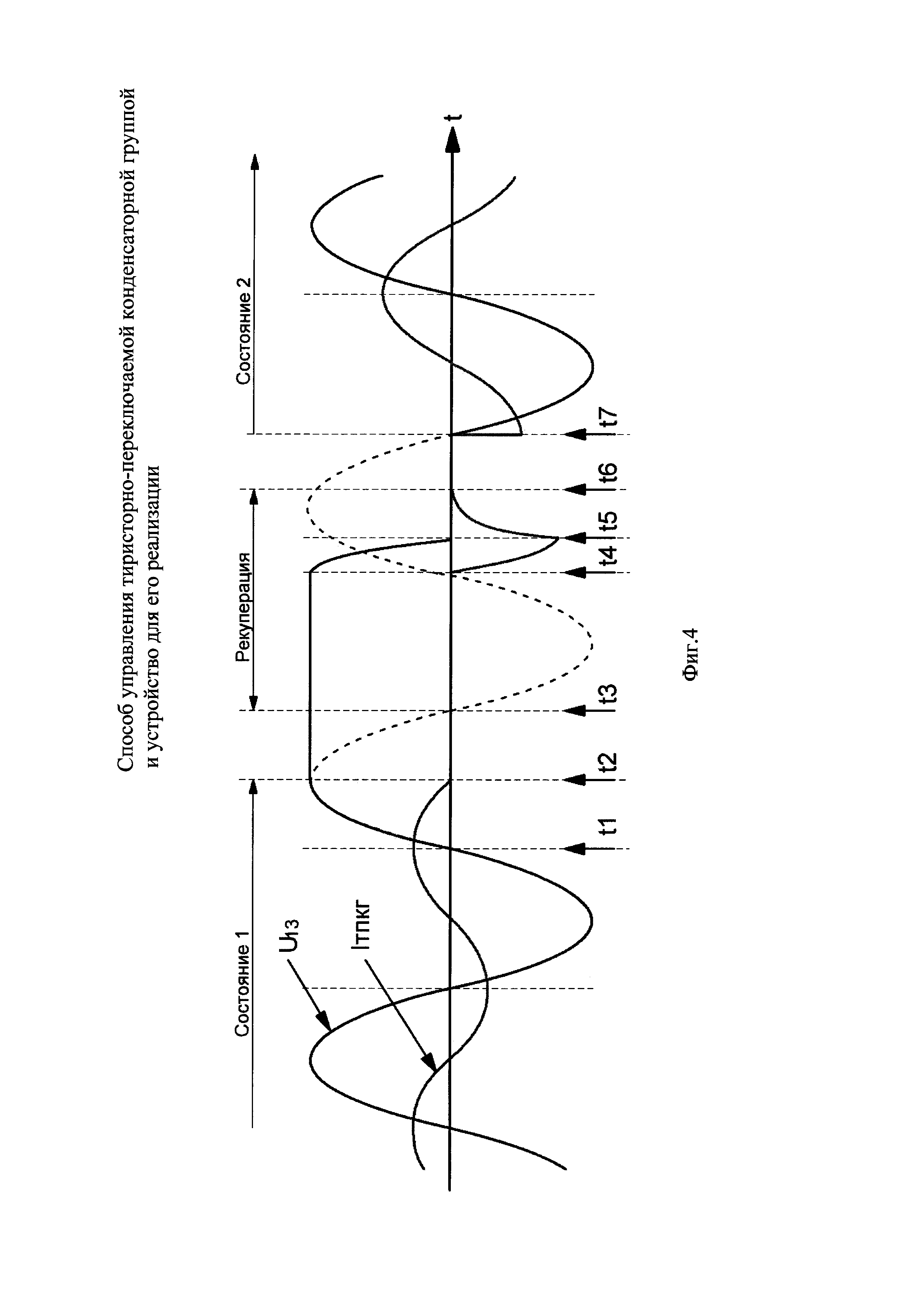 1. Способ управления тиристорно-переключаемой конденсаторной группой, состоящей из токоограничивающего реактора, тиристоров, конденсаторов и устройства управления, использующий переключение конденсаторов с помощью тиристоров синхронизировано с синусоидальным напряжением питающей сети, отличающийся тем, что управление тиристорами осуществляется в моменты времени достижения напряжением питающей сети нулевого уровня, при этом при поступлении запроса на изменение емкости тиристорно-переключаемой конденсаторной группы прекращают формирование текущего значения емкости путем снятия импульсов управления с тиристоров, осуществляют рекуперацию накопленной в конденсаторах энергии в питающую сеть с помощью управления тиристорами и затем обеспечивают формирование требуемого значения емкости тиристорно-переключаемой конденсаторной группы путем переключения тиристоров в новое состояние. 2. Устройство управления тиристорно-переключаемой конденсаторной группой, состоящее из подключенного параллельно тиристорно-переключаемой конденсаторной группе блока измерения синусоидального напряжения питающей сети, выход которого соединен с входом блока синхронизации, выход которого, в свою очередь, соединен с первым входом блока управления тиристорами, при этом выход блока задания величины емкости тиристорно-переключаемой конденсаторной группы соединен с входом блока задания набора включаемых тиристоров, выход которого, в свою очередь, соединен со вторым входом блока управления тиристорами, отличающееся тем, что в устройство введены блок завершения формирования текущего значения емкости тиристорно-переключаемой конденсаторной группы, блок управления рекуперативным разрядом конденсаторов и блок определения полярности напряжения питающей сети, причем с первым и вторым входами блока завершения формирования текущего значения емкости тиристорно-переключаемой конденсаторной группы соединены соответственно выход блока синхронизации и дополнительный второй выход блока задания величины емкости тиристорно-переключаемой конденсаторной группы, при этом вход блока определения полярности напряжения питающей сети соединен с выходом блока измерения синусоидального напряжения питающей сети, а его выход соединен с дополнительным вторым входом блока задания набора включаемых тиристоров и первым входом блока управления рекуперативным разрядом конденсаторов, второй и третий входы которого соединены соответственно с выходом блока синхронизации и с выходом блока завершения формирования текущего значения емкости тиристорно-переключаемой конденсаторной группы, причем выход блока управления рекуперативным разрядом конденсаторов и выход блока завершения формирования текущего значения емкости тиристорно-переключаемой конденсаторной группы соединены соответственно с дополнительными третьим и четвертым входам блока управления тиристорами.