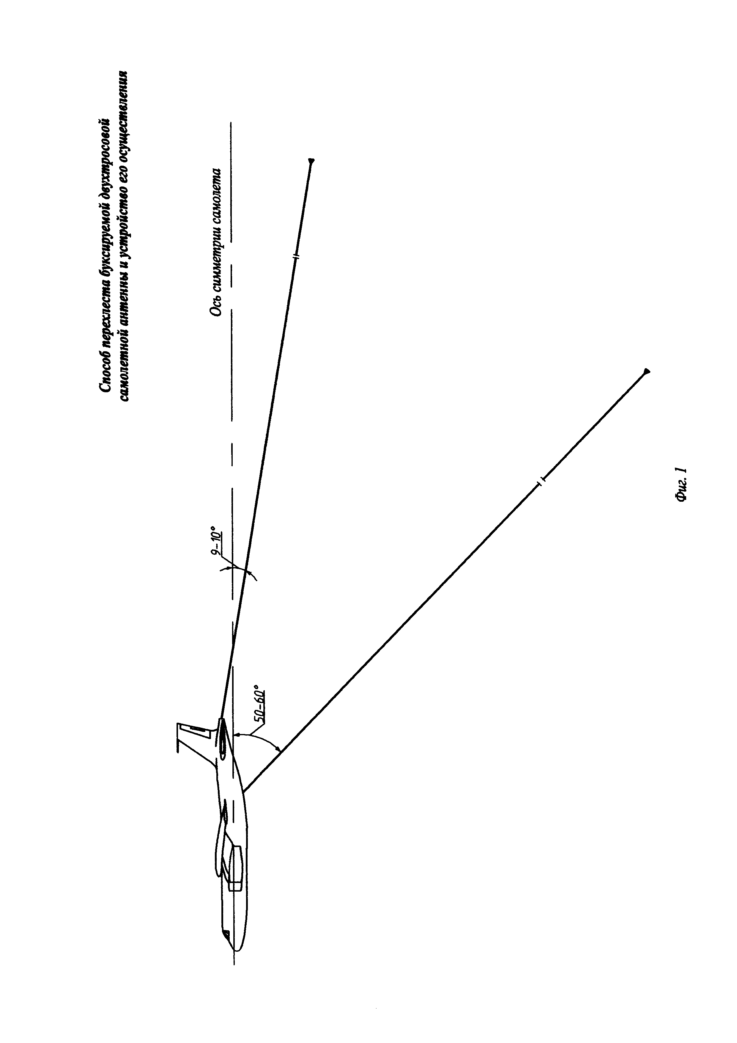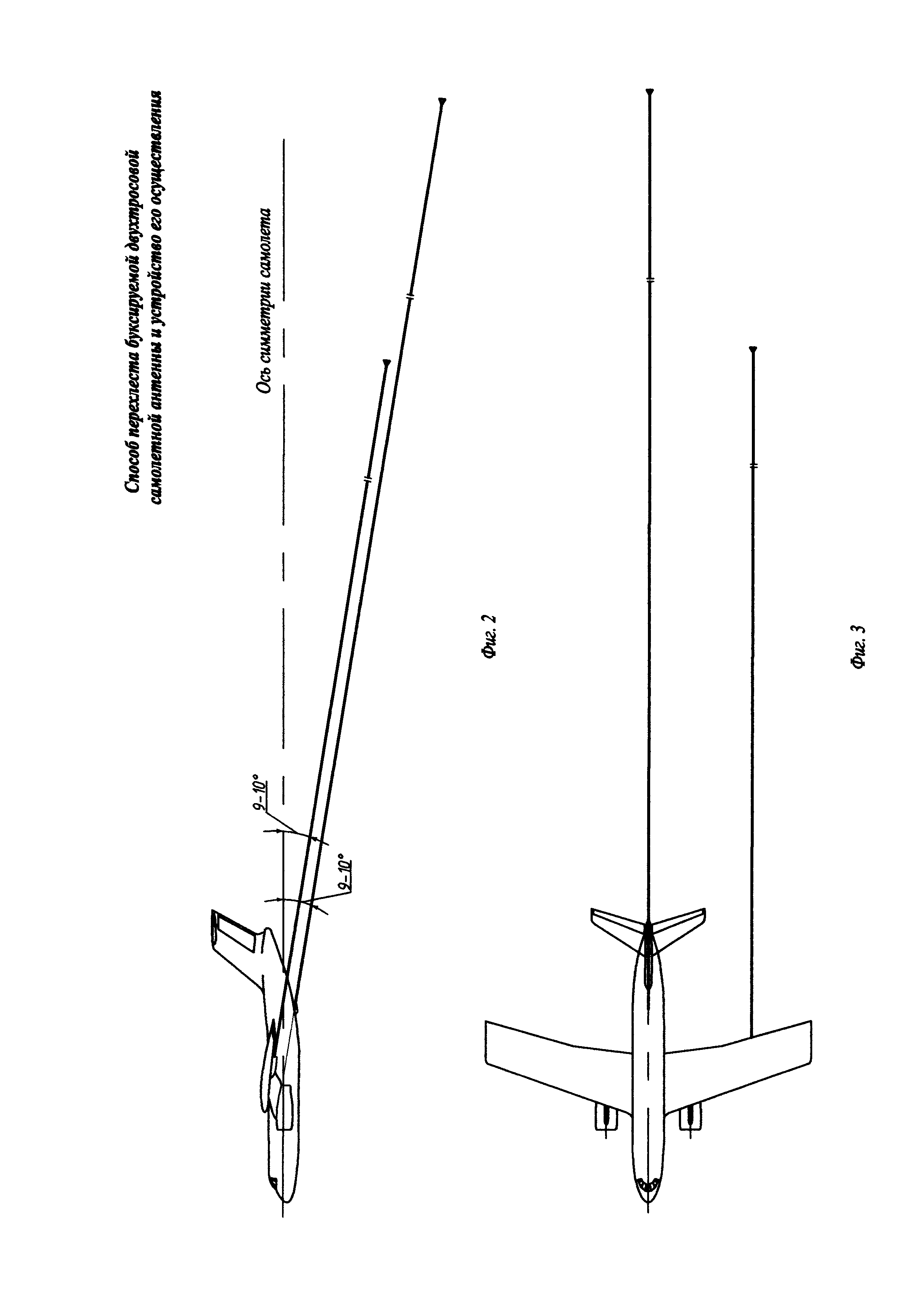 Изобретение относится к области авиации, а именно к осуществлению сверхдальней связи (СДВ - диапазона) с использованием антенны большой протяженности. Известно, что в ВМФ РФ (СССР) эксплуатируется самолет ТУ-142 MP, в нижней части фюзеляжа которого установлен барабан с выпускной буксируемой антенной большой протяженности (https://ru.wikipedia.org/wiki/ Связь_с_подводными_ _лодками). Также известен самолет Е-4А, созданный на базе самолета Боинг-747 (США), буксирующий тросовую антенну длиной около 8 км (https://ru.wikipedia.org/wiki/ / Связь_с_подводными_лодками). Применение на аналогах однотросовой антенны не позволяет полностью обеспечить всевозрастающие требования потенциальных заказчиков, вследствие чего возникает необходимость дальнейшего совершенствования антенных устройств. В связи с развитием и дальнейшим совершенствованием средств сверхдальней связи наметилась тенденция к использованию двухтросовой антенны, которая позволяет расширить технические возможности применения СДВ-диапазона. Наиболее близким техническим решением, выбранным в качестве прототипа, является самолет США Б-6В "Меркурий", который имеет антенную систему, состоящую из основного троса, выпускаемого из центральной части фюзеляжа и имеющего длину 7925 м и груз массой 495 кг, и вспомогательного троса длиной 1219 м, выпускаемого из хвостового обтекателя самолета и служащего в качестве диполя (фиг. 1). На концах тросов имеются стабилизирующие аэродинамические конусы массой 41 кг. Благодаря наличию груза массой 495 кг, длинный трос в режиме дежурства самолета располагается в пространстве близко к вертикальному положению (~50°÷60°) (www.pentagonus.ru/load/zhurnaly//zvo/zarubezhnoe_woennoe_obozrenie_11_2008/56-1-0158). Одной из важных проблем, влияющих на надежную работу буксируемой антенны, как механизма, является перехлест тросов двухтросовой антенны, образование которого зависит от следующих причин: - влияния направления свивки прядей тросов и их увод от плоскости движения самолета-буксировщика вследствие проявления "эффекта Магнуса" при обтекании витых тросов набегающим потоком; - отклонения поперечного сечения тросов от кругового вследствие деформации при прохождении через поворотные шкивы механизмов выпуска и уборки и последующего смещения сдеформированных сечений относительно друг друга в зависимости от вытяжки тросов под воздействием нагрузки от массовых и аэродинамических сил; - маневрирования самолета-буксировщика антенны по курсу и тангажу (Издательский отдел ЦАГИ. Обзоры, №489, 1976 г. «Тросовые системы в потоке жидкости», стр. 2). У прототипа эта проблема решается при помощи почти полутонного груза, разводящего тросы на удаление друг от друга с упомянутыми выше недостатками: увеличением веса и аэродинамического сопротивления антенны. Решая задачу расширения арсенала технических средств в данной области техники, предлагается вариант двухтросовой антенны, в котором длинный трос размещен в нижней части фюзеляжа, а короткий - под одной из консолей крыла самолета-буксировщика (фиг. 2, 3). Такая компоновка двухтросовой антенны не предполагает применения груза в 495 кг, как у прототипа, а ограничивается применением двух аэродинамических грузов массой по 45 кг. Это позволяет иметь некоторый выигрыш в массе антенны и ее аэродинамическом сопротивлении по сравнению с прототипом, поскольку буксировка тросов антенн произв