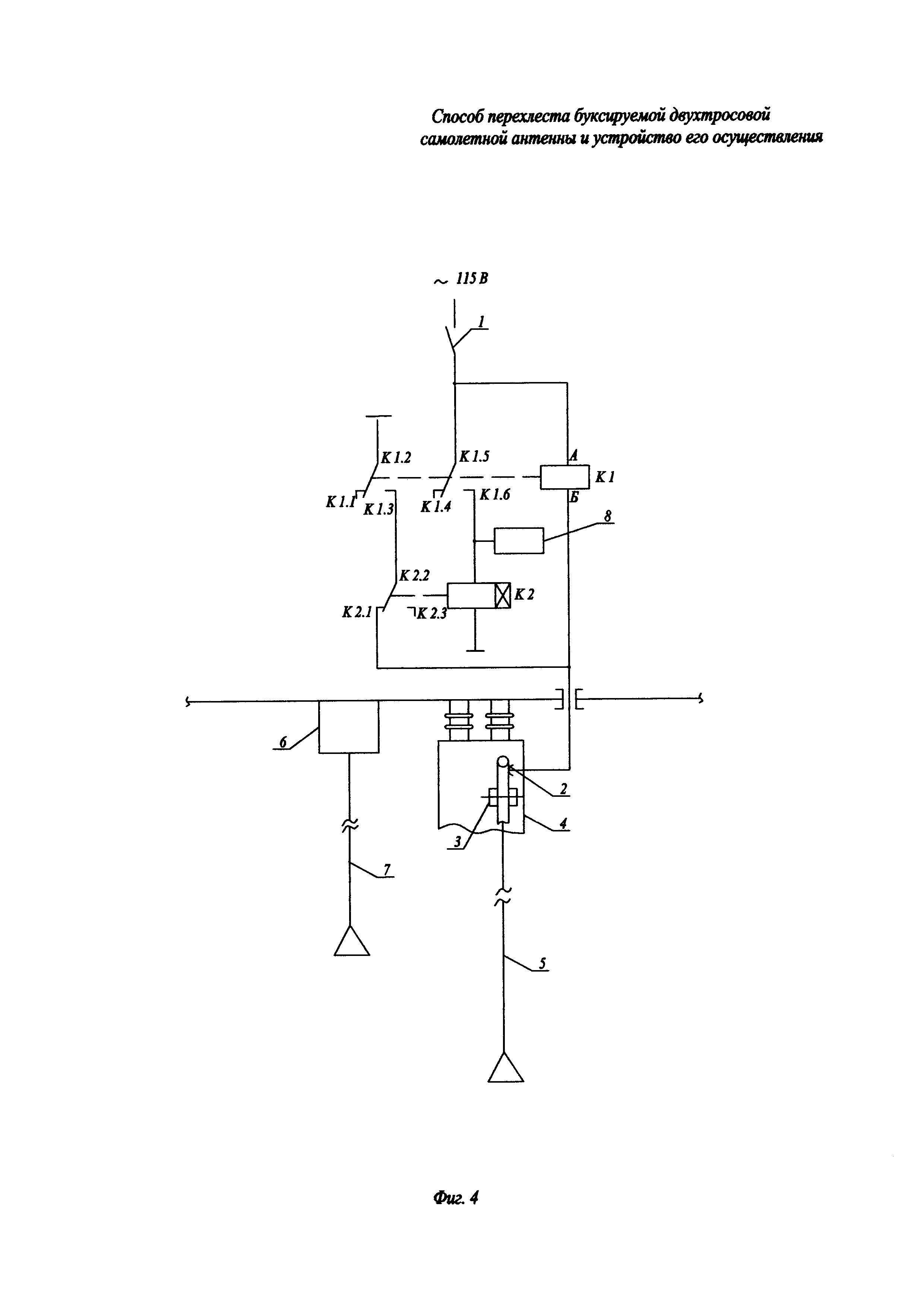 , которые определяются программой испытаний, вплоть до режимов полета, предполагающих перехлест тросов. В случае перехлеста тросов антенны возникает замыкание цепи, которое будет зарегистрировано специальным устройством, принципиальная схема которого изображена на фиг. 4.