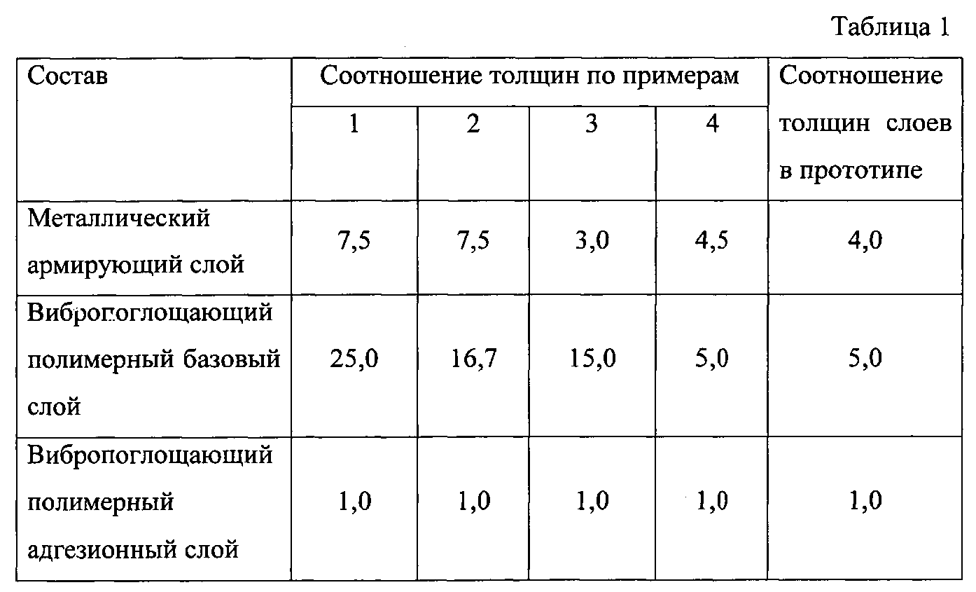 1. Композиционный вибропоглощающий материал, содержащий армирующий металлический слой, полимерные вибропоглощающий и адгезионный слои, отличающийся тем, что армирующий металлический слой выполнен из алюминиевого сплава, вибропоглощающий слой выполнен из термопластичного полиуретана на основе простого полиэфира с молекулярной массой свыше 1000, а адгезионный слой выполнен из полимерного материала с температурой стеклования, лежащей в области от -50°C до -20°C. 2. Композиционный вибропоглощающий материал по п. 1, отличающийся тем, что полимерный адгезионный слой состоит из материала, выбранного из группы: полисульфидный герметик, клеевая композиция на основе бутадиен-нитрильного каучука, клеевая композиция на основе полиуретанового каучука, клеевая композиция на основе кремнийорганического каучука. 3. Композиционный вибропоглощающий материал по п. 1, отличающийся тем, что соотношение толщин армирующего, вибропоглощающего и адгезионного слоев составляет (3,0÷7,5):(5,0-25,0):1,0.