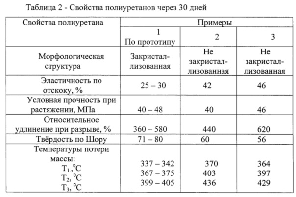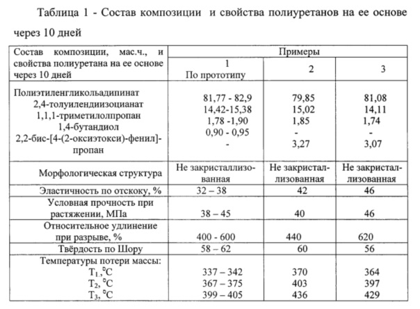 Полиэтиленгликольадипинат с молекулярной массой 1850 79,85 1,1,1-триметилолпропан 1,85 2,2-бис-[4-(2-оксиэтокси)-фенил]-пропан 3,27 2,4-толуилендиизоцианат 15,02. Полиэтиленгликольадипинат с молекулярной массой 81,08 1,1,1-триметилолпропан 1,74 2,2-бис-[4-(2-оксиэтокси)-фенил]-пропан 3,07 2,4-толуилендиизоцианат 14,11.