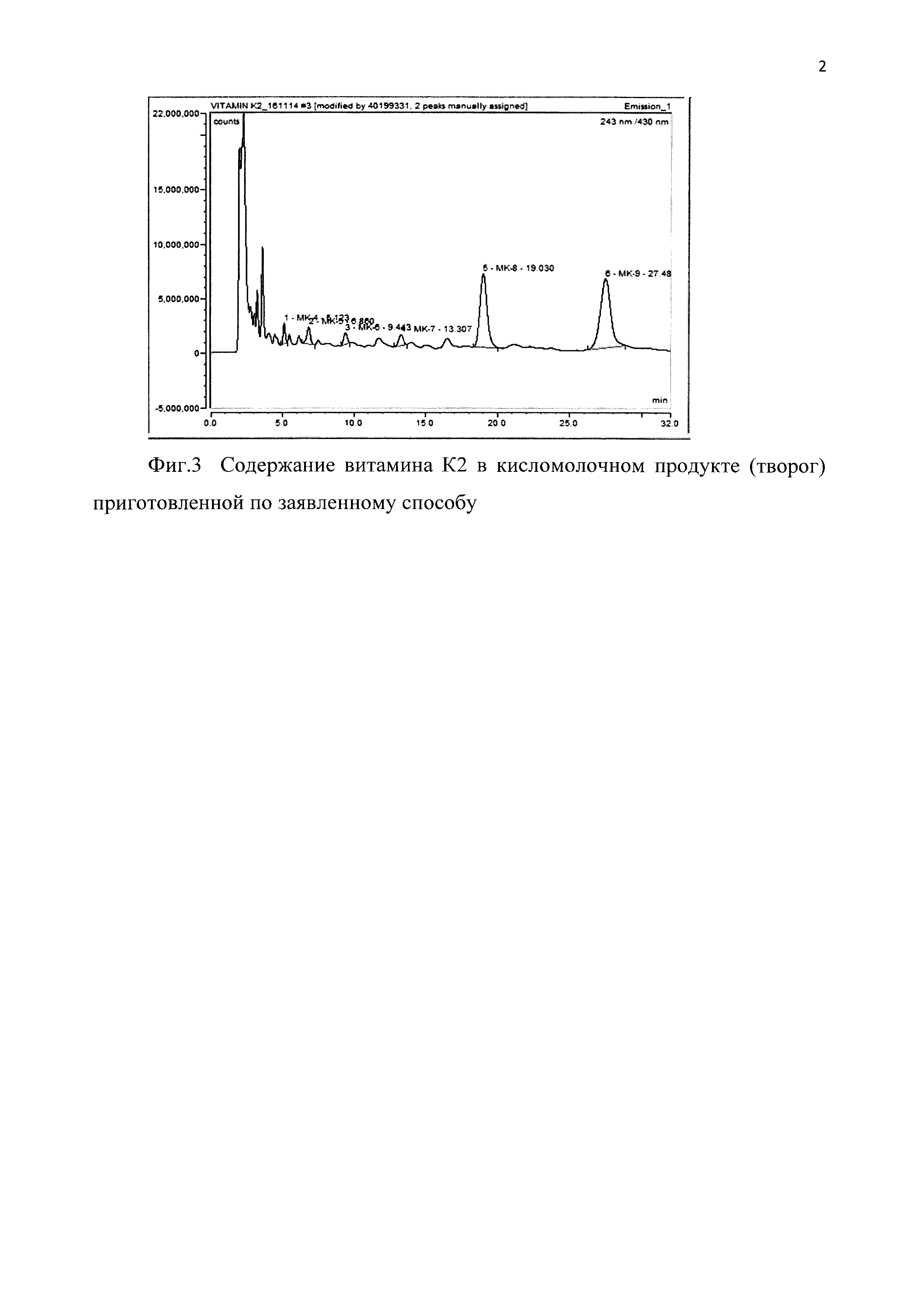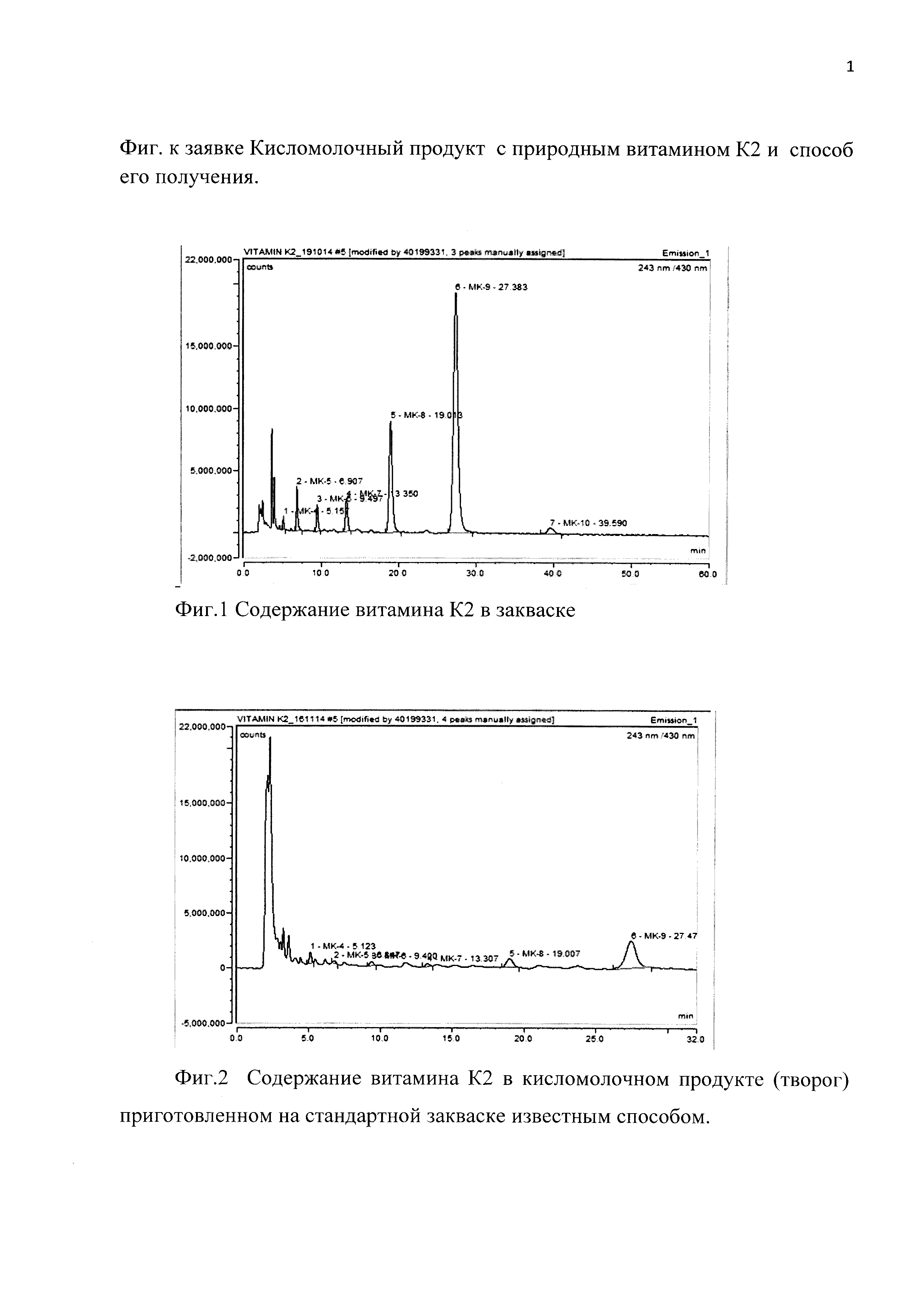 Область техники. Изобретение относится к пищевой промышленности и может быть использовано при производстве кисломолочных продуктов, обогащенных природным витамином К2, в частности, при производстве творога, творожного сыра, простокваши, кисломолочных напитков и других продуктов, в том числе для детского питания. Уровень техники Витамин K является жирорастворимым витамином, который встречается в двух естественных формах: витамин K1 (или филлохинон) и витамин K2 (или менахинон). Кроме природных витаминов К, в настоящее время известен ряд производных нафтохинона, которые получены синтетическим путем, наиболее известен витамин К3 (или менадион) (Lamson et al., 2003). Витамин K1 синтезируется растениями. Наиболее богаты витамином K1 зеленые листовые овощи, которые дают от 50 до 800 мкг на 100 г пищи. Также витамин K1 содержат зеленые томаты, плоды шиповника, листья шпината, капуста (брюссельская и цветная), крапива, хвоя, овес, соя, рожь, пшеница. Травы, богатые витамином К1: люцерна, зеленый чай, ламинария, крапива, овес и пастушья сумка. Значительно меньше содержится витамина К1 в корнеплодах и фруктах. Из пищевых продуктов наиболее богатое содержание этого витамина в печени свиньи, яйцах. Следует помнить, что, несмотря на то что витамин К1 находится в широком спектре овощной пищи, тем не менее, поскольку витамин является жирорастворимым, для того, чтобы его усвоение осуществлялось нормально (неважно, является ли он продуктом деятельности бактерий или получен с пищей), в кишечнике должно быть немного жира. Что касается витамина K2, он продуцируется бактериями кишечной флоры. Он также продуцируется в небольших количествах в некоторых пищевых продуктах в результате процесса брожения (сыр, традиционные азиатские продукты, такие как японские мисо и натто, приготовленные на базе сои, подвергнутой брожению, и т.д.). Витамин K2 могут синтезировать многие бактерии. Так, помимо бактерий кишечной флоры и, более конкретно, видов Escherichia coli, Bacillus subtilis и Bacteroides spp., можно назвать некоторые виды или подвиды молочнокислых бактерий, такие как Lactococcus lactis spp. lactis, Lactococcus lactis spp. cremoris, Leuconostoc lactis, Leuconostoc mesenteroides и Propionibacterium sp. Количество витамина K2, синтезированного этими бактериями, обычно варьирует примерно от 29 до 90 мкг/л сквашенного молока (Morishita et al., 1999). Важно отметить, что экспериментальные работы по получению витамина K2 чаще всего проводят на базе лиофилизатов клеточной массы, и результаты этих экспериментов демонстрируют значительную неоднородность уровня выработки К2 в зависимости от тестируемых штаммов, уровень которого может варьироваться от однократного до более чем трехкратного (Morishita et al., 1999; Parker et al., 2003). Сейчас известно, что большинство бактерий синтезируют ограниченное количество нафтохинонов, у которых одинаковое 2-метил-1,4-нафтохиноновое кольцо, но которые отличаются по длине боковой изопренной цепи, расположенной в 3 позиции, которые обычно содержат 5-13 прениловых юнитов (по 5 углеродов в каждом). Эти вещества известны как длинноцепочечные МК, или МК-n, где n - кол-во прениловых юнитов. Молочнокислые бактерии Lactococcus lactis spp. Cremoris продуцируют больше всего МК-8 и МК-9. В 1943 г. А.В. Палладии и М.М. Шемякин синтезировали дисульфидное производное 2-метил-1,4-нафтохинона (витамин К3), получившее название викасол, который применяется в медицинской практике в качестве заменителя в