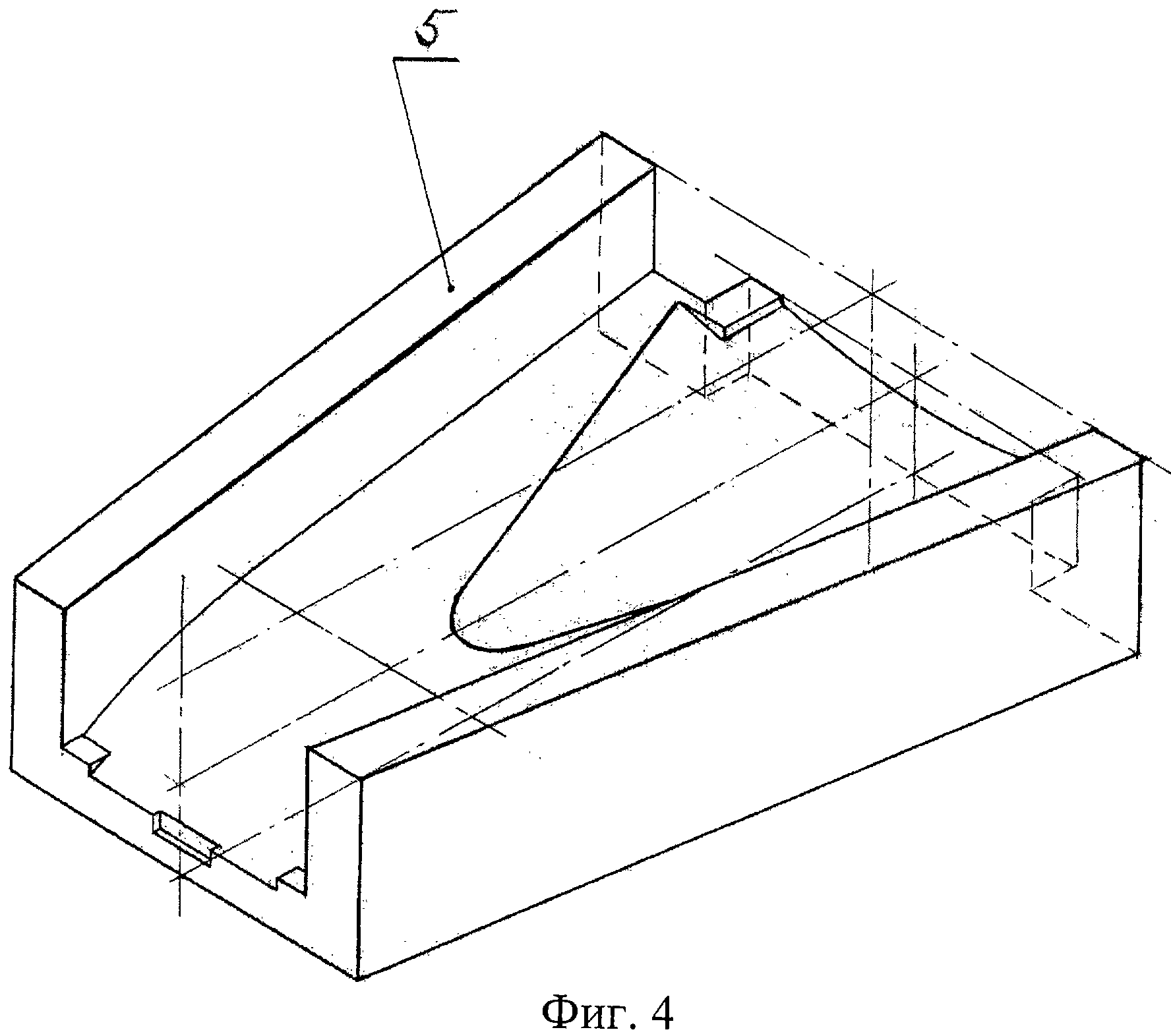 слепка аналогична операциям для изготовления первого слепка (подразумевается технология изготовления: выкладка нескольких слоев препрега, вакуумирование и отверждение, обработка, сушка). Полученный второй слепок 2 используют в качестве эталона для изготовления эталонного слепка 5. Второй слепок 2 устанавливают в предварительно изготовленную подставку 3 из винипласта и